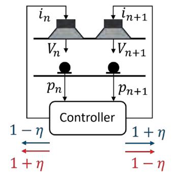 Chapter Mimicking quantum tunnelling using programmable active acoustic metamaterials A A A In a recent pilot study, researchers report a peculiar tunnelling phenomenon that occurs in acoustical systems with non-reciprocal couplings, which can open new opportunities for controlling the propagation of sound waves in ducts and other acoustical waveguides. By Felix Langfeldt and Joe Tan, Institute of Sound & Vibration Research, University of Southampton, and Lea Beilkin and Sayan Jana, School of Mechanical Engineering, Tel Aviv University Tunnelling is a phenomenon in quantum mechanics. It allows particles to pass, with a certain probability, through a barrier that would be impenetrable for the particle according to classical mechanics. Known phenomena include, for example, tunnelling of relativistic particles through energy barriers of arbitrary heights and widths in graphene and other structures, across the event horizon of black holes, through superconducting junctions, and more. Translating this exciting property into the acoustic realm holds the potential to substantially advance waveguiding capabilities in acoustical systems. In the project Active acoustic metamaterials for non-Hermitian sound propagation phenomena inspired by quantum mechanics, funded by the UK Acoustics Network’s third funding call, the team of scientists from the University of Southampton and Tel Aviv University derived and experimentally demonstrated a new form of a tunnelling-like phenomenon for sound waves through a non-Hermitian barrier. Non-Hermitian physics refers to non-conservative systems that interact with the environment. One of the underlying mechanisms of these systems is non-reciprocity. The wave propagation through such non-reciprocal systems is usually amplified in one direction and attenuated in the other, which is known by the non-Hermitian skin effect. Above: Figure 1: Schematic representation of the active acoustic metamaterial setup that was derived and studied during the project. The drawing on the left shows the overall setup with several active unit cells (grey) embedded in the wall of an acoustic waveguide. Each unit cell consists of two loudspeakers and two microphones (right). A programmable controller allows to change the parameter η that determines the strength and direction of the system’s non-reciprocity Design of the active acoustic metamaterial For studying the behaviour of sound waves propagating through a non-Hermitian acoustic system, the team designed a one-dimensional waveguide with an array of loudspeakers, microphones, and controllers (see Figure 1), forming an active acoustic metamaterial. Metamaterials are periodic structures composed of engineered unit cells that are smaller than the wavelength and by carefully designing the properties of the unit cells and including active elements like loudspeakers and microphones, the behaviour of sound waves propagating through the metamaterial can be tailored towards a desired response. The key to realising non-reciprocity in this system lies in the control parameter η, shown in Figure 1, which determines the degree of non-reciprocity in each part of the metamaterial. In the left half (blue arrows), the weaker coupling (1-η) is in the left direction and the stronger coupling (1+η) is in the right direction. The couplings are mirrored about the centre of the metamaterial. As a standalone system, each half of the system supports the non-Hermitian skin effect, in which modes are accumulated at the boundary of the weaker coupling. However, in the project the team investigated what happens to a wave that propagates along the array and hits the interface. The skin mode accumulation, which effectively constitutes a barrier, forbids wave penetration into the interface, but surprisingly, under certain conditions the wave is transmitted to the other side, keeping the interface dark, as if the wave invisibly tunnelled through it, as illustrated in Figure 2. Remarkably, the tunnelling is independent of the interface length. Time-domain finite element method simulations were used to verify the tunnelling effect in a continuous acoustic system as shown in Figure 1, investigate the impact of the electroacoustic properties of the loudspeakers and how they are driven on the tunnelling performance, and explore possible approaches for re-programming the control laws to achieve different tunnelling strengths or even different non-Hermitian sound propagation effects. To verify the numerical results, the team then built an experimental demonstrator (see Figure 2), which consists of an array of nine loudspeakers and microphones and a digital controller. The experimental results confirm the tunnelling phenomenon, and demonstrate the re-programmability of the system by modifying the control law on the digital controller for each unit cell, e.g. to study different non-reciprocity strengths η. Above: Figure 2: Experimental setup for demonstrating the quantum tunnelling effect realised using the active acoustic metamaterials developed in the project. This photograph shows the rectangular duct with an array of nine loudspeakers attached to the top wall of the duct, representing the active metamaterial unit cells. The colour map along the centre of the duct is a computer-generated overlay created using a simulation model, illustrating the tunnelling of a sound wave through the metamaterial Applications This pilot study uncovered how an interesting tunnelling phenomenon can be realised for acoustic waves using active acoustic metamaterials. This can lead to a range of possible useful applications, e.g. to realise quiet zones in acoustical systems or tunnel sound waves through obstacles for sensing applications. The theoretical, numerical, and experimental framework that was developed in the project will enable further research on this specific phenomenon, e.g. to study the stability of the control laws, extend the concept to higher dimensions, or investiga