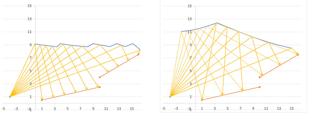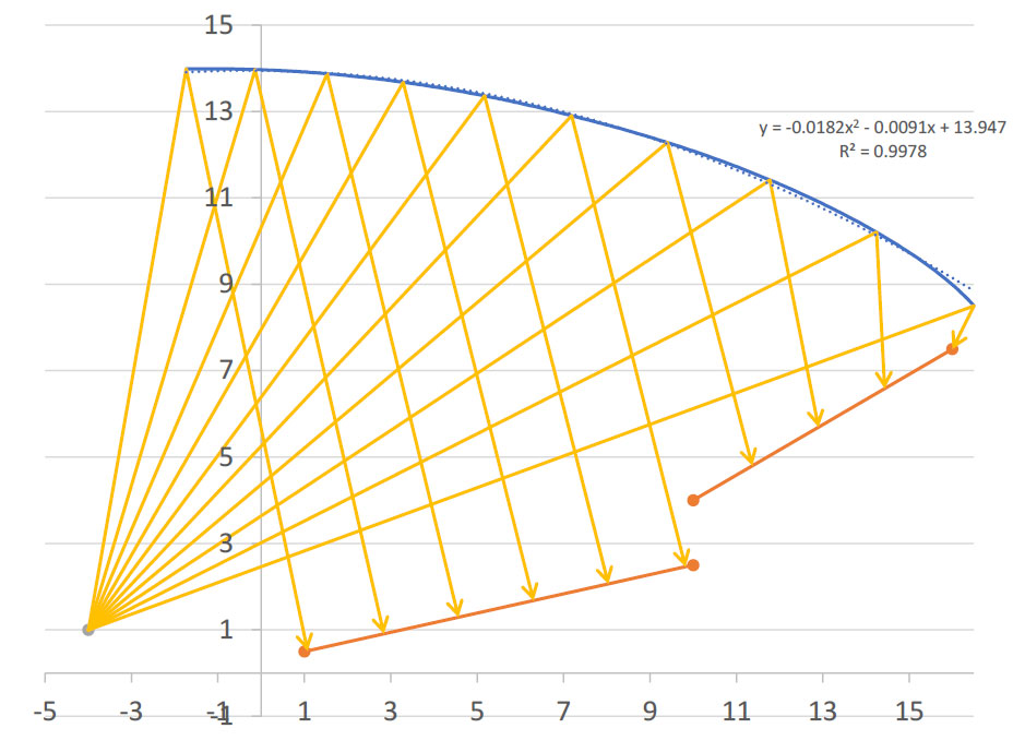 A A A Volume : 45 Part : 2 Proceedings of the Institute of Acoustics Early reflector geometry optimization methodology A. Galatas, ACC Acoustics Consultancy Company, Greece K. Dadiotis, ACC Acoustics Consultancy Company, Greece 1 INTRODUCTION It is well known that adding early reflections in auditoriums raises the apparent loudness of the direct sound in a comfortable, natural way, much more agreeable than turning up the volume. The denser the early reflections, the better a person can hear. Reflectors in concert halls are vital to the quality of the sound that reaches the audience. Roof reflections can give a very unique and characteristic sound profile in a closed space . In this paper a methodology to design the geometry of roof and/or side surfaces to evenly distribute the early reflections to the audience is presented. Through this methodology, an algorithm is developed to generate the acoustic shell by calculating the ideal curvature and the orientation of the surfaces for this purpose, while also retaining given geometric properties and constraints. 2 GEOMETRY OF REFLECTIONS In closed spaces the perceived sound level can be substantially increased compared to free field conditions, since sound energy is redirected to the audience due to reflections. As the sound waves that travel into the air encounter higher impedance obstacles, like walls and ceilings, part of the sound energy bounces back to the room causing a lower amplitude sound wave to travel in the opposite direction. When these reflections reach the ear very shortly after the initial sound wave, they are not perceived as new sound, but as an enhancement of the direct sound. The main part of the reflected energy, according to the law of reflections, will form a sound wave that will have the same angle of reflection as the angle of incidence, whereas the angles are measured relative to the perpendicular to the surface at the point where the wave strikes the surface. A simple model for simulating sound propagating from a speaker inside an auditorium would be to consider the source as a ray that travels in the room and reflects on its sound-reflective surfaces (surfaces that minimize the absorbed and diffused energy) to reach the audience and the audience as a vertically offset surface from the floor at the seating area. Figure 1: visualisation of law of reflection In two dimensions, the problem of finding the curve that will uniformly distribute the first order reflections to the audience, is formed by the givens of a point that is the sound source ( 𝑥 𝑠 , 𝑦 𝑠 ) and of a curve that represents the audience - points ( 𝑥 𝑟 (𝑡) , 𝑦 𝑟 (𝑡) ) -. The task is to find the curve (ceiling for vertical 2D-sections, walls for horizontal 2D-sections) composed by points ( 𝑥 𝑐 (𝑡) , 𝑦 𝑐 (𝑡) ): Figure 2: properties of points on reflector curve 3 ANALYTIC SOLUTION Setting an infinitesimal change in angle 𝜃 , the next point at the reflector curve is consider still lying in the perpendicular of the bisector of the incident and the reflected ray. When there is a known point on the reflector curve, the above differential equation can be solved numerically for 𝑥 𝑐 . The other coordinate, 𝑦 𝑐 , is then calculated by: 4 METHODOLOGY AND ALGORITHM The differential equation derived in the previous chapter can easily be numerically solved by implementing an algorithm, especially when the angle 𝜃(𝑡) step is linear, therefore the term 𝜕𝜃/𝜕𝑡 is constant. A linear step corresponds to evenly distributed reflected areas to the target region. Solutions for vertical mid-axis cross-sections of a typical small auditorium and of a larger concert hall composed of two seating areas, are shown in figures below. Figure 3: resulting reflector curve for vertical mid-axis cross-section of a typical small auditorium Figure 4: resulting reflector curve for vertical mid-axis cross-section of a concert hall composed of two seating areas The figures displayed in the previous page show rays casted at evenly distributed angles which are reflected to equidistance intervals at the seating areas, hence proving the accuracy of the algorithm. Two important conclusions can easily be derived from the results: a) the resulting height for a single continuous curve to act as a reflector for all of the audience is very high and not feasible for construction, especially for small to medium auditoriums, and b) each curve fits extremely well to the shape of a parabola, which seems sensible considering the reflecting property of the focus of parabolas when casting rays parallel to their axis (although the focus point of the curve-fitting parabola in this case has nothing to do with the source point). To undertake the height issue, non-continuous surface solutions can be sought, i.e. a break can be issued every time the reflector height exceeds a certain height. In order not to lose purposeful surface for reflections, the endpoints of sequential reflector surfaces should lie on a plane passing through the source point. The implementation of the above to the algorithm is shown in the figures below: Figure 5: non-continuous surface solution for Figure 3 case Figure 6: non-continuous surface solutions for Figure 4 case The same technique can be used for the side walls: Figure 7: resulting reflector curve and rays for side walls in concert hall The concept can be applied to three dimensions, where polar vertical cross-sections around the source point are solved and the results are combined to form a surface mesh for the ceiling reflector: Figure 8: resulting surface mesh by combining algorithm’s results from multiple vertical sections 5 DISCUSSION As shown, the proposed algorithm delivers vital tools for taking meaningfully into account the acoustics during early stages of auditorium design, by providing methods to generate or check the geometry regarding its ability to generate the beneficiary early reflections. The