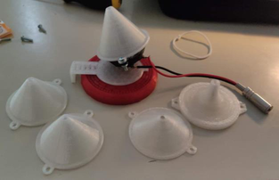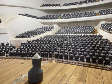 A A A Volume : 45 Part : 2 Proceedings of the Institute of Acoustics Development of an omnidirectional source for acoustical scale-model measurements E. Larochelle, Ecole Centrale de Lille, Lille, France; Sorbonne Université, Paris, France; Kahle Acoustics, Brussels, Belgium V. Berrier, Kahle Acoustics, Brussels, Belgium T. Wulfrank, Kahle Acoustics, Brussels, Belgium E. Green, Kahle Acoustics, Brussels, Belgium Y. Jurkiewicz, Kahle Acoustics, Brussels, Belgium 1 INTRODUCTION Scale model measurements enable wave-effects such as diffraction, interference effects and the seat-dip effect to be analysed, acoustical aspects which are challenging to simulate using geometrical acoustics computer models. At full scale, the most commonly used omnidirectional sources are dodecahedrons, but these are problematic at common acoustical model scales such as 1:50, 1:20 or even 1:10 because of the necessary equivalent size of the loudspeakers. Based on the research of Jean-Dominique Polack1 and Nikolaos M. Papadakis2, this paper describes the development of an omnidirectional source for scale model measurements using an inverted cone- shaped horn driven by a single loudspeaker. In order to optimise the omnidirectional performance, the geometrical parameters of the cone, such as the aperture width, height and curvature of the cone walls, were initially optimised using BEM simulations, and then via several stages of prototyping using 3D printing. 2 SOURCE DESIGN AND OPTIMIZATIONS 2.1 Shape of the source and loudspeaker selection Based on the research of Leishman3 and Tarnow4, it is shown that the omnidirectionality of polyhedral sources is reduced at high frequencies above fcut-off = k*a where k is the acoustic wave number and a the effective radius. At 1:20 scale, a cut-off frequency of 30 kHz (equivalent to 1.5 kHz 1:1 frequency) results of an effective radius of less than 1cm, which is much too small for the integration of cone loudspeakers. As an alternative to polyhedral sources, a solution utilizing a single larger speaker attached to an inverted cone-shaped horn sound source has been tested at scale 1:1 by J.D. Polack1 and N.M. Papadaksi2 and gave good results regarding omnidirectionality. Due to the tapering of the horn, the loudspeaker used for the source can be bigger than the polyhedral requirements, so this concept has been chosen as a starting point for the scale model source. For our scale model measurements, the requirement to carry out measurements on a 1:20 scale model requires the loudspeaker to emit at frequencies from 2 kHz to 60 kHz (equivalent to 100 Hz to 3 kHz full scale). To achieve this, piezoelectric ultrasonic tweeters with a diameter of 50mm were chosen. Two different tweeters with the exact same sizes were tested and gave sufficient signal level but not a flat response, one from Pofet (see Figure 1), the other one from Meetoot. The variation in frequency would be equalized with signal processing, and so the main criterion was that the loudspeaker could generate sufficient sound level. Figure 1: POFET ultrasonic piezoelectric tweeter selected for the source. In terms of omnidirectionality, the aim was to comply with the maximum deviations defined in the standard ISO 3382-16.6. 2.2 First prototypes and analysis of omnidirectionality To design the inverse horn attached to the loudspeaker, a parametric 3D-model using the modelling software Rhinoceros with Grasshopper was created. The solution is similar to the work of Ibarra 5 but here applied to measurements of 1:10 to 1:20 scale models rather than the full-scale cones presented in that research. The first four pavilions resulting from the modelling experiments were 3D-printed (Figure 2) with different opening sizes, shapes, and heights. Figure 2: Four prototypes 3D-printed (left) and the omnidirectionality testing bench (right). Figure 3: Polar plot of the directivity measured for the horn with an aperture radius of 1 mm (left), and deviation of directivity compared to the standard ISO 3382-1 (right). Figure 4: Polar plot of the directivity measured for the horn with an aperture radius of 4 mm (left), and deviation of directivity compared to the standard ISO 3382-1 (right). The directivity of each horn was measured and compared to the maximum authorized deviation of directivity given by the standard ISO 3382-1 (two examples are shown in Figure 3 and Figure 4). To meet the requirements of the ISO standard, the sound pressure level as been measured at 10cm from the source with an omnidirectional microphone (corresponding to 2 meters at full-scale), every 5°, and averaged by “gliding averages”, each covering six neighbouring points. To simulate an anechoic chamber, the sound source and microphone were placed away from other surfaces in the room (at least 2 meters from walls, floor and ceiling), and a sufficiently short time window was used to avoid the reflections from the nearest surfaces and keep only the direct sound. The acquisition system consisted of the following elements: a DPA 4060 microphone for the recording, an external RME Fireface UC sound card, and an ART SLA-1 amplifier. The directivity has been measured for frequencies from 2.5 kHz to 40 kHz (1:20 scale), that corresponds to frequencies from 125 Hz to 2 kHz at full-scale. It is shown that the horns with a smaller radius of aperture (1mm or 2mm) gave promising results for omnidirectionality, but pavilions with a large aperture radius (3mm or 4mm) showed excessive deviations of directivity compared to the standard. For the next steps only aperture radii under 2mm were therefore considered. 2.3 Optimization of the cone shape using BEM analysis To optimize the omnidirectionality of the source while reducing the number of prototypes to be manufactured, a Boundary Element Method (BEM) analysis was carried out, first by comparing the measurements of the 3D-printed horns with the BEM simulation results (Figure 6). The measurements and BEM simulations were sufficientl