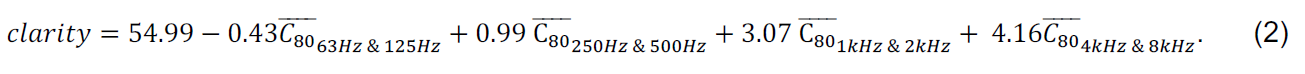 A A A Volume : 45 Part : 2 Proceedings of the Institute of Acoustics The importance of the high frequencies of clarity index for the perception of musical clarity F. del Solar Dorrego, Graduate Program in Acoustics, The Pennsylvania State University, University Park, Pennsylvania, USA M. C. Vigeant, Graduate Program in Acoustics, The Pennsylvania State University, University Park, Pennsylvania, USA 1 INTRODUCTION The seminal work conducted by Wallace C. Sabine at the turn of the XXth century [1], provided acousticians with the first set of scientific rules to predict a specific aspect of the acoustics of a room, its reverberation time (T30). Sabine’s work was limited to the study of reverberation and its subjective counterpart, reverberance, but more recent findings highlighted the fact that other perceptual aspects are important for the appreciation of room acoustics besides reverberance. The importance of the temporal structure of sound fields for the perception of clarity of speech and music, was highlighted by a series of studies conducted in the 1950s and 1960s [2] [3] [4]. The clarity index metric (C80) was proposed as an objective parameter that can quantify the degree of musical clarity in a sound field, based on the early-to-late ratio of sound energy in the room impulse response (RIR) [4]. Clarity index is a well-established metric and has been included in the Annex A of the ISO 3382-1 standard [5], along with other metrics derived from the RIR. However, there is little information of which octave bands of C80 have more influence on the perception of musical clarity. In the past, recommendations on how to average different octave bands of C80 to obtain a value better correlated with the perception of clarity have been proposed [5] [6] [7], but these recommendations have often been made without sufficient scientific validation. The purpose of the present study was to propose a weighted average of the octave-band values of C80 , called a single-value frequency-averaged metric (SVFA), to obtain a metric better correlated with perceived musical clarity. 2 PREVIOUS RESEARCH ON PREDICTORS OF CLARITY Starting in the decade of 1950, a series of studies conducted in Germany analysed the effect of sound reflections on the appreciation of the acoustic character of speech and music signals. A general analysis of the influence of the delay and relative amplitude of sound reflections on the perceived acoustics, was undertaken by Thiele [3], who highlighted the importance of “useful” reflections, associated with the early sound, versus “detrimental” reflections associated with the late sound. Reichard and Kussev [4] set the integration value for the useful reflections at 80 ms after the direct sound, based on the observation of the duration of musical notes and transients of musical instruments. The C80 metric was defined as the ratio of the energy of the RIR up to 80 ms, and the energy of the sound reflections after 80 ms, in decibels. Several studies have proposed averaging schemes for the different octave-band values of C80 that are better correlated with perceived clarity. Soulodre and Bradley [8] conducted a subjective study in which they evaluated the correlations between different combinations of the octave band values of C80 and musical clarity. In their investigation, the highest correlation with musical clarity was found for the average of the 500 and 1000 Hz octave band values of C80. Beranek [6] and Barron [7] recommended, without rigorous scientific validation, that averaging the values of the 500, 1000, and 2000 Hz octave bands of C80 yields a metric, C80(3), that has a high correlation with musical clarity. Barron [7] justifies this operation since the human ear has a low temporal resolution for frequencies below 500 Hz. The ISO 3382-1 standard [5] proposes the average of the 500 and 1000 Hz octave band values of C80 to obtain a SVFA measure that is better correlated with musical clarity. More research is needed to elucidate the dependency of musical clarity upon the different frequency ranges of C80. The present work proposes a SVFA of C80 that can better predict musical clarity based on a subjective study using realistic auralizations of concert hall acoustics. 3 EXPERIMENTAL OVERVIEW The investigation presented in this paper is separated into three tasks. The first task, Task 1, was designed to obtain a regression model that can predict subjective ratings of clarity from the octave band values of C80 of an arbitrary RIR measured in a hall. The stimuli used in Task 1 were composed of a base case spatial room impulse response (SRIR) extracted from a database of concert hall acoustics measurements [9] [10], which was computationally modified to obtain an additional set of stimuli with specified values of C80 in different pairs of octave bands. Since changes in C80 were made in individual pairs of octave bands, Task 1 will be referred to as the “one-factor-at-a-time” (OFAT) task, since each factor (pair of octave bands) was modified individually. Task 2, referred to as the “validation task”, consisted of the validation of the regression model obtained in Task 1. Seven SRIRs, corresponding to a representative sample of seven halls from the same database used in Task 1, were used as the stimuli. These SRIRs were rated by the subjects in terms of perceived clarity, and the obtained ratings were compared with those predicted by evaluating the regression formula obtained in Task 1 with the C80 octave band values of these halls. In Task 3, a correlation analysis was performed between the ratings of clarity of the seven halls used in the validation task (Task 2) and their octave-band C80 values. The purpose of the correlation analysis was to further assess the level of association between the different frequency ranges of C80 and the perception of clarity in the acoustics of concert halls. A direct scaling method was selected to quantify the sensory impression. The su