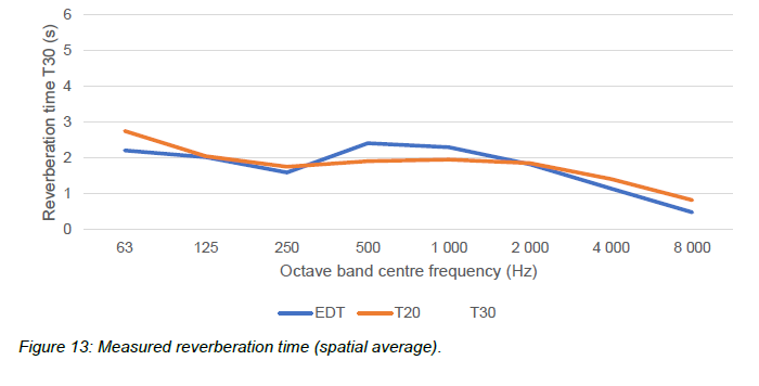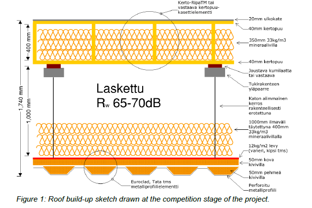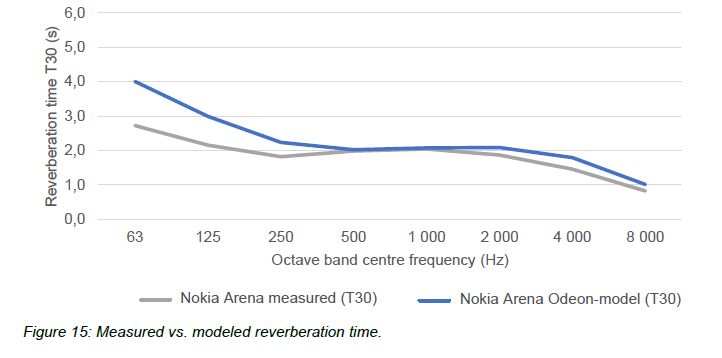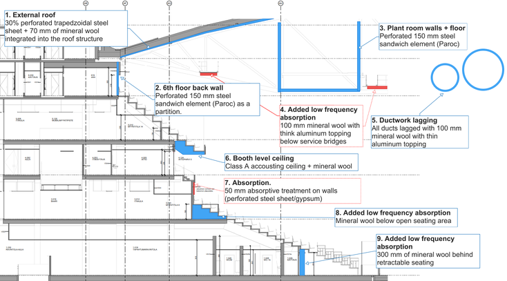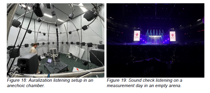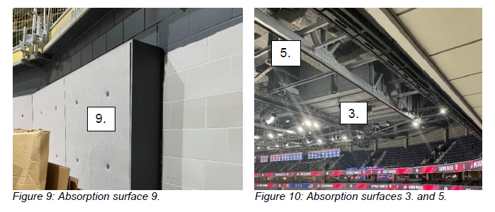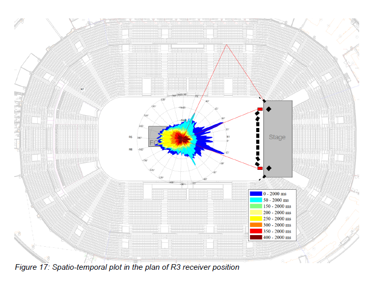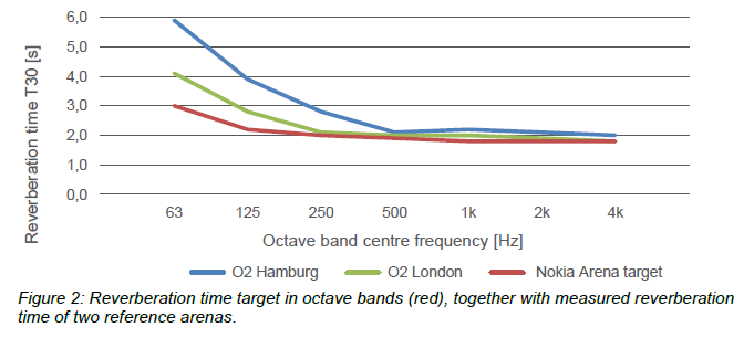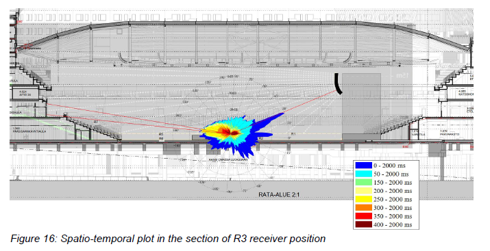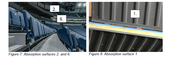 A A A Volume : 45 Part : 2 Proceedings of the Institute of Acoustics Room Acoustic Design of a 15 000-Capacity Multi-Purpose Arena P Laukkanen Akukon Ltd., Helsinki, Finland J Riionheimo Akukon Ltd., Helsinki, Finland J Pätynen Akukon Ltd., Helsinki, Finland H Penttinen Neural DSP Ltd., Helsinki Finland 1 INTRODUCTION Nokia Arena is a 15 000-capacity multipurpose Arena located in Tampere, Finland. The Arena was designed and built on top of a major railway line between 2015 and 2022. Within the same project, a hotel and two mixed-use towers were built on the same deck. The Arena is used for many types of events such as ice hockey, commercial fairs, and various music events. This paper concentrates on the music use of the venue, which was the driving use scenario for most of the room acoustic design decisions during the project. So far, the feedback from the audience and mixing engineers has been positive when it comes to the room acoustics of the venue. The paper presents the room acoustic design process of the multipurpose arena and the results of acoustic commissioning measurements of the finished Arena. Measurement results are compared to the design criteria as well as room acoustic measurements of similar international Arenas. Based on the measurement results, the relationship between subjective observations and objective measurements is discussed. Finally, the key lessons learned are summarized. 2 PRIOR RESEARCH ON ARENA ROOM ACOUSTICS Arena room acoustics have been studied over the years based on room acoustic measurements, computer modeling, and subjective experience on achieved acoustics2,3,4. Early research has typically been limited to individual case studies of certain Arenas and individual conclusions based on one space. The first and presumably the largest study, where different venues have been compared to each other, is by Niels Adelman Larsen from 2005-20101. Adelman Larsen’s research includes measurements and assessment of room acoustics of 55 venues, from which around 15 are comparable to Nokia Arena, in terms of use profile and volume or capacity. According to Adelman Larsen1, the most important room acoustic criterion for large pop/rock venues is the reverberation time at low frequencies, T 60 at 125 Hz octave band being the most important octave band. Other conclusions from Adelman Larsen1 include that there should not be disturbing late reflections that can be heard as echoes. In his book, Adelman Larsen also discusses the importance of stage acoustics and how musicians should get sufficient feedback from the hall to be able to feel the same acoustic climate as their audience. Based on his research, Adelman Larsen gives a recommendation for reverberation time for large indoor venues as a function of room volume. 3 ACOUSTIC DESIGN OF THE NOKIA ARENA 3.1 Room acoustic considerations in the competition stage The author gave acoustic design advice for the (winning) competition entry already before the project fully started. Alongside the sound insulation of the building envelope, the room acoustic characteristics of the roof build-up were identified as critical for the success of the acoustics of the Arena. In terms of surface area, the roof/ceiling is the largest individual surface in indoor Arenas, and hence it is important to be able to integrate as much absorption into the ceiling as possible. Figure 1 shows a roof build-up sketch drawn for the competition entry, where the designed room acoustic element was a perforated steel sheet with mineral wool backing. 3.2 Target criteria As soon as the project concept design started, room acoustic criteria were set based on Adelman Larsen1 recommendations. The reverberation time target was set to 2 seconds at mid frequencies and to 2,2 seconds at 125 Hz, respectively. These were based on Adelman Larsen's recommendation for 150 000 m 3 Arena. In addition to reverberation time targets, the brief specified that no individual audible echoes shall occur. Figure 2 shows the reverberation time target of Nokia Arena, together with the measured reverberation time of O2 Hamburg (500 000 m3, 16 000 capacity) and O2 London (400 000 m3, 20 000 capacity)1. 3.3 Room acoustic modelling Room acoustic Odeon model was built at an early stage of the design process. The key finding from the early Odeon modelling was, that the roof/ceiling itself won’t be able to provide enough absorption at low frequencies, and additional surfaces had to be sought where low-frequency absorption could be integrated. 3.4 Roof/ceiling construction Figure 3 shows the implemented final roof build-up from 2021. For building-physics-related reasons there was a limit in the mineral wool thickness that could be integrated into the underside of the roof element. The absorption performance of the final roof build-up was measured in a reverberation chamber. Based on the absorption data of the final roof build-up, the amount of additional absorption was calculated, and integrated into the architectural design of the Arena. Multiple locations for added (low frequency) absorption were found. These are discussed in more detail in the next section. 3.5 Designed absorption surfaces Figures 4-8 show the absorption surfaces with additional absorption. Surface (4) was not implemented in the end due to a low effect compared to price and installation challenges. Absorption surface number (7) was not implemented, as it was found architecturally difficult to fit together with the rear seat row. This was, however, identified as a big risk in causing/boosting a specular reflection that could be audible as an echo. This assumption was subsequently confirmed with audible reflections projected to some parts of the flat floor area. This effect is discussed in Chapter 4. Based on the final Odeon modelling, the absorption surfaces that were included in the final design were not quite sufficient to meet the reverberation time criterion at low frequencies. This was accepted by the client as th
