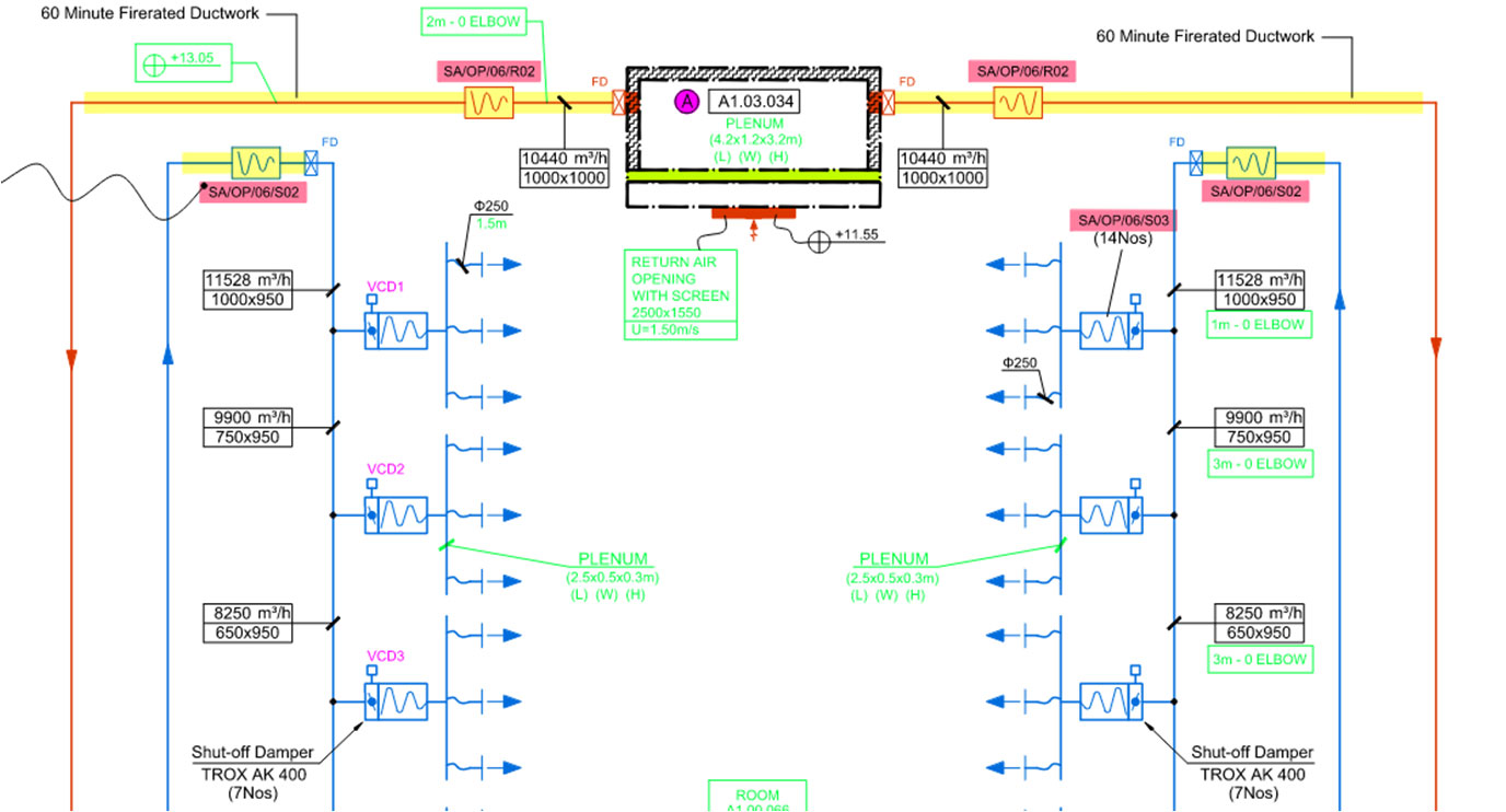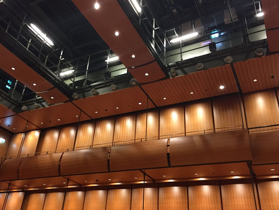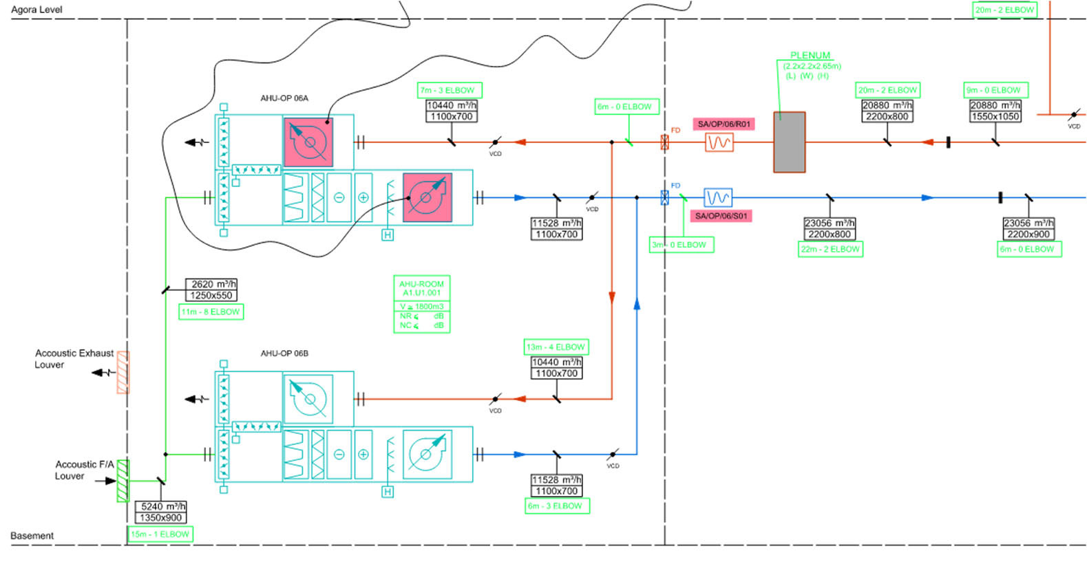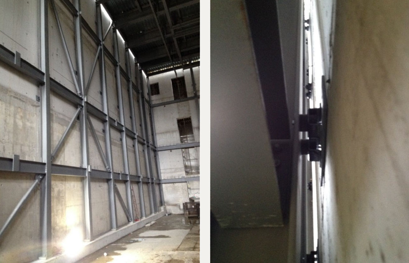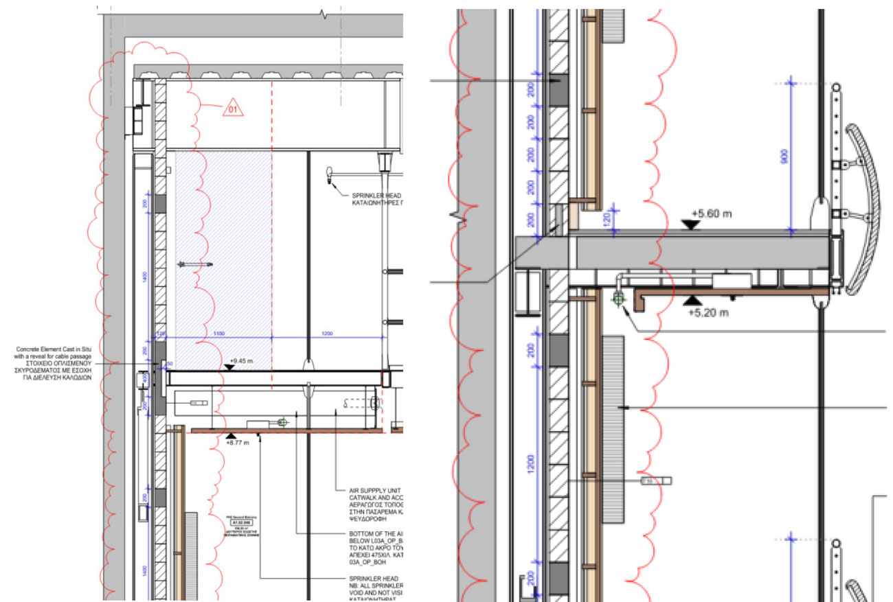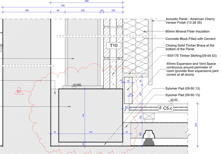 A A A Volume : 45 Part : 2 Proceedings of the Institute of Acoustics Sound isolation and HVAC noise control: Design versus practical challenges and constructibility Rachid Abu-Hassan, Arup Acoustics, New York, USA Andy Guthrie, Arup Acoustics, San Francisco, USA Alban Bassuet, Arup Acoustics, New York, USA Raj Patel, Arup Acoustics, New York, USA Ryan Biziorek, Arup Acoustics, New York, USA 1 INTRODUCTION Opened in 2017, the new Stavros Niarchos Foundation Cultural Center (SNFCC) is one of the largest cultural projects recently realized in Europe. The vast and ambitious development is a cornerstone of continued urban renewal and regeneration, as well as a progressive 21st Century investment in cultural infrastructure for Greece to share knowledge, culture, and the presentation of the performing arts. Its success is in many ways a symbol of the revitalization of the country after its period of crisis, playing a major role in the economic, cultural and sociological development of Athens and of the country. The opera house building facility is a compact building, which includes challenging adjacencies between loud and noise sensitive performance and rehearsal spaces, that resulted in innovative noise and vibration control mitigations. In this paper, we aim to present practical and constructability challenges for sound isolation and HVAC noise control through two case-studies developed for the 480-seat Alternative Stage. The first addresses the feasibility of constructing the full concrete box-in-box around the Alternative Stage, and offers practical solutions through early contractor engagement, and an understanding of construction sequencing. The second investigates the role of aerodynamics and materiality through testing, in order to achieve a low background noise in the space with high diffuser face velocity. Concrete Box-in-Box: The main challenge in this space was the question of how and when to pour the concrete roof slabs of a box-in-box in a cast-in-situ building. On one hand, accessing the formwork of the outer box is impossible if the roof slab of inner box is already in place. On the other hand, it is not possible to pour the roof slab of the inner box, if the outer box slab has already been poured. Early contractor engagement, clear mapping of the construction sequencing, and close collaboration with the structural engineer resulted in a hybrid metal deck / flat slab solution ensuring the feasibility and integrity of the box-in-box for the Alternative Stage. Air-Distribution and Low Background Noise: Design guidance and standard practice for low noise ventilation systems require extremely low air velocity throughout the system. However, in cases requiring long-air-throws, low diffuser face-velocity is not possible. Turning the attention to aerodynamics, materiality, and diffuser wall friction made it possible to achieve the specified low background noise with excessively high diffuser face velocity. 2 CASE-STUDY #1: CONCRETE BOX-IN-BOX 2.1 Criteria & Design Challenges Not surprisingly, given its proximity to the Opera Theatre, the Dance School, and Rehearsal Spaces, the Alternative Stage at SNFCC required a full box-in-box construction. However, design constraints, spatial limitations, and overall technical systems required a rethinking of the typical box-in-box construction, and a close collaboration with the Project’s Structural Engineers. The box-in-box structure had to accommodate for the following, while maintaining the integrity of the sound isolation: Catwalks and performance equipment trusses, all suspended from the ceiling. Wrap-around gantries and two balcony levels, accommodating close to a third of the overall audience capacity, supported off the walls. While the outer box was namely cast-in-situ concrete, the inner box was comprised of the following separate components, (illustrations on Figure 1 and 2): Floating concrete floor: A 200-mm normal weight concrete slab on top of 6-mm deflection neoprene pucks. The concrete floor floated within an independently isolated perimeter concrete beam. Isolated perimeter concrete beams: 400x340-mm concrete beams on 25-mm continuous neoprene pads, running the entire perimeter of the Alternative Stage, separated from the outer box by a 50-mm continuous neoprene pad, and separated from the floating concrete floor by a 50-mm acoustically-sealed isolation joint. Inner box steel structure: A steel structure comprising of steel columns, cross-bracing, and beams sat onto of the isolated perimeter beams, 90-mm away from the outer box with neoprene bracing. Concrete loaded metal deck: A corrugated metal deck topped with 150-mm concrete. Inner CMU block walls: 120-mm 75% solid CMU block walls were built on top of the concrete perimeter beam in front of the inner box steel structure. This design approach allowed for a fully contained, fully independent, box-in-box with little compromise. The inner box steel box and the isolated perimeter concrete beams were designed specifically to carry entire load of the Alternative Stage, including the walls, ceiling, balconies and gantries, catwalks, and the performance equipment trusses. By incorporating the perimeter concrete beams and inner steel structure into the design, we were able to free the floating concrete floor from excessive perimeter loads, and eliminate inner ceiling / wall penetrations for structural loading. Figure 1: Floating Floor and Perimeter Beam Detail Figure 2: Details of steel structure loading and inner box ceiling 2.3 Site Challenges & Contractor Collaboration Given the design described above and its various components, successful execution onsite required the contractor to fully embrace the design, work with us collaboratively to overcome site challenges, and most importantly to outline a clear construction sequence and methodology in which the various components can be built/installed. One key challenge with regards to sequence of construction was the question of the inne