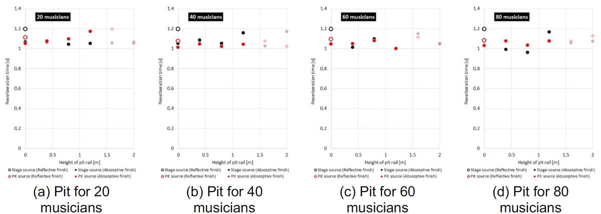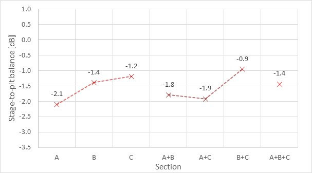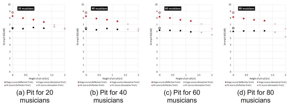 A A A Volume : 45 Part : 2 Proceedings of the Institute of Acoustics Improvement of stage-to-pit balance in a small multi-purpose hall with open style pit SE Jeon Pusan National University, Busan, South Korea YH Kim Youngsan University, Yangsan, South Korea 1 INTRODUCTION The sound quality of a music venue has a major impact on both the performers and the audience1. This is particularly important in opera houses or classical concert halls, where natural sound is used without the use of electrical sound, and the influence of architectural sound is important2. When designing an opera house, there are design criteria such as 1.3 s to 1.8 s reverberation time3, 2.5 m depth of the proscenium4, and ensuring acoustic/visual intimacy2. Another critical design factor is the balance of sound levels between the singers on stage and the orchestra in the pit5. In an opera house, the singers on stage and the orchestra in the pit work together to create sound. However, because the sound power levels of the singers and the orchestra are very different, it is difficult to work together if one side is too loud. Therefore, studies have been conducted on stage-pit balance to control the volume of these sounds. In the previous studies, Barron considered the appropriate range of balance to be 0.9 dB to 4.5 dB6 and Sato et al. suggested a range of -2.0 dB to +2.3 dB7. In most cases, the sound of the orchestra in the pit is much louder than that of the singer8. It is therefore essential to control the sound of the orchestra in the pit to control this balance. Since an ordinary opera house has the shape of a covered pit, the size of the opening of this pit controls the sound of the orchestra in the pit. However, there are some cases where a small or medium-sized multipurpose hall is not large enough to accommodate a covered pit. Therefore, in the case of such a concert hall, the performance is performed without an orchestra pit, and currently, the sound of the performer is so loud that the sound of the singer is often drowned out. Figure 1 shows an example of a small multipurpose hall with an open pit for opera performances. Therefore, further research is needed to control the sound of the orchestra with architectural acoustics. This paper investigates architectural treatments to improve stage-to-pit balance using computer simulation in a medium-sized multipurpose hall without an orchestra pit. A 1,500-seat hall with a poor stage-to-pit balance of -2.6 dB due to its open-style environment was selected as shown in Figure 1, and the simulation model hall was reproduced by acoustic verification based on the field measurement results. To improve the stage-to-pit balance, architectural treatments such as changing the floor material, installing pit rails, and installing reflective panels on the ceiling were considered to find the optimum shapes to improve the stage-to-pit balance. Figure 1: Example of a small multi-purpose hall with an open-style pit for opera performances 2 MATERIALS AND METHODS 2.1 A hall with an open-style pit for simulation modelling A medium-sized multi-purpose hall with an open pit was selected for simulation evaluation. The target hall was approximately 1,500 seats, with a rectangular floor plan and a second-floor rear balcony. Figure 2 shows the interior views of the target hall. Field measurements of room acoustic performance were taken to build the computer simulation model in accordance with ISO 3382-19. As the measurement results, it was found that the target hall had a reverberation time (RTmid-frequency) of 1.2 s, an early decay time (EDTmid-frequency) of 1.14s, a definition (D50,mid-frequency) of 54%, a clarity (C80,3B) of 3.3 dB, a lateral energy fraction (LFE4) of 0.18 from the stage sound source. Based on the measurement results, a simulation model was built as shown in Figure 3. Acoustic fitting of the computer simulation model was performed to ensure that the just noticeable difference9 (JND, relative 5%) of the reverberation time was within the range of the field measurements. Figure 2: Interior views of the target hall Figure 3: Computer simulation model with source and receiver position 2.2 Measures for the stage-to-pit balance The previous studies6,7 on the stage-to-pit balance have made subjective preference judgments for combinations of different source positions to investigate the relationship between acoustic parameters and subjective preferences. The stage-to-pit balance (B) can be defined as the G value on the stage minus the G value in the pit7. The balance was only assessed using the average G-value, but it is considered that the area that meets the minimum balance is also important. Since the volume in the orchestra pit is inherently louder than the singers' voices on stage, the balance value is prone to negative values. However, it is also not desirable to have too much volume on stage, so previous research has suggested a range of 0.9 dB to 4.5 dB6 or a range of -2 dB to 2.3 dB7. In this study, we set the recommended range suggested by Sato et al.7 as the target for balance improvement. The balance value measured on-site at the target space was -2.3 dB, indicating that the orchestra's loudness was largely transmitted to the audience due to the open environment with no pit rails installed. As a result, both singers and orchestra reported acoustic difficulties when performing small scale opera in this space. 2.3 Setting up an open-orchestra pit based on the performer size In general, the area of the opening of the covered pit and the covered area are important, but the design criteria of the open pit are different. In a covered pit, the minimum floor area of the pit should be at least 1.5 m2 per musician, but in an open pit, the minimum floor area of the pit should be 1.2 m2 per musician9. The number of performers was defined within the maximum number defined by Gade5. Figure 4 shows the position of the loudspeaker in the pit and on the stage, divided by size according