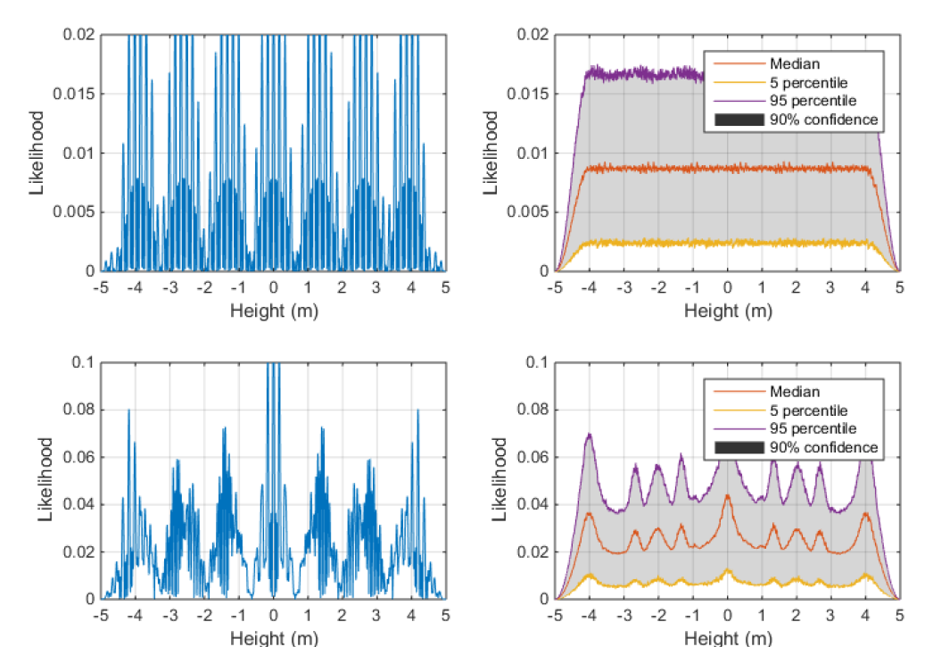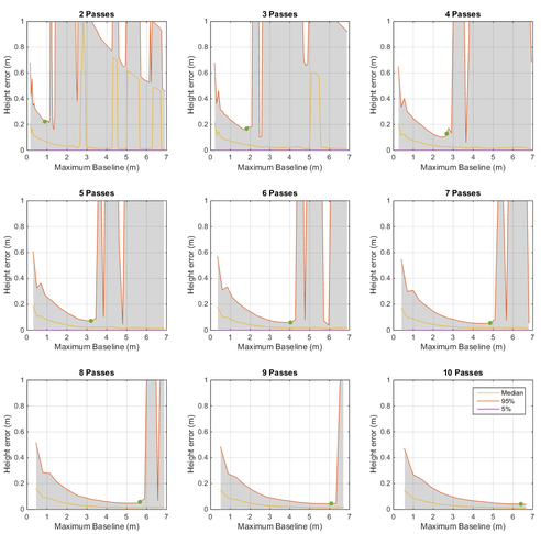 A A A Volume : 38 Part : 3 Proceedings of the Institute of Acoustics An investigation into optimal acquisition geometries for repeat-pass synthetic aperture sonar bathymetric mapping BW Thomas, Department of Mechanical Engineering, University of Bath, Bath, UK AJ Hunter, Department of Mechanical Engineering, University of Bath, Bath, UK 1 INTRODUCTION Synthetic aperture sonar (SAS) systems are able to generate two-dimensional images of the seafloor with resolution on order of a centimetre. This high resolution is achieved by coherent processing of the acoustic data collected from multiple pings along the path travelled by the sensor. It is desirable to achieve the same resolution in height for 3D mapping since 3D shape information is invariant to imaging geometry and may therefore improve the probability of classification of underwater objects. Traditionally this is achieved by interferometry, which uses two vertically separated arrays mounted on the vehicle. However, due to size constraints on typical autonomous underwater vehicles (AUVs), these arrays have a vertical separation limited to the order of several tens of wavelengths. This gives a resolution in the vertical direction on the order of tens of centimetres, which is significantly poorer than the 2D image resolution of a typical SAS. It has been shown in the synthetic aperture radar (SAR) literature1 that combining data from multiple passes using tomographic processing can improve resolution in elevation compared to interferometry between only two passes. Successful coherent co-registration of SAS images has been shown with timescales varying from hours to a few days2. Furthermore, tomographic imaging has been successfully demonstrated from a circular SAS system performing 9 passes of an interferometric array both at multiple heights and radii3. In recent work, repeat-pass interferograms were demonstrated over multiple passes from the CMRE MUSCLE AUV4, suggesting that repeat-pass SAS tomography is possible with this hardware. Carrying out repeated passes for high-resolution 3D tomography is time-consuming. Therefore, we wish to choose the optimal number of passes to achieve a desired resolution. To this end, we have used analytical and numerical models to simulate the expected height resolution as a function of the number of passes and the repeat-pass geometry. We intend that this information will be used to inform the planning of future 3D mapping missions. 2 3D TOMOGRAPHIC PROCESSING 2.1 Forward model In order to perform tomographic processing, multiple passes are made over a scene from slightly different positions, as illustrated in Figure 1. In the following, ‘π ’ is the elevation axis, ‘π’ is the range and ‘ππ’ is the orthogonal component of the baseline between some chosen reference pass and the ππ‘β pass. We make the assumption that for the range of elevations of interest, the elevation axis may be assumed straight. Figure 1: - Repeat-pass imaging geometry Figure 2: – Accumulation of images Tomographic processing is performed on the 2D images obtained by any standard SAS focussing method. Thus, a 3 dimensional stack π° of π images π°π is available for processing. The value π π of each pixel in these complex-valued images is given by the coherent sum of all back-scattering contributions along the elevation direction s. This complex backscattering function is termed πΎ(π ) . where πππ(π) is a phase term associated with the propagation velocity in the medium, π is the wavelength, πΌπ is the extent of the scene in the elevation direction, π(π ,π‘π) is the deformation affecting the scatterer at elevation s, and π€π is a noise term, accounting for thermal noise and decorrelation. In the following it is assumed that the medium propagation term is compensated for in a pre-processing image registration step, so the first term may be discounted. If the assumption of simultaneous passes is made such that there is no deformation term, then the tomographic equation is reached5: This equation is identical to the Fourier transform operator, allowing the problem to be posed as one of spectral estimation. πΎ(π ) may be seen as the spatial signal, with ππ being a spatial spectrum sampled with spatial frequencies ππ = −2ππ/(ππ). Discretising equation 2, and assuming the scattering is distributed over small elevation intervals within the range of elevations of interest, where π collects the values of a particular pixel over N passes as shown in figure 2, π(π ) is the steering vector representing the tomographic model; for pass π , π(π )π = π −π2ππππ /√π . The noise in each pixel is collected in the vector π. The problem may then be phrased as a matrix multiplication, where π¨ collects the steering vectors for all passes over the range of elevations of interest, and πΈ(π ) is the vector representing the complex back-scattering function over that range. 2.2 Inverse model The desired backscattering function πΈ(π ) may then be estimated by approximate inversion of the matrix π¨(π ), as in Equation 6. Since π¨(π ) is in general not a square matrix, in the classical beamforming methodology the Hermitian operator is used. For wide-band systems, the resolution may be improved by performing the tomographic processing at a range of frequencies, and computing the mean back-scattering function πΈΜ(π ), as in Equation 7. Under the assumption that only one dominant scatterer is present in each pixel stack, the elevation π§Μ of that pixel is approximated as the location of the maximum of its estimated backscattering function. The height of the peak is termed the ‘multi-acquisition coherence’ and gives a measure of the degree to which the estimate may be trusted. Finally, a 3-pixel square median filter is applied to the height estimates, which acts to reject outliers. Various alternative methods of spectral estimation have been presented in the liter