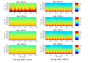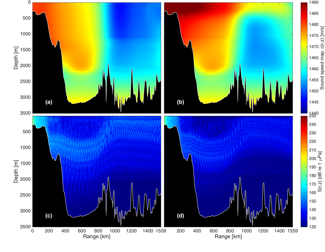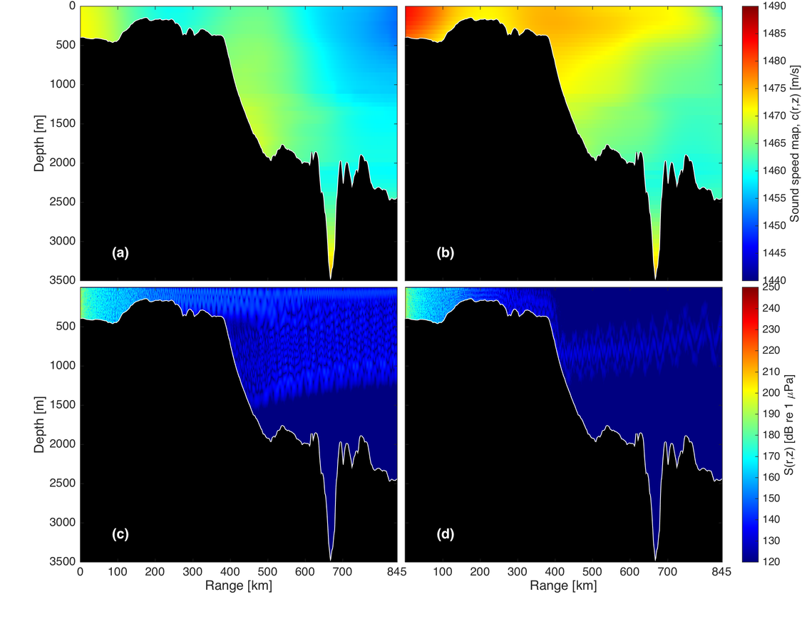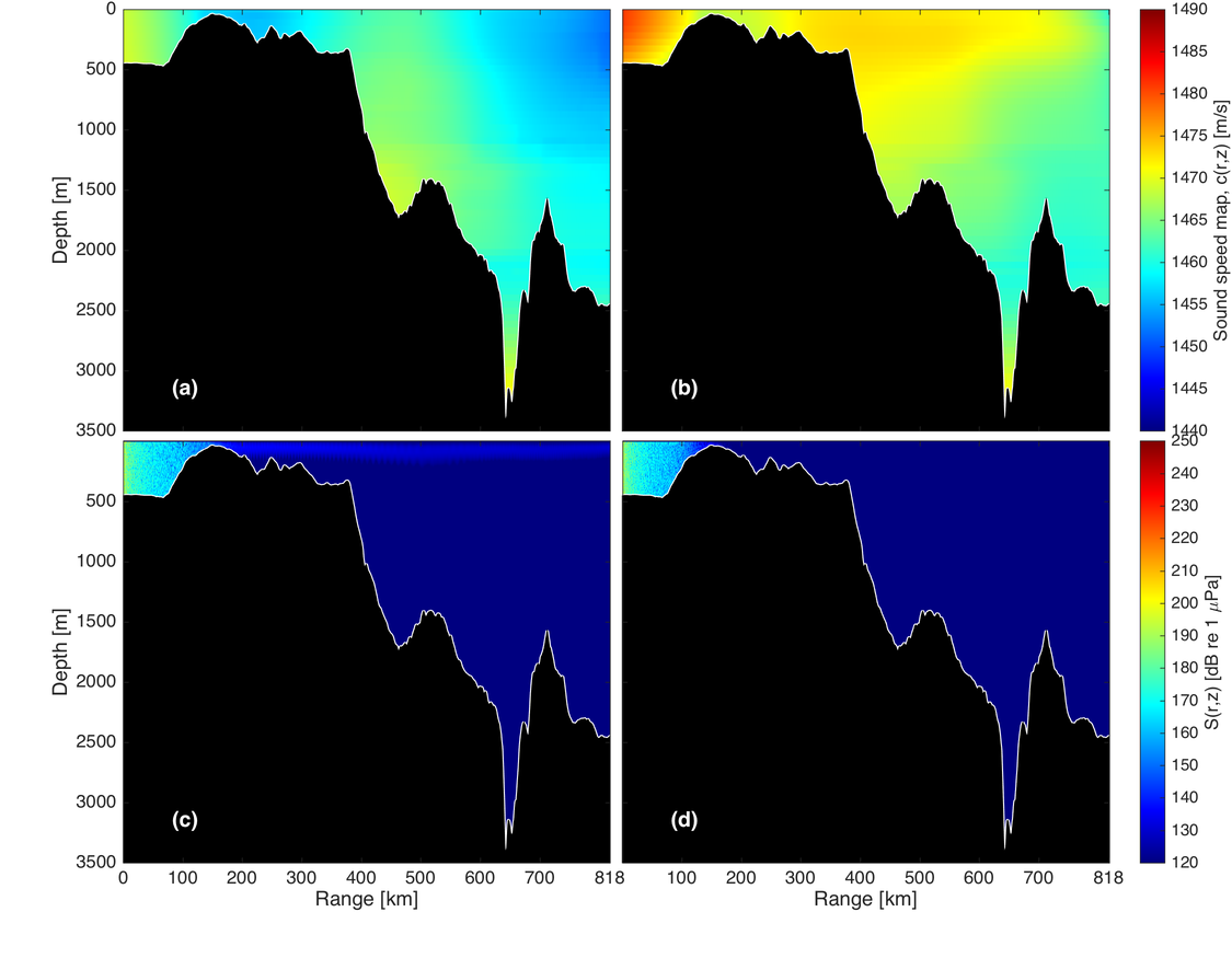 A A A Volume : 38 Part : 3 Proceedings of the Institute of Acoustics Impact of long distance propagated seismic signals on the soundscape in the Fram Strait: Use of ACOBAR data and PE modelling E. Storheim, Nansen Environmental and Remote Sensing Centre, Bergen, Norway A. Yamakawa, Nansen Environmental and Remote Sensing Centre, Bergen, Norway H. Sagen, Nansen Environmental and Remote Sensing Centre, Bergen, Norway G. Pedersen, Christian Michelsen Research AS, Bergen, Norway 1 INTRODUCTION The expected increase in anthropogenic noise in the Arctic, due to increased shipping and resource exploitation, may have a negative influence on the living conditions for marine life. The Fram Strait, and in particular the Marginal Ice Zone (MIZ), is a habitat for marine mammals and fish. It is therefore important to establish a soundscape baseline for this region, and to monitor the changes in the acoustic environment. One of the key components of anthropogenic sounds is that of seismic airguns, which are used in e.g. seismic surveys for oil and gas exploration, and to map the bathymetric profile and geological properties of the seafloor. These airguns often have a very high source level (SL), which, combined with low attenuation in water for the relevant frequencies, allows for long-range propagation of sound which retains a significant sound pressure level. Many simulation tools have been developed and used to study the influence of different parameters, such as bathymetry and variability in the ocean environment, on sound propagation1. For example, Tronstad & Hovem2 used ray tracing to investigate propagation of airgun signals over 10 km to 50 km long transects, with range-independent sound speed. The effect of a typical summer and a winter sound speed profile was shown, along with the effect of the bathymetry. Impact on marine life was also discussed. Thode et al.3 investigated airgun signals propagating in the Arctic Ocean, and the influence due to a changing ice cover. In this study, airgun signals were observed from 400 km to 1300 km. Tollefsen and Sagen4 observed airgun signals originating from the Norwegian Sea 1400 km away, during an experiment with sonobuoys to investigate the spatial variability of ambient noise in the MIZ. Measurements of the soundscape in the Fram Strait resulted from the ACOBAR5 ocean acoustic tomography experiment. Seismic airgun activity6 was observed in a significant amount of the hydrophone recordings made during the experiment. During this study, a seasonal variation in the vertical distribution of the sound was found. The objective of the present work is to analyse this behaviour, and to use simulation tools to illustrate how the sound propagation is affected by: 1) the bathymetry; and 2) the seasonal variability in the sound speed profile between summer and winter. 2 METHODS 2.1 Experimental configuration The experimental results presented here are obtained from the ACOBAR5 (Acoustic Technology for Observing the interior of the Arctic Ocean) acoustic tomography experiment. The project was designed to monitor the properties and transport of water masses to and from the Arctic Ocean through the Fram Strait. It was made up of four distributed vertical line arrays (DVLA), placed in the Fram Strait between Svalbard and Greenland, illustrated by the large black and red triangles in Figure 1. Recordings from mooring D are used in the present work. 8 hydrophones were distributed along the vertical mooring at design depths of 227.9 m, 323.9 m, 419.9 m, 515.9 m, 614.2 m, 710.2 m, 806.2 m, and 902.2 m. The sampling frequency is 1000 Hz, and recordings were made between 10 Hz and 500 Hz for 100 seconds, every third hour over two years. The measurement results shown in Section 3.2 are obtained from mooring D at two different dates: 1) 2011-02-22; and 2) 2011-07-19. 2.2 Simulation setup The 2D simulations of the transmission loss (TL) as a function of range, 𝑟, and depth, 𝑧, are performed using RAM7. A point source with unit amplitude and a 100 Hz frequency is placed at 10 m depth. The source radiates into lossless water with a flat water/vacuum interface at the top, and a semi-infinite, range-dependent bottom profile. The simulation results are shown in terms of the signal level S, given by the passive sonar equation as1 where SL is the source level. The source level used here is 250 dB re 1 µ Pa. The absorption in seawater is assumed to be negligible for the frequencies used here. The range-dependent sound speed profile is obtained from the 2013 World Ocean Atlas8 (WOA13), with a 1/4° resolution. The bathymetric profile is obtained from the International Bathymetric Chart of the Arctic Ocean9 (IBCAO). The material properties used for the bottom are: a longitudinal sound speed of 3000 m/s, a density of 1500 kg/m3 , and an attenuation of longitudinal waves of 1.5 dB/ λ. These parameters are for the present case set to range-independent. Three different transects are investigated in the following, from two regions: Two from the Barents Sea, denoted T1, and T2; and T3 in the Norwegian Sea, cf. Figure 1. These are selected based on the bathymetric conditions and the spatial variation in the sound speed profiles. The simulations are performed with a uniform spatial resolution of 𝛥𝑟 = 500 m in the horizontal direction, while the vertical resolution is depth-dependent. The profile is sampled every 5 m above 100 m, every 25 m from 100 m until 500 m, every 50 m from 500 m to 1000 m, and every 100 m below 1000 m. 3 RESULTS 3.1 Seismic surveys General information about seismic surveys in Norwegian territorial waters, such as the time period, region, and the size and number of airguns used, is available from the Norwegian Petroleum Directorate (NPD)10. Typically, most of the activity is performed in the summer time, due to e.g. poor weather or low-light conditions in the winter. For the present case, 6 different surveys were performed in the winter period, and 33 differen