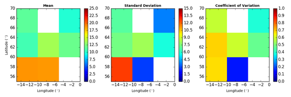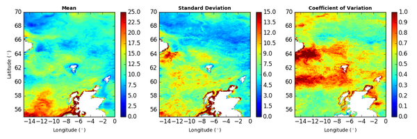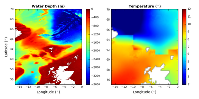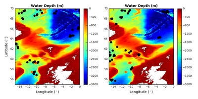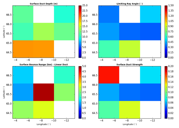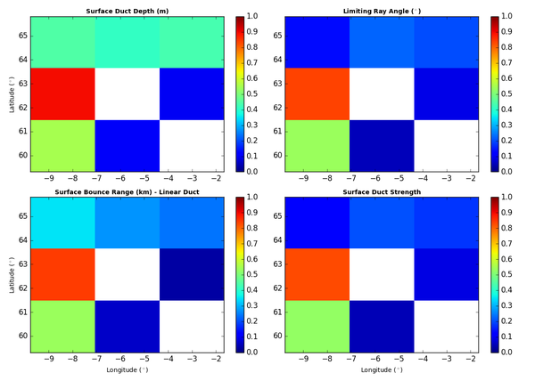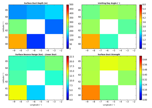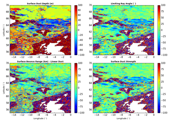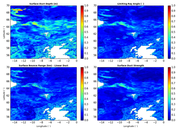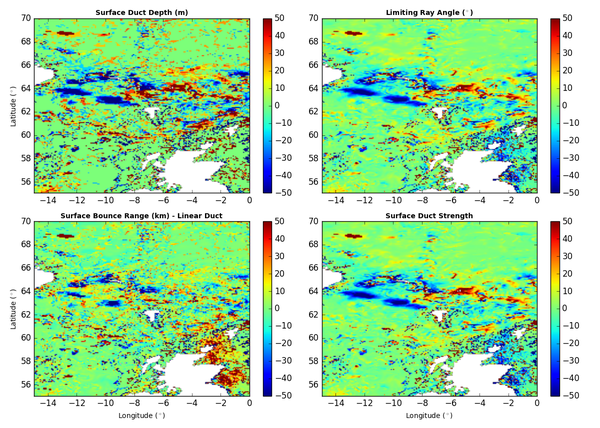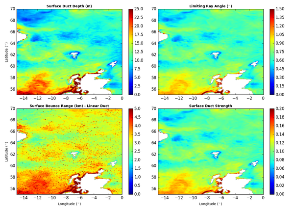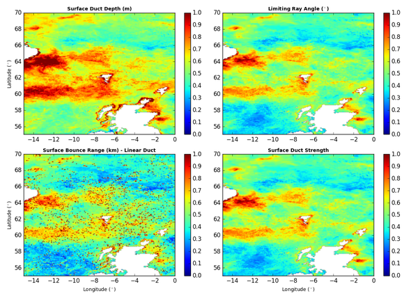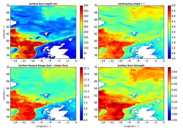 A A A Volume : 38 Part : 3 Proceedings of the Institute of Acoustics Investigating the effect of oceanographic variability on aspects of sonar performance: A simple approach Marcus Donnelly, Systems Engineering & Assessment Ltd. 1 INTRODUCTION It is well understood that sonar performance depends upon the underwater environment and corresponding acoustic propagation characteristics. These depend upon the variation of sound speed with depth, the sea surface conditions and seabed type. In addition the sonar operating frequency affects the frequency-dependent volume and boundary losses during acoustic propagation. Sophisticated numerical models 1 have been developed to predict acoustic propagation including these effects. Such models can produce accurate results for well understood environmental conditions. However the environment is often highly variable, which makes such models less useful unless they can encompass this variability. This is difficult as (i) they are normally designed to produce extensive and detailed outputs for a deterministic environment (e.g. propagation loss versus range, depth, azimuth and frequency from a given location) and (ii) they may be slow to run repeatedly due to the complex nature of the calculations performed. The aspect of the underwater environment that is usually most accurately known is the variation of temperature and salinity with depth. This can be readily measured using Conductivity Temperature Depth (CTD) sensors by manned or unmanned platforms and is the subject of constant global monitoring by the Argo Float programme. In addition it is routinely predicted using high resolution ocean models which assimilate CTD and other (e.g. remotely sensed) data. A simple approach to understanding the impact of highly variable environments on sonar performance is to limit the acoustic modelling to the calculation of a few important parameters and determine their variability. As most of the oceanographic variability occurs within the mixed layer, the focus of this paper was on surface duct propagation. The following parameters were calculated: • The surface duct depth; • The range to the first surface bounce of the limiting ray within the surface duct; • The angle at the sea surface of the limiting ray within the surface duct; • A parameter representing the sonar beam power in the surface duct. For surface ship hull mounted sonars, the surface duct depth is perhaps the most important environmental parameter governing their performance. The range to the first surface bounce of the limiting ray within the surface duct (i.e. that which turns at the duct depth) is a good indicator of the sonar detection range. Detection with multiple surface bounces is possible, but loss and scattering at each surface bounce reduces the likelihood of this at the typical operating frequencies of such sonars. The angle of the limiting ray at the sea surface determines the vertical beam steer angle necessary to achieve the furthest surface bounce. The last parameter compliments the other three parameters by accounting for a practical aspect of sonar performance – the effect of the beam pattern. It represents the proportion of the (active) sonar beam power transmitted into the surface duct. For example, if much of the angular extent of the beam main lobe is beyond the limiting ray angle, the overall surface duct performance may be poor as relatively little energy is transmitted into the duct. This would be the case for weak or shallow ducts or for wide sonar beams (i.e. small array apertures). The approach taken in this paper was to investigate the variability of the above four parameters using two data sources: the HYCOM ocean model and Argo Floats. Temperature and salinity from these sources was used to calculate the sound speed using standard formulae,2 giving the Sound Speed Profile (SSP) as a function of time, latitude and longitude. The parameters listed above were calculated from the SSP using standard geometrical ray formulae.1 Analysis was conducted on the results to determine the variability of the parameters. Figure 1: Schematic diagram of surface duct propagation showing the four parameters of interest. The surface duct depth d corresponds to the maximum sound speed in the SSP. The red curve illustrates the limiting ray, which subtends angle θl at the sea surface and for which the first surface bounce occurs at range r . Parameter P ′ is represented by the shaded green area within the sonar beam (the green outline). 2 APPROACH 2.1 Parameters A schematic diagram of the parameters is shown in Figure 1. The surface duct depth d was calculated by determing the mixed layer depth and finding the depth of the maximum sound speed between the surface and the bottom of the mixed layer. The mixed layer depth was calculated using the Levitus criterion, i.e. the depth at which the temperature falls to 0.5 ◦ below that at the sea surface. The angle at the sea surface of the limiting ray within the surface duct was calculated from Snell’s law using Equation 1 where cs is the sound speed at the sea surface and cd that at the bottom of the duct. The range to the first surface bounce of the limiting ray within the surface duct was calculated using Equation 2 where κ is the ray constant given by Equation 3 and the sound speed gradient g is given by Equation 4. This assumes a linear sound speed gradient over the duct depth, for which the ray trajectory becomes circular and the ray equations reduce to simple forms. Intermediate sound speed values between the sea surface and duct bottom were ignored for simplicity (this is considered a reasonable approach as the mixed layer is generally isothermal and isohaline, and it also avoids numerical innacuracies which can occur for piecewise-linear ray calculations where g becomes very small between two adjacent depth points in the SSP). The final calculation is of the parameter representing the sonar beam power in the surface duct. The
