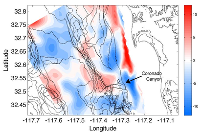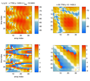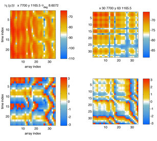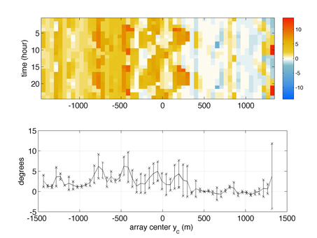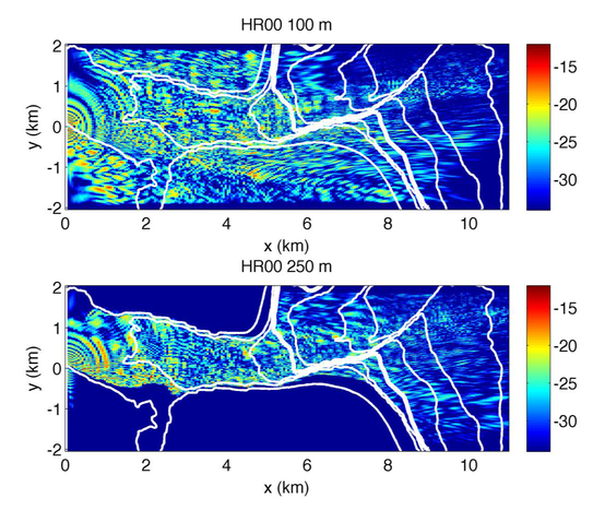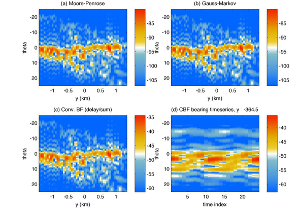 A A A Volume : 38 Part : 3 Proceedings of the Institute of Acoustics Quantifying acoustic field horizontal variability and acoustic system performance in a canyon with internal tides T.F. Duda, Woods Hole Oceanographic Institution, Woods Hole, MA, USA B.D. Cornuelle, Scripps Institution of Oceanography, UC San Diego, La Jolla, CA, USA Y.-T. Lin, Woods Hole Oceanographic Institution, Woods Hole, MA, USA 1 INTRODUCTION The acoustic signals received by underwater systems have been recognized as complex since the inception of underwater acoustics. The modeling of underwater sound began in earnest in the mid twentieth century, with the purpose of predicting sound levels from sources, including shadow zones, seabed reverberation, and so on. Parallel with this was research into array processing1 and signal processing2 methodology to improve extraction of signal parameters such as direction of arrival (DOA) in the presence of white noise or unwanted interfering signals. Often the signal processing methods make simplifying assumptions about the properties of the signal of interest, for example as a cylindrical wave or plane wave (i.e. the signal is modeled), which can create a framework for parameter estimation but may introduce uncertainty or bias in any given circumstance because the actual signal is in fact more complex than the signal representation in the model.3 A theoretically elegant method to utilize the complexity of the signal is matched-field processing,4 where the signal model is extended to allow arbitrary complexity, and models that predict fields that match the observed fields are judged to be useful model for the sonic situation, which includes parameters describing the propagation environment as well as signal source parameters such as position. Application of this method has been restricted by the large parameter space that must be considered and the difficulty of making predictions for all parameter combinations. When fully successful, matched-field processing can give precise location information for sources in complex propagation environments. Retreating from matched-field processing and adopting a simplified signal model, mitigating the effects of noise on parameter estimation has received much attention. Using conventional1 or more recently refined5 beamforming approaches to obtain DOA for plane waves and evaluate errors is suitable for plane waves, but this is often too simple of a model for ocean acoustic propagation. In other words, the oceanic Green’s function G(xs ,xr) evaluated at many array positions xr for source position xs is inconsistent with a plane wave. Here, we present a simple formalism to evaluate source direction (DOA) error estimation for horizontally distributed vertical line arrays (i.e. array beamforming performance estimation) in a complex oceanic environment. After that, we show example DOA results and error estimates made using a time series of computationally simulated sound fields in a canyon, which differ in time through the influence of internal tides. The behavior of DOA estimates is examined and compared with expectations based on the complexity of the sound field. It is found that the DOA can be estimated to within a few degrees, in the simulation scenario, at high signal to noise ratio. 2 SOURCE DIRECTION ERROR ESTIMATION 2.1 Simple least squares estimation The process of obtaining DOA estimates from synchronized acoustic data collected with a horizontal array with quantity M elements is usually an underdetermined inverse problem. The reason is that the range of possible source directions (angles) and the desired angular resolution give a space of size N > M for the model parameter vector, whose elements are plane wave energy at each angle. This can be written where y is the Mx1 vector of complex demodulated data, A is the MxN steering matrix whose columns are the steering vectors at each of N angles, x is the Nx1 model parameter vector representing plane wave energy at each angle, and n is a noise vector the size of y. Recent efforts to efficiently solve this underdetermined system for cases where only a few plane wave signals are expected (i.e. the problem is of a sparse nature) in independent identically distributed complex Gaussian noise have exploited relationships between techniques that minimize the L2 , L1 and L0 norms5. Those efforts are called compressive sensing. Here, we take a different approach, assuming that sources are smooth functions of angle, with no prior expectations of a small number of point sources. As done by the compressive sensing authors and by virtually all predecessors, we model the signals as plane waves, so that A is conventional, and a constrained least squares approach is taken. The noise n is taken to be the sum of system noise, Gaussian noise from highly scattered sources that are not locatable, and the leftover sound from nearby sources that are potentially trackable after subtraction of the (hypothesized) major plane-wave constituent. In this case, the objective function is where α2 is a trade-off parameter and μ is a Lagrange multiplier. Minimization of J gives a minimum-variance solution with minimum data/model misfit. The estimated solution is6 and the data-driven component of the uncertainty of the solution is where I is the identity matrix and Rnn is the covariance of the collected noise processes. With α equal to zero this is a Moore-Penrose inverse solution. The uncertainty depends on the covariance of the noise, as is intuitive. For the case of uncorrelated noise, Rnn = σn2 I, and a clear dependence on noise variance σn2 is evident. A filled-out noise covariance matrix will alter the uncertainty for that case. 2.2 Gauss-Markov estimation Gauss-Markov inversion formally allows the covariance properties of the noise to enter into the estimate. What is minimized is the dispersion of the inverse result about its true value. An important contributor to this is the covariance behavior of the fi