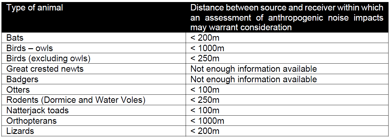 A A A Volume : 46 Part : 2 Proceedings of the Institute of Acoustics Provoking proportionate consideration of anthropogenic noise on terrestrial animals A. Scott, Hoare Lea, Bristol, BS32 4UB, UK A. Bullmore, Hoare Lea, Bristol, BS32 4UB, UK 1 INTRODUCTION Biodiversity in UK nature has generally been depleting since well before widespread data gathering began in 1970, and it continues to do so(1). It is in the interest of the UK(2) and of the planet as whole(3) to rectify this. However, if environmental pollutants such as noise, vibration, odour and light are not properly considered, then not only might humans be unknowingly causing harm to nature, but also, any actions to promote biodiversity may be critically uninformed and less effective as a result. This paper focuses on noise, and specifically what measures could encourage the potential impacts of anthropogenic noise on terrestrial animals to be considered when any developments are at planning stage. Assessing noise impacts on wildlife is complicated, as different animals have varying sensory organs and signal processing mechanisms, which make them perceive the world differently. Context, frequency, duration, timing, sound character, etc all expand how complicated the subject matter is. Moreover, previous DEFRA research(4) found that there was no strong evidence base for anthropogenic noise impacts on non-marine UK Priority Species and Species of Principal Importance. However, research of noise impacts on humans(5) shows that subtle widespread effects over time have substantial effects on overall population health. It stands to reason, therefore, that such adverse effects could be equally prevalent for terrestrial wildlife. While deriving definitive assessment criteria for noise impacts on wildlife is ambitious, particularly based on currently available research, this should not be a reason for not carrying out any assessments at all. There are no objective measures for deciding if an assessment of anthropogenic noise on terrestrial animals should be carried out. It is therefore proposed that, if a simple process for scoping could be developed, then this process could be used to quickly determine if an assessment is worthwhile. This would not only provide enhanced protection to terrestrial wildlife but would also protect against redundant assessments being carried out. A method that enables quick determination of what animal species warrant assessment for potential noise impacts would also allow assessments to be proportionate, rather than carrying out assessments for all the species in an area. In adopting such a targeted approach, it is implicitly acknowledged that efforts should be made to streamline the planning process, rather than add to it. Based on a review of the existing published literature, this paper discusses the feasibility of providing scoping criteria for determining which terrestrial animals on a site warrant an assessment of potential adverse noise impacts associated with any development works. It is proposed that a rational approach based on relative distances be taken, based on conservative assumptions, as summarised throughout the paper. Therefore, this study is not applicable to noise from airborne aircraft in flight, which warrants separate consideration as, for example, jet aircraft has been shown to potentially negatively affect nesting success for peregrine falcons(6). Fundamentally, this paper intends to provide a positive step towards facilitating appropriate considerations of noise and terrestrial wildlife in the wider picture of holistic decision making for planning, without unduly burdening the process. 2 METHODOLOGY 2.1 Literature Review This study focusses on terrestrial animals that are defined as protected species by the UK government(7). Therefore, a combination of various platforms (predominantly Elsevier, Google Scholar, Pub-Med, and ResearchGate) have been used to search for papers related to anthropogenic noise impacts on the following types of animals: Badgers. Bats. Birds. Dormice. Great crested newts. Invertebrates. Natterjack toads. Otters. Reptiles. Water voles. Where no, or little, research was found for a specific species, an attempt was made to find acoustic research for a similar species. For example, to provide an approximate representation of impact thresholds for natterjack toads, research available for different types of frogs was used. While frogs and toads have key biological and contextual differences, including different calls, they have relatively comparable ear structures and sensitivities to different frequencies (albeit with variance where species have a tympanum and are subsequently more sensitive at high frequencies)(8)(9)(10). While different animals, which may seem comparable at first glance, can have quite different relationships to sound. It is proposed that where the differences in audibility thresholds are small, grouping animals together for the purpose of scoping is reasonable. For example, small birds generally have relatively comparable audiograms(11). 3 KEY DATA FOR SCOPING 3.1 Bats Road traffic noise in isolation (i.e. audio playback of road traffic noise) is shown to be capable of reducing activity for various species of bats(12). Sound masking can influence hunting(13). Even where echolocation and traffic noise frequencies do not overlap, road traffic noise can provoke an avoidance response(14). The influence of road traffic noise on foraging success is likely to be profound close to a road (within 7.5m) but is potentially negligible further away (50m+), although search time is still likely to be influenced(15). Audio playback of compressor station noise has been shown to increase search times for bats in a comparable manner to road traffic noise(16). This study shows that road traffic noise could result in meaningful increases in search times at much greater distances (up to 640m away). However, as this study also found meaningful increases in search time