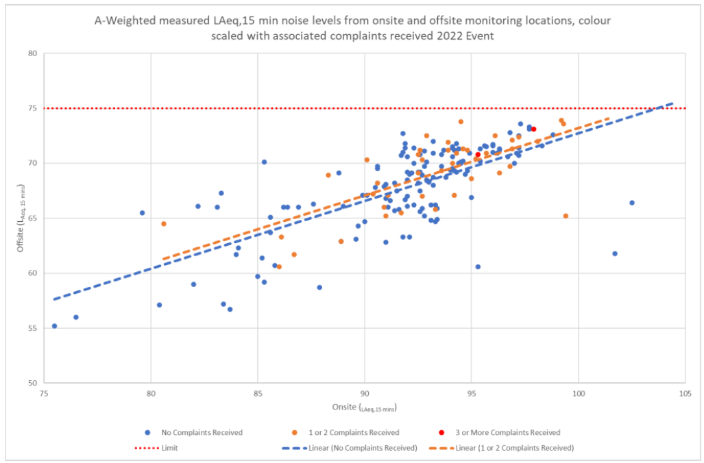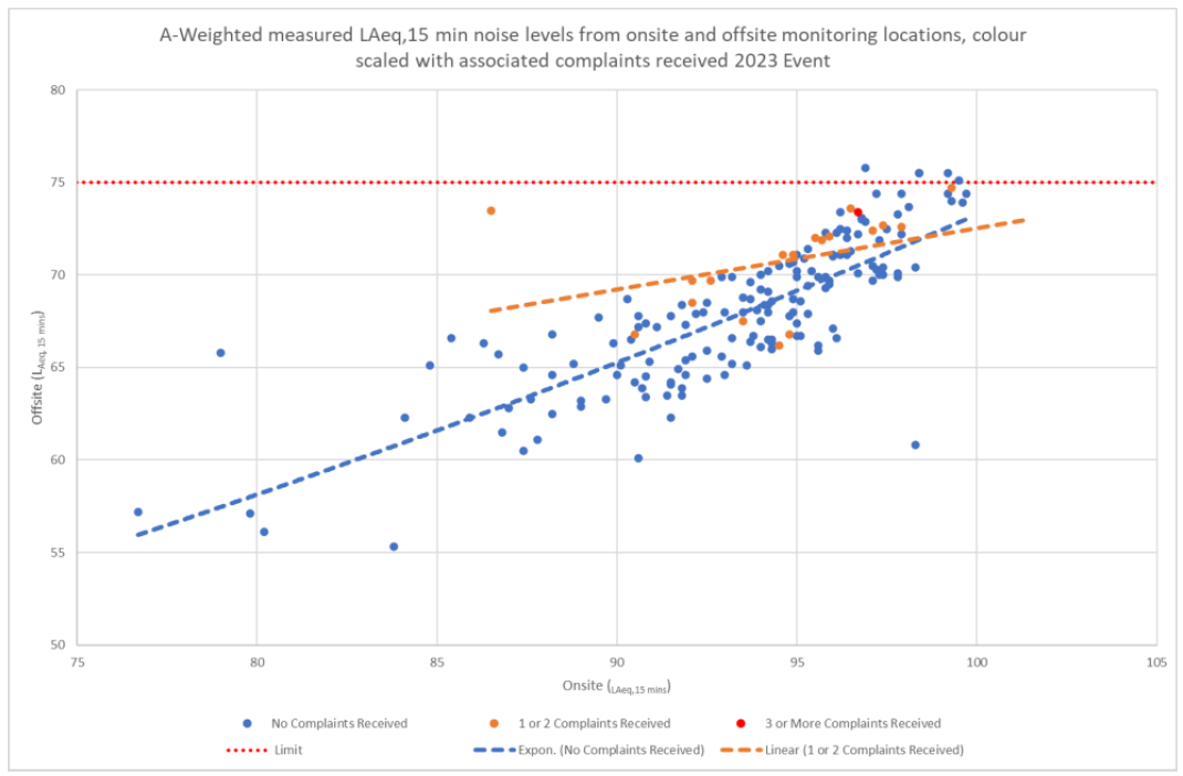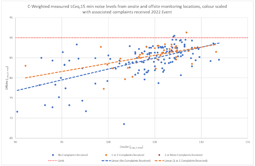 A A A Volume : 46 Part : 2 Proceedings of the Institute of Acoustics Low frequency sound at outdoor concerts – A necessary noise Dani Fiumicelli - Vanguardia Vince Parker - Vanguardia Ed Lawrence - Vanguardia Jonty Stewart - RPS 1 INTRODUCTION The A-weighted decibel provides a reasonable approximation of the loudness of many environmental noises e.g. for transportation, commercial and industrial sources, but can underestimate the impact of sounds with substantial low frequency content such as the “bass” and “sub-bass” content of “modern popular music” played at outdoor concerts and music festivals. The low frequency content is necessary for effective entertainment because, for example, it contributes to the sensation of loudness and provides the intangible, but vital impetus to dance/move rhythmically i.e. the “groove” 1, 2 & 3. However, excessive low frequency “bass thump” beyond the venue can provoke adverse community responses. The existing guidance on low frequency noise from concerts is limited in the range of frequencies covered and the advice provided is ambiguous which can be applied in an unduly onerous manner. Vanguardia have for some time been recommending that the C-weighted Music Noise Levels (MNLs) are also considered as these can be more reactive to the low frequency content than A-weighted. This paper includes analysis of data where C-weighted MNLs are linked to community response and examines how these can be used to provide a cap on the low frequency impacts offsite, whilst permitting sufficient low frequency content and flexibility for the sound engineers so that the sound quality and entertainment/cultural impact of the event is not unduly compromised. The paper concludes with recommendations of guideline C-weighted MNLs both in terms of the differential in relation to equivalent A-weighted values and the overall absolute noise level. 2 LOW FREQUENCY CONTENT OF “MODERN POPULAR BEAT MUSIC” 2.1 “The Groove” As noted above, low frequency sound has been a critical component of popular music since at least the early days of Jazz around the start of the 20th Century. Modern music trends 4 facilitated by advances in music technology, amplification, and loudspeaker design and construction mean that the very lowest “sub-bass” frequencies generated in recording studios by specialist “monitor” type equipment, which previously was unsuitable for touring or use outdoors, can now be economically and efficiently reproduced by acts with a touring PA and at outdoor events using equipment able to withstand the rigours of a “rock and roll” lifestyle. Low frequency sound in modern popular music is normally associated with the repeated beats and rhythms of drums and bass guitars and the synthesized sounds from electronic instruments and other sources. Frequency analysis normally shows that energy is often greatest in the some of the low frequencies in the range from 31.5 Hz to 160 Hz 1/3 octave, with peak energy in different bands depending on the music genre and even the individual tune playing. The table and figure below provides representative typical source frequency profiles of several types of modern popular music. Table 1: Representative typical 1/1 octave band spectra (dBZ) for types of popular music normalised to 98 dBA. Figure 1: Representative typical 1/1 octave band spectra (dBZ) for types of popular music normalised to 98 dBA. 2.2 The Issue The low frequency content of music noise from outdoor concerts is often the most common issue raised by complainants. This is due to factors including: Low frequency noise propagates more efficiently than mid to high frequency sounds. Low frequency noise penetrates buildings more readily than mid to high frequency sounds. The impulsive beat of low frequency “bass thump” can add to the adverse response compared to steady sounds of the same level5. The current code of practice6 does not offer formal guidelines for low frequency concert noise at receptors beyond the event boundary. Instead, it notes that receptor levels in the 63 Hz and 125 Hz 1/1 Octave bands between 70 dB and 80 dB are generally satisfactory. This can create tension between the regulators and the event as the regulators can prefer 70 dB and the events favour 80 dB. Although the code omits this important detail, the levels in the study on which the note in the code is based were measured at a distance of 2 Km from concerts at Wembley stadium. So, if these values are used, they should apply at 2 Km from a venue6A. Clearly higher levels occurred at noise sensitive receptor locations closer than 2 Km to Wembley stadium during the study. Another issue is that the comments in the code only cover sound in the 63 Hz and 125 Hz Octave bands. As the figure and table above show there is nowadays significant energy in the 31.5 Hz 1/1 octave band. Paradoxically, this means that rigid application of the comments in the Code of Practice could drive sound engineers to increase levels in the very lowest sub-bass frequencies to compensate for being unduly restricted at 63 Hz and 125 Hz 1/1 Octave bands, as there would be no such limits below 44 Hz (the lower limit of the 63 Hz 1/1 Octave Band). In the last 10 years Vanguardia have, at first on an informal basis and more recently as part of licence conditions, used C weighting in conjunction with A-weighted measurements to control respectively low frequency and overall levels of noise from outdoor concerts. On an empirical basis it has been found that restricting C-weighted levels to no more than 20 decibels above the equivalent A-weighted value with an upper limit of 90 dB LCeq,T at the nearest sensitive receptors normally avoids excessive complaints, although as discussed in the next section of this paper a degree of complaint is inevitable whatever the control threshold selected. 3 COMPLAINTS AS INDICATORS OF IMPACT Defra sponsored report research into attitudes to environmental noise from conc
