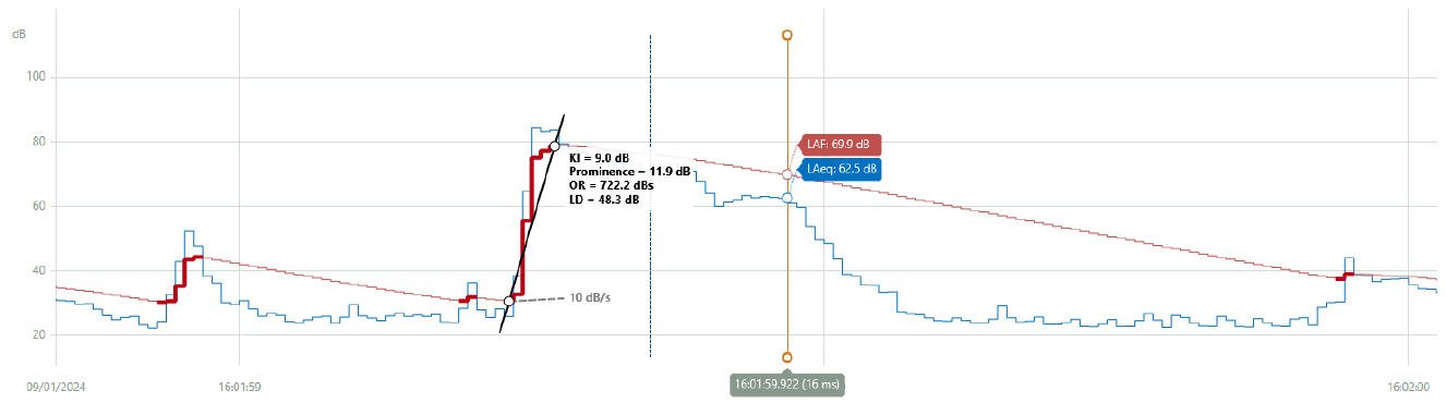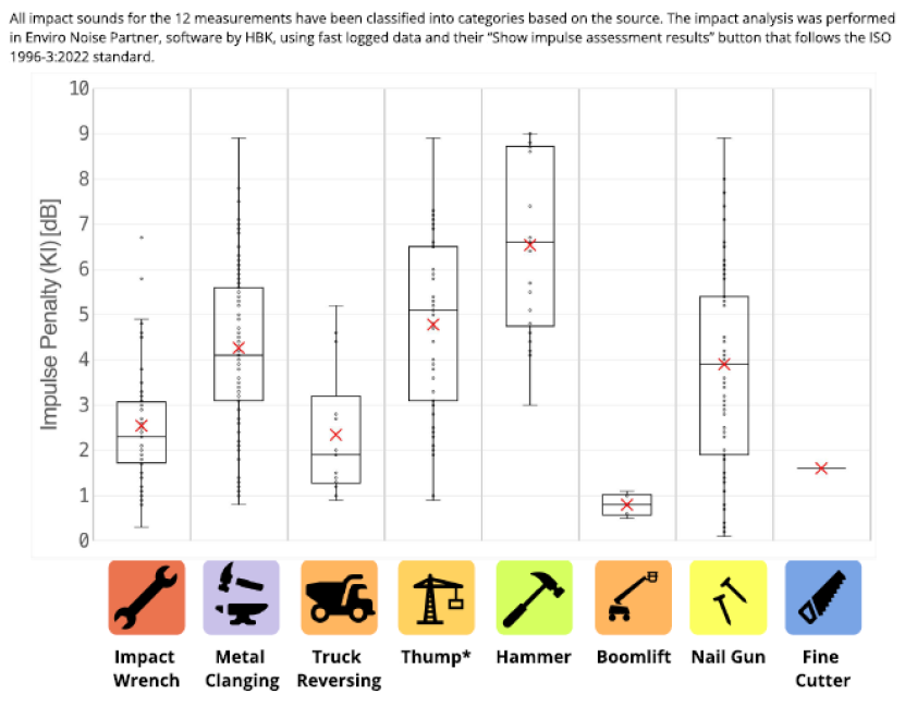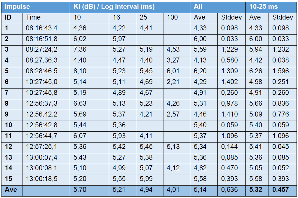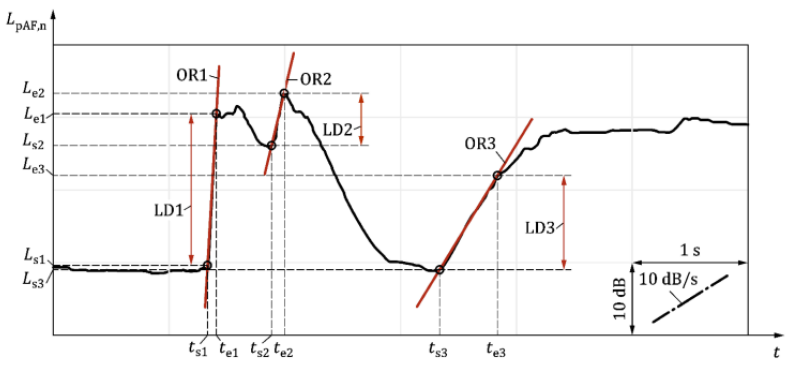 A A A Volume : 46 Part : 2 Proceedings of the Institute of Acoustics Different logging rates for measuring the prominence of impulsive sounds and for adjustment of LAeq D. Manvell, DMdB, Teglgaardsvej 52, 1, 2920 Charlottenlund, Denmark T. King, Hottinger Brüel & Kjaer, Teknikerbyen 28, 2830 Virum, Denmark M. Whiteman, Hottinger Brüel & Kjaer, Teknikerbyen 28, 2830 Virum, Denmark 1 INTRODUCTION As noise with prominent impulsive sound is more annoying than continuous types of noise (without impulses) with the same equivalent sound pressure level, an adjustment is added to the measured LAeq if prominent impulsive sound is present. In ISO 19961,2, three categories of impulsive sound have been found to correlate best with community response, and adjustments are given for each. Several sources with impulsive characteristics are categorised in ISO 1996-1. The non-exhaustive list of examples includes compressed air release, scrap handling, goods delivery, fork lifts with rattling forks, skateboard ramps, industrial shearing, gas discharges, percussive tools in demolition, powered riveting, etc. However, the list of sources of impulsive sound for each category is incomplete. Therefore, ISO developed a method, ISO/PAS 1996-33, which defines an objective method to measure the prominence of impulsive sound relative to residual sound. ISO/PAS 1996-3 is a development of BS 41424 and the objective method has been refined based on discussions among UK and international experts. Annex A of ISO/PAS 1996-3 encourages further research to support the development of a full ISO standard. This includes the application of real-world sources assessed at receiver locations including typical signal to residual noise ratios. 2 THE ISO/PAS 1996-3 OBJECTIVE METHOD The objective measuring method in ISO/PAS 1996-3 categorises sources by determination of the prominence of impulsive sound, with the aim of correlating to community response. The method is intended for sources not identified as gunfire or high-energy impulsive sound. It typically produces adjustments in the range 0,0 dB to 9,0 dB. These adjustments are intended to be used to categorise the sources as either regular impulsive or highly impulsive sound sources and apply the penalty indicated in ISO 1996-1. However, the adjustments may be applied directly, as is done in Nordtest Acou 1125, and in BS 4142:2014+A1:2019 where it has also been adopted. The method is based on the onset rate and level difference for the A-weighted time history of the sound pressure level with time weighting F. The method was originally developed and tested in a Nordtest project that led to Nordtest Acou 112 where the influence of the sampling interval for the A- weighted sound pressure level with time weighting F was tested 6 . The sampling interval had an effect on the result but, to enable the use of several types of measuring equipment, it was decided that sampling intervals in the range of 10-25 ms could be allowed, with 10 ms preferred for the best accuracy. The shorter the logging interval, the more precisely the method follows the actual impulse. However, this does not take account of human response accounted for in the method. During development in the ISO Working Group, ISO TC43 SC1 WG45, the method was reviewed and refined, and its description and application made more rigorous. One example was the review of a study of the different logging intervals as well a comparison of the Onset Rate determination method to 2 alternative methods, covering 14 different impulsive sound sources, subsequently published by Tickell7. In the published method, measurements are made with instruments conforming with Class 1 as specified in IEC 61672-18 with the additional logging of LpAF , the A frequency-weighted and F time- weighted sound pressure level, at time intervals in the range 10-25 ms (incl.). Use of short-term L Aeq (e.g. 10 ms), although not preferred, is permitted to compute the L pAF values. Measurements based on samples with time intervals of 100 ms may be used for surveys and screening, as many modern sound level meters can do this while recording the audio in sufficient detail for later analysis. However, it was identified that using this time interval results in a higher uncertainty. Figure 1: Time history of the L pAF sound pressure levels. LD is the level difference, L s and t s relate to the starting point, L e and t e relate to the end point, OR is the onset rate, and gradients of over 10 dB/s are indicated in red (source ISO PAS 1996-3). ISO 1996-2 provides additional guidance for performing these measurements. The ISO PAS 1996-3 method is intended to complement the ISO 1996-2 measurement method for general purpose environmental noise assessment. A comparison of the PAS to BS 4142:2014+A1:2019 shows the following main differences: a 100 ms sampling rate is permitted for survey measurements a default 30 minute ”assessment time interval” over which the impulse adjustment is applied, with shorter intervals permitted for short-duration reference time intervals Further details of the method as well as the changes made during development can also be found in a Euronoise 2021 paper by Manvell & Pedersen9. Figure 2: Automatic ISO PAS 1996-3 compliant impulse detection in Enviro Noise Partner. The method is supported by commercial solutions such as HBK’s 2255 Sound Level Meter and Enviro Noise Partner10,11,12. This enables impulse assessment with a 16 ms LpAF sample rate in accordance with ISO PAS 1996-3. The solution automatically detects the impulses and identifies the most significant one (example shown in Figures 2 and 3). In addition, this solution enables the analysis to be done for multiple assessment time intervals such as the method’s default interval of 30 minutes. Figure 3: Impulse detection based on 16 ms LpAF sampling (thick red line) showing slope (black), start and end points (circles). The short LAeq is in blue, the thin red line is the 1 ms LpAF . 3 THE