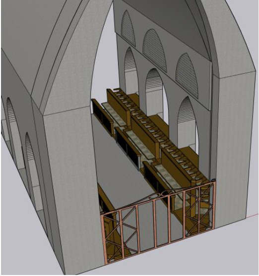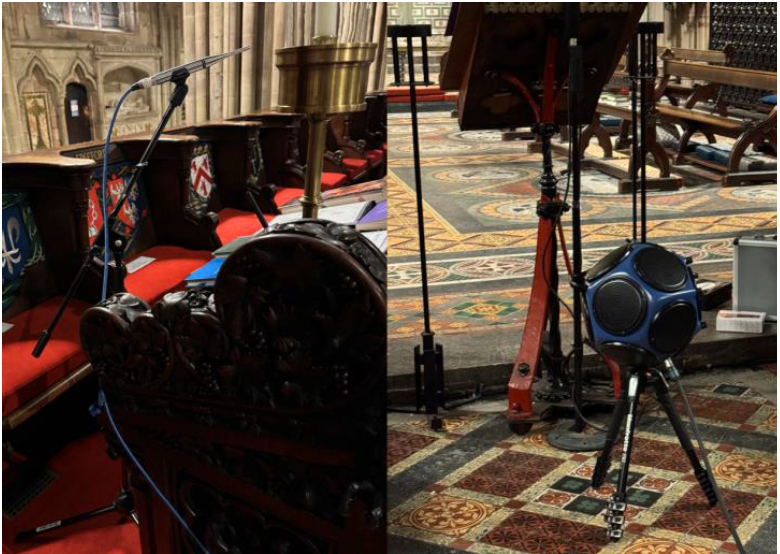 A A A Volume : 46 Part : 2 Proceedings of the Institute of Acoustics The historical auralisation of Lichfield Cathedral’s quire George Moore Birmingham City University, Birmingham, UK Benjamin West Birmingham City University, Birmingham, UK Islah Ali-MacLachlan Birmingham City University, Birmingham, UK 1 INTRODUCTION This project concerns acoustic models of Lichfield Cathedral’s Quire, both in its modern state and at three points throughout its history; these being a theoretical reconstruction of how it may have sounded from its Anglo-Saxon Christian roots and a model of its soundscape when the Quire was blocked off from the rest of the wider Cathedral. Once these models were constructed with adequate detail and accuracy, suitable auralisations were used to conduct a listening test, with listeners being asked to rate the soundscape of each model using a metric devised from contemporary research into an acoustic understanding of relevant religious history. Listener responses as well as raw data from the models allow determination on what differences present themselves between historical periods, as well as make conclusions as to the historical and cultural reasons behind those differences. This project bears a heavy influence from reasonably new advances in the sociological understanding of religion. In a break from its philosophical/theological roots, religious discourse since the turn of the century has begun to incorporate sociological ideas, studying religion from the outside rather than the inside, looking at the ways worship is performed between cultures or even between various religions.23 This came to a certain crystallisation with Whitehouse’s writings concerning “modes of religosity” at the turn of the millennium, designating two general categories of religion across all of human culture: “imagistic” and “doctrinal”22. This all is relevant to this project on account of a development of these categories that ties the theory together with acoustic theory. Braxton Boren’s 2021 paper “Word and Mystery” undergoes a psychoacoustic analysis of the Protestant Reformation, discussing how the radical differences in doctrine between the established Catholic Church and the burgeoning Protestant Reformation are actually echoed in the soundscapes present in their churches/cathedrals. In order to demonstrate this, he creates a two- point continuum along the descriptors “Semantic” and “Aesthetic”. In this continuum, a semantic space favours clarity of speech (exemplified by the free field “open air“ acoustic) in order to deliver religious revelation by way of scripture, to encourage a direct understanding of the religion by an individual – the “word” portion of Boren’s paper. Conversely, an aesthetic space favours the “mystery” portion of Boren’s paper, which means a space that focuses instead on creating an appropriate atmosphere for music and other more emotive religious factors, encouraging a personal relation with God experienced through emotional revelation, rather than an intellectualised understanding of religion (exemplified by the diffuse field “cave” acoustic)9. This semantic/aesthetic idea is used in the listening test in order to provide a metric for participants to understand and judge the auralisations by. Two snapshots of the history of the Cathedral were chosen to be recreated for the historic models. The first is its history as a Saxon Church. BBC History and the Victoria History of Lichfield state that prior to the Norman Conquest of England, the site that is now the Cathedral was a Saxon wooden church, roughly in the area which is now the Quire. Whilst detailed architectural details of the area at this time are not available, an approximation of the distinct soundscape present at this early point in its history is created by modelling a very simplified version of the Quire as a wooden construction. The second point relates to a large reconstruction performed in the Cathedral around the 16/1700s, introducing neo-gothic architectural approaches to the Cathedral. In a controversial “modernisation”, James Wyatt performed a drastic change specific to the Quire area. Prior to this reconstruction, the Quire was separated from the rest of the Cathedral proper by a heavy stone screen, which created an isolated acoustic environment within the Quire. A drawing by Wyatt from before his reconstruction was used to recreate the Quire in this isolated state, allowing auralisations to show the sound in the Cathedral prior to its neo-gothic modernisation.7, 10, 18 2 METHODOLOGY 2.1 Measurements Acoustic measurements of the Quire were taken in accordance with ISO 3382-1. In order to take measurements more appropriate to the unique acoustic character of a worship space2, Martellotta’s 2009 guidelines for the acoustic measurement of churches were followed. The equipment used was specified deliberately to satisfy Martellotta’s “intermediate” configuration in his paper concerning the acoustic measurement of churches. This configuration calls for an omni-directional electro-acoustic sound source, a receiver measurement microphone with an omni-directional pattern, and a deterministic noise source (in this case a sine sweep) recording in octave bands up to 8kHz17. The chosen sound source for this task was the NTi DS3 dodecahedronal loudspeaker, and the microphone chosen was an Earthworks M32mp measurement microphone. The sine sweep was generated via “Room EQ Wizard”, a powerful piece of freeware that allows for extensive acoustic measurement within spaces using a source/receiver configuration like this. The metrics it measures also satisfy Martelotta’s “intermediate” requirements. It measures reverberation in T20 and T30, as well as measuring many other metrics such as early reflections, as well as generating an SPL curve to determine which frequencies are amplified and which are attenuated within the space. The measurements 