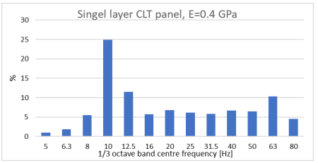 A A A Volume : 46 Part : 2 Proceedings of the Institute of Acoustics Investigating vibration effects on wooden frame buildings: A focus on CLT response to traffic-induced vibration J. D’Avillez, WSP, Birmingham, UK Jorge.deAvillez@wsp.com Z. Yang, WSP, Manchester, UK River.yang@wsp.com 1 INTRODUCTION Wooden frame buildings, especially those constructed with Cross-Laminated Timber (CLT), have become increasingly popular due to their sustainable nature and structural efficiency. Nevertheless, there are ongoing concerns about their vulnerability to environmental vibration, particularly those caused by nearby traffic, which may pose risks to the building's serviceability. CLT is a complex material to be modelled as it relies on multi-layer with anisotropic properties. This study will evaluate the effectiveness when employing a simplified CLT modelling strategy. And will evaluate the environmental vibration impact on a mix construction (concrete and wooden frame). 2 BUILDING RESPONSE TO ENVIRONMENTAL VIBRATION When vibration transfers from open ground (free-field) into a building, its magnitude and phase will change at the surface-building interaction due to impedance mismatch between propagation media (ground structure) and the building structure. To simplify the modelling process when assessing building response from environmental vibration, a set of ground-to-building transfer functions, empirically derived, has been compiled by previous publication 1,2,3 . These transfer function curves indicate that conventional residential buildings with spread footings up to 4 stories high can experience vibration attenuation of up to 12 dB around the 63 Hz 1/3 octave-band. They also suggest that heavier building constructions generally exhibit greater coupling loss. Once the vibration reaches the foundation, it propagates through the building's primary structure, including load-bearing external walls, structural columns, and floor slabs, typically losing some energy along the way. Figure 1 presents the generalized empirical curves typically used when carrying out an environmental impact assessment to establish the vibration impact on building from passing trains. The foundation coupling loss has been derived from measurements on heavy masonry buildings. The floor resonances are measured on typical mid-size rooms (in the 1970s) from city apartment buildings. The overall transfer function is the combining effect from both the coupling loss and the floor resonance. Figure 1: Generalised empirical curves2. Recent years have witnessed significant changes in construction methods, particularly in internal structures where lightweight construction materials like CLT floor plates. 3 MODELLING PROCESS 3.1 Modelling Tool To evaluate the building response from traffic-induced vibration, FINDWAVE® 4 , a well-established three-dimensional finite difference time-domain numerical model (FDTD) which computes the propagation of waves in elastic media, has been used. The vehicle module, forcing function, represents the train as a stack of damped masses and springs. The dynamic excitation is provided from an input file containing an assumed vertical rail profile. The environment module (e.g. rail/ground/building) models the dynamic behaviour of the rail surface supporting the vibration source (e.g. train), and the medium surrounding it, e.g. soil or air, together with structures below or above ground level. The structures of concern are represented by cells in a 3-dimensional orthogonal grid; and to each cell is assigned density, Lamé constants and loss factor. By creating a representation of the system of elastic materials as a three-dimensional array of discrete cells, each possessing the four fundamental properties of an elastic medium, namely shear modulus, compression modulus, density and loss factor, and applying the rules of wave propagation in elastic media, it is possible to represent the real-life behaviour of the system, subject only to the accuracy of the parameters used and the limitations of the size of the cells in the array. To account for complex geometries the cell parameters (density and Lamé constants) are scaled accordingly to capture the static and dynamic behaviour of the elements being modelled. For example, with the appropriate scaling a rectangular element, which is defined by a cell, will be able to approximate the dynamic behaviour of an I-beam. Given the small level of vibrations, it is assumed that the connections between beams and columns are rigid (e.g. beams and columns use the clamped boundary condition). 3.2 Test Building Design For this study a prototype building of a mixed construction (see Figure 2) will be assessed under the influence of rail traffic using the above mentioned FDTD method. Figure 2: Isotropic view taken from the numerical model showing the building under evaluation. The building, which is supported by a reinforced concrete foundation, spans a footprint measuring 100 m in length and 17 m in width. Concrete structures, such as columns and floorplates, forms the building structure from the basement up to the first-floor level. Transitioning from the second floor upward, wooden structural elements such as façades, floors, columns, and beams are utilized. There are five core structures (elevators and staircase shafts) rising from basement up to the sixth-floor level providing adequate constrain to the wooden frame. From the ground floor to the first level, the floor structure comprises concrete slabs upheld by concrete columns arranged on a 7 by 5.5 m gride. The perimeters of these floor structures are securely fastened to the concrete façade (clamped). This layout remains uniform across all levels, with only the materials varying. Starting from the second floor and extending upwards, wooden columns are utilized exclusively. Moreover, all CLT floorplates are further supported by two parallel beams fixed to the columns, running along the building's length (see Figur