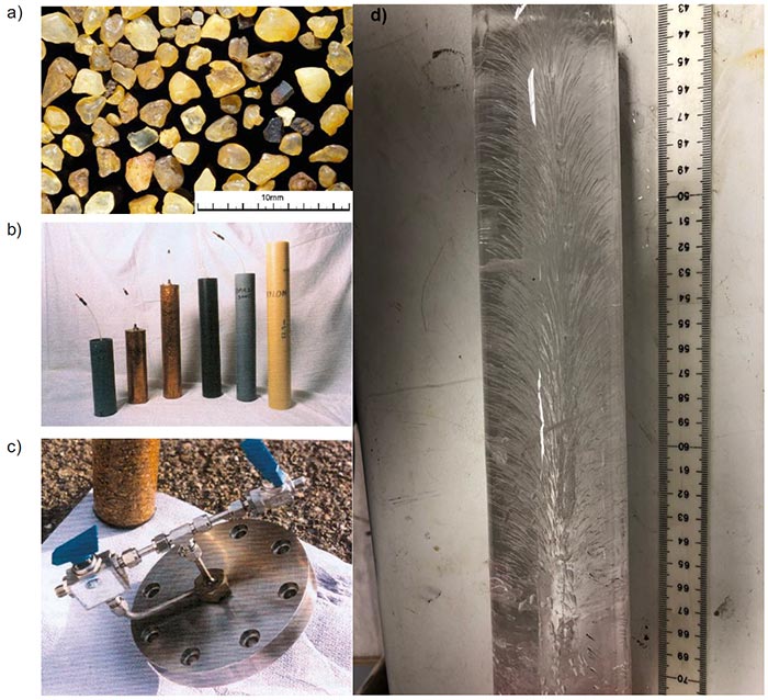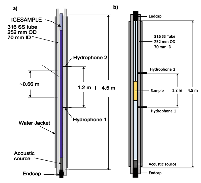 A A A Volume : 46 Part : 1 Proceedings of the Institute of Acoustics Laboratory acoustic pulse tube studies for seafloor and sea ice greenhouse gas quantification AI Best, SK Sahoo, LJ North, National Oceanography Centre, Southampton, United Kingdom BN Madhusudhan, H Sutiyoso, University of Southampton, Southampton, United Kingdom O Sanford, T Clarke, Defence Science & Technology Laboratory, United Kingdom 1 INTRODUCTION The acoustic pulse tube, or impedance tube, is a useful method for quantifying compressional wave properties of various materials. We use an instrument designed for studying wave propagation in porous media, especially seafloor sediments and latterly sea ice, and for broader applications to ocean acoustics research. Notable design improvements over extant systems include full ocean depth pressure rating (60 MPa), the ability to extract broadband signatures over 1 – 20 kHz using a novel sonar projector with a transmission line calibration/modelling approach, and jacket designs allowing porous medium effective pressure control. The temperature can be controlled between -5°C to 55°C. We obtain complementary shear wave velocity and attenuation measurements at 200 – 500 Hz (depending on material properties) using a separate geotechnical resonant column instrument rated to 20 MPa effective pressure with temperature control between -20°C to 20°C. Novel scientific results on synthetic sea ice cores with different air contents, and sand samples as a function of water saturation and pressure, provide insights into wave propagation mechanisms for these complex porous media. The data are suitable for modelling using effective medium theoretical approaches (e.g. modified Biot theory1 to estimate the volume and distribution of free gas, needed for constraining impacts of greenhouse gases in the seafloor and in sea ice, of interest to climate research in rapidly changing polar regions. We present below an overview of novel instrument developments and some example scientific results. 2 LABORATORY MEASUREMENTS 2.1 Acoustic pulse tube experiments on ice and sand samples An acoustic source (located at the base of a 4.5 m long, 70 mm internal diameter, stainless steel, thick-walled tube filled with water; see Figure 1b) projects a Stoneley wave that approximates a plane wave propagating up the tube through the test sample suspended halfway2. Hydrophones in side-wall ports below and above the test sample record the acoustic signals from which sound wave velocity and attenuation (Q -1 ) frequency spectra are calculated with respective accuracies of ± 2.4% and ± 5.8% for jacketed sediments, and ± 10% and ± 15% for synthetic ice samples (using a different arrangement shown in Figure 1a). Figure 1: Cross-section through the acoustic pulse tube showing different arrangements for measurements on a) ice cores, and b) sediment samples. The main innovation from the method presented in McCann et al.2 is the ability to extract spectral signatures over the 1 – 20 kHz bandwidth, as opposed to single average values of velocity and attenuation over the frequency bandwidth. An acoustic chirp pulse is projected into the pulse tube and the recorded signals are deconvolved to obtain the time series of transmitted and reflected broadband pulses at the hydrophones. Example chirp and deconvolved time series are given for a Nylon calibration sample in Figure 2. For samples suspended inside the tube (Figure 1b), we use the scattering matrix method to remove the effects of extraneous reflections from the pulse tube end caps and multiple reflections from the sample ends. See Equation 1 and Figure 3. We assume that the tube system is a 1-D transmission line with one input and one output without any harmonic distortion. The wave is assumed to propagate only in one dimension, i.e., a plane wave without any propagation at the sidewalls, multiple paths, or shear-wave coupling. where A represents the incoming wave from the sound source and reflections from the bottom endcaps of the pulse tube, B is the reflection from the sample, C is the outgoing wave from the sample, and D is the second incoming wave from the reflection from the top pulse tube endcap. To simplify Figure 2: Example acoustic pulse tube time series for a Nylon calibration sample recorded at Hydrophones 1 and 2 in Figure 1. a) Raw chirp data, b) Time gated first arrivals of deconvolved signals (note relative time scale). After Sutiyoso et al.3. the calculation, we assume the sample is cylindrically symmetrical. The attenuation Q -1 (inverse of the quality factor Q) is calculated from the complex velocity output from the scattering matrix method according to4 where ν1 and v2 are the real and imaginary parts of the complex velocity, respectively. The time series of the water-filled pulse tube both with and without the sample are required in the above analysis. A frequency domain analysis is used to represent the geometry of ice samples floating on top of the water column without a metal end cap (Figure 1a). Figure 3: Transmission line model for extracting acoustic velocity and attenuation spectra from pulse tube time series. After Sutiyoso et al.3. 2.2 Sediment and synthetic sea ice sample preparation Sample preparation is an important step in the experimental work requiring a number of considerations. For loose seafloor sediments such as gravel, sand and mud, the method lends itself to either sub-sampling of actual seafloor sediment cores 2 or use of synthetic granular materials (e.g. quartz sand packs 3 ). In both cases, the sediment must be enclosed inside a jacket to maintain integrity inside the pulse tube. The jacket can be made from a range of materials, such as plastic tubes with sealing endcaps that can slide up and down inside the jacket to accommodate the strain resulting from applied external and internal pore fluid pressures. For geological materials, it is important to control both confining and pore fluid pressures to replicate th
