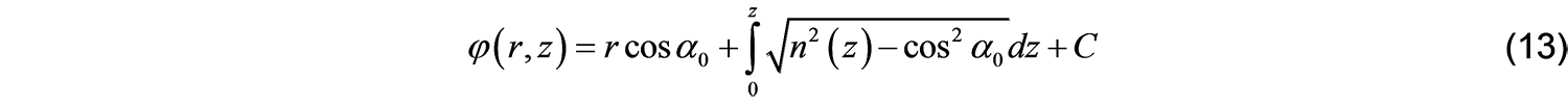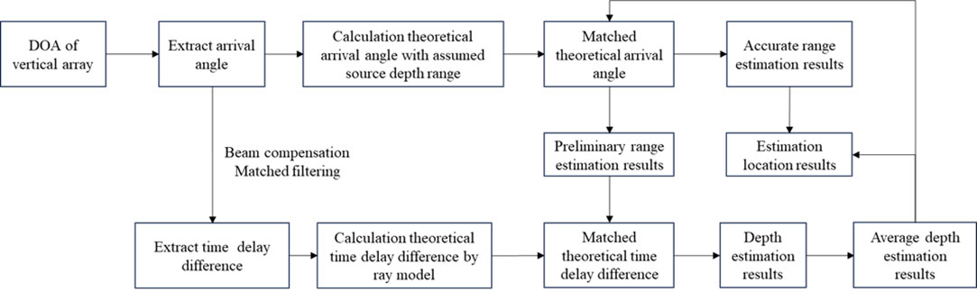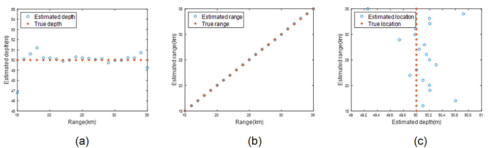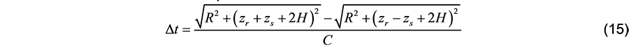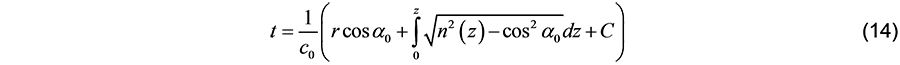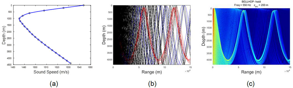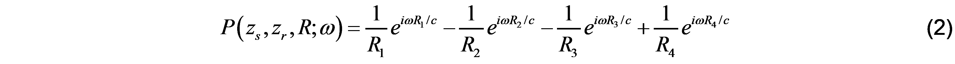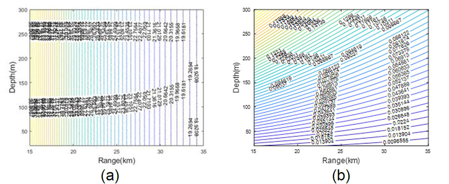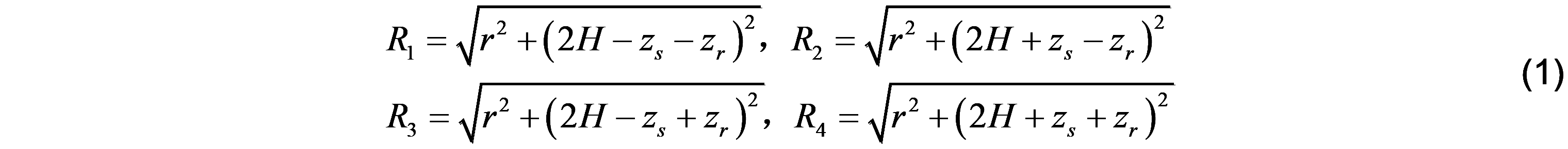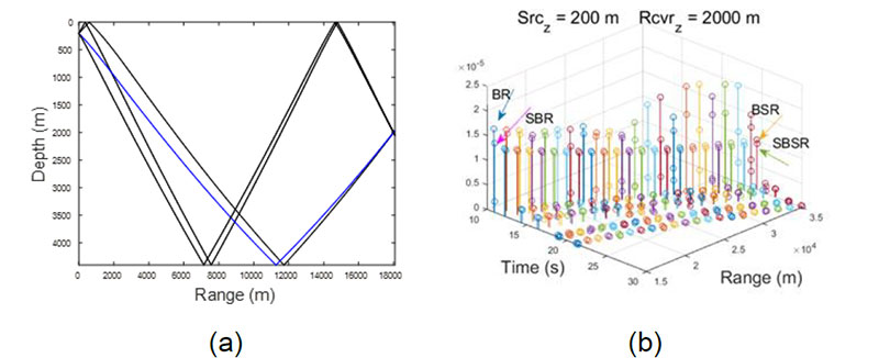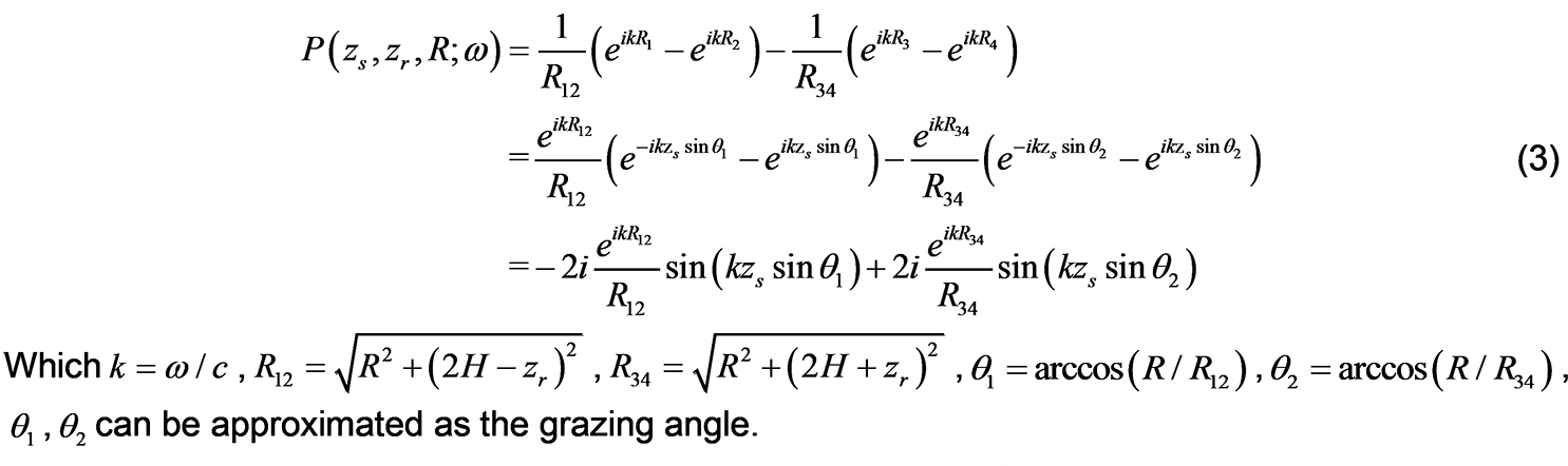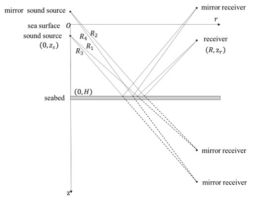 A A A Volume : 46 Part : 1 Proceedings of the Institute of Acoustics A joint estimation method of underwater source range and depth in deep ocean bottom bounce area Chenyi Xu, College of Underwater Acoustic Engineering, Harbin Engineering University, Harbin, China Shengchun Piao, College of Underwater Acoustic Engineering, Harbin Engineering University, Harbin, China Junyuan Guo, College of Underwater Acoustic Engineering, Harbin Engineering University, Harbin, China 1 INTRODUCTION In recent years, the research on ocean has gradually moved from shallow sea to deep sea. Deep sea source positioning is an important issue in passive underwater acoustic detection. Since the sound field in the shallow sea is different from the deep sea, the positioning method is different in the two environments. Matching-field processing (MFP) technology is the most commonly used method in deep-sea passive positioning. It can be traced back to the 1980s, Fizell and Wales used a vertical array combined with MFP to achieve successful localization of long-distance sound sources in the Arctic Ocean1. Transfer and Hodgkiss conducted deep-sea matching field positioning experiments in the northeastern Pacific Ocean. In the range direction, the estimation results were good; in the depth direction, the estimation results were poor2. Lei used a dual-sensor vertical array to locate the target by matching the cross-correlation function of the signals received by two hydrophones3. Although the effectiveness of MFP has been proven by a large number of experiments, it is difficult to make progress because it is highly sensitive to the environment. Environment-focused MFP and Bayesian MFP methods have been proposed to solve the environment mismatch problem, but they have high real-time requirements4-5. This paper uses Bellhop to simulate the arrival signal of the vertical array located in the deep ocean bottom bounce area to obtain the multipath structure. For the sound source near the sea surface, a sound source positioning method matching the vertical arrival angle of the specified sound ray and the corresponding multipath delay difference is proposed. The effectiveness of this method is analyzed by simulation, and the results show that it can provide the basis for the deep ocean bottom reflection signal localization. 2 ANALYSIS OF THE MULTIPATH ARRIVAL STRUCTURE OF THE OCEAN BOTTOM BOUNCE AREA When the sound source and the hydrophone are both near the sea surface, the deep-sea sound field can be spatially divided into direct area, shadow area, and convergence area according to the range. Figure 1(a) shows the sound speed profile (SSP) used in the simulation, where the sea depth is 4400m and the channel axis depth is 1046m. It is assumed that the seabed type is acoustic half space, the seabed sound speed is 1550m/s, the seabed density is 1.6g/cm3, and the absorption coefficient is 0.2dB/λ. The ray model is selected and Bellhop is used for simulation. The depth of the sound source is 200m, the frequency of the sound source is 550Hz, and the acoustic propagation path is shown in Figure 1(b), and the acoustic propagation loss is shown in Figure 1(c). Figure 1(c) shows that the propagation path forms a convergence area with a width of several nautical miles and a depth of several hundred meters near 60km and 120km. There are shadow areas between 6~55km and 65~115km, which are inaccessible to direct waves. The sea-bottom bounce area of interest in this paper mainly consists of the primary seabed reflected sound rays, and is an important part of the first shadow area. The hydrophone is placed in the sea-bottom bounce area, with a range of 18 km and a depth of 2000m. Figure 2(a) shows the eigen rays received by the hydrophone, and it can be seen that the sea-bottom bounce area mainly consists of four sound rays, which are bottom-reflected (BR) path, surface-bottom-reflected (SBR) path, bottom-surface-reflected (BSR) path, and surface-bottom-surface-reflected (SBSR) path. Keeping the reception depth of the hydrophone unchanged and changing the reception range, the structure of the arrival sound path is shown in Figure 2(b), and it can be seen that the difference between BR and SBR becomes larger with the increase of the reception range, while the difference between BSR and SBSR does not change significantly; therefore, in this paper, we consider the sound paths BSR and SBSR for the estimation of the sound source. Figure 1: (a) Sound speed profile (b) Sound propagation path diagram (c) Sound propagation loss diagram. Figure 2: (a) Eigen rays diagram (b) Structure of sound path arrivals (15-35km) The use of virtual source theory to analyze the sound field in the sea-bottom bounce area, the reflected sound rays through the sea surface and the seabed are regarded as sound rays emitted by their respective virtual sources, and the number of virtual sources increases with the number of reflections of the sound rays6. The establishment of the coordinate system rOz shown in Figure 3, assuming that the depth of the deep sea H, the speed of sound in the sea to take the average value c, the depth of the sound source, and the hydrophone from the surface of the sea for z s and z r , the horizontal range between the transceiver for R. Let the slant distance between the source and the mirrored source to the receiver and the mirrored receiver be R1 , R2 , R3 , R4 , and the slant distance of each of the four sound rays can be introduced from the figure as The received signal is the superposition of four sound rays. When the angular frequency of the transmitted signal from the sound source is ω, with the background interference and time factor not considered, and the sea surface is a free boundary, the signal at the reception point is written as Since the source is placed near the sea surface, the depth of the source is negligible compared to the sea depth, so R1 and R2 , R3 and R4 can be approximately equal, and the signal is simplified as Figure