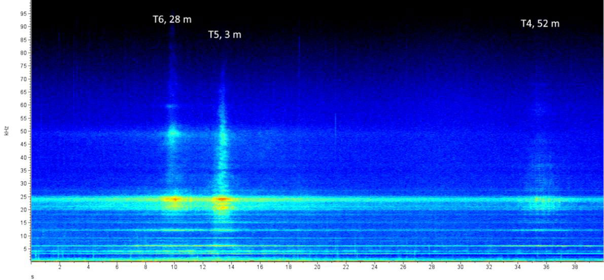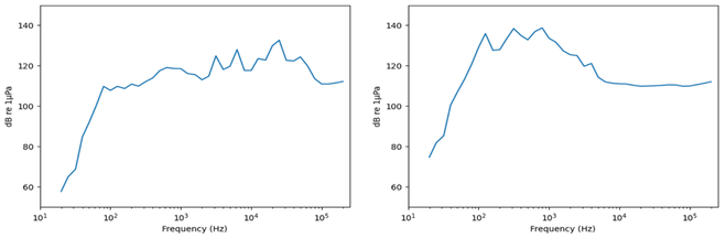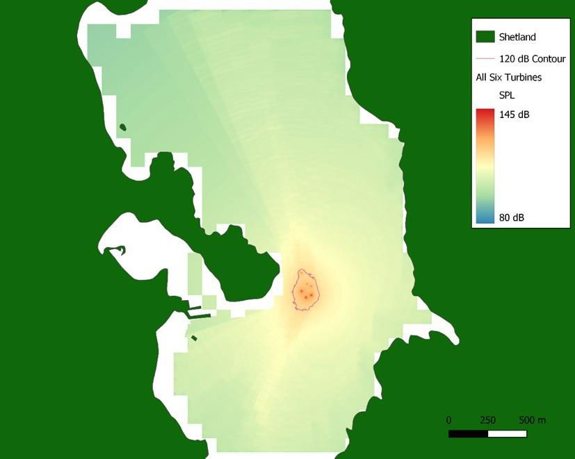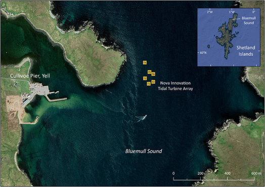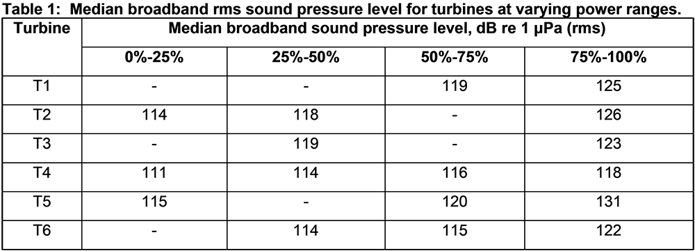 A A A Volume : 46 Part : 1 Proceedings of the Institute of Acoustics Underwater acoustic measurement, characterisation, and modelling of Nova Innovation tidal energy converters at Bluemull Sound, Shetland D. Jervis, Seiche Ltd, UK R. Lee, Seiche Ltd, UK S. J. Stephenson, Seiche Ltd, UK C. Pierpoint, Seiche Ltd, UK C. Birch, Seiche Ltd, UK 1 INTRODUCTION Tidal Energy Convertors (TECs), such as tidal turbines, harvest tidal stream kinetic energy as a sustainable source of electrical power. To gain consent for new tidal energy developments, it is important that any potential environmental impacts are understood, such as the impact of underwater sound produced by the devices on marine life. Knowledge of the underwater acoustic characteristics of TECs can therefore assist in the preparation of environmental impact assessments for new developments. Measurements of underwater sound from TECs can provide insight into these impacts and can be used as input to underwater acoustic models that predict the expected sound field and associated impacts of future projects. This paper describes the collection and analysis of underwater acoustic data by Seiche Ltd to evaluate the noise contribution of Nova Innovation’s (henceforth referred to as “Nova”) Shetland Turbine Array, and the subsequent acoustic modelling. Data collection was carried out at Bluemull Sound in the Shetland Islands, Scotland, where Nova has installed an array of six 100 kW non-surface piercing gravity-based tidal turbines (henceforth referred to as Turbines 1-6, or T1-6). The site is essentially a scoured channel orientated approximately North- South, with a maximum depth of approximately 44 m and a maximum width of approximately 850 m. The relatively shallow water is characterised by highly turbulent tidal flow across a mostly solid, rocky substrate. Underwater sound recordings were collected on-site using a tethered drift buoy method. This novel data collection methodology aimed to mitigate the effect of turbulent flow noise while still adhering to established standards. There were two types of turbines measured during the study: three direct drive turbines and three geared turbines. This study focussed primarily on the direct drive turbines T4, T5, and T6, because Nova has now discontinued the use of the less efficient geared turbine design used in T1, T2, and T3. At first, data collection was exclusively focussed on characterising T6, but sample recordings for the other turbines were collected opportunistically. The location of the turbine array is shown in Figure 1. Figure 1: Map of Bluemull Sound with turbine locations marked. 2 MEASUREMENT METHODOLOGY Acoustic measurement in highly dynamic tidal environments poses certain challenges. Using static hydrophones presents logistical difficulties in anchoring moorings to the seabed. Furthermore, static hydrophone installations are exposed to turbulent water flow across their surface which results in spurious ‘flow noise’ that may mask sounds of interest. Flow noise affects lower frequencies (up to ~1000 Hz) in particular, which are important in characterising tidal turbine signals. Using drifting hydrophones reduces flow noise but interweaves temporal and spatial patterns. Collecting enough data through multiple drifts across areas of the same spatial extent at different times of the tidal cycle can help to account for observed variability. Drifting hydrophones have the advantage of measuring the turbine sound field as a function of range, aiding in estimating local propagation loss. Accurate measurements of turbine sound at a series of distances and estimates of propagation loss are both necessary to back-calculate the source level of the turbines. The focus of the project was to conduct detailed measurements with which to characterise underwater sounds produced by direct drive tidal turbines. It was possible to make sound recordings during periods when single turbines were operating only (recording sessions with T6 and subsequently T4). Whilst on site, the opportunity was also taken to undertake measurements on other turbines and multiple turbines, including the other direct drive turbine T5, the older geared turbines (T1, T2 and T3) and the entire array of six turbines. The data collection method used an 11-m rigid-hulled inflatable workboat (RIB) as a drifting platform from which to deploy a calibrated hydrophone system. The cabled hydrophone was tethered to the Seiche PAM-Go™ data acquisition system carried on the boat and drifted approximately 25-30 m from the boat and approximately 10 m depth below a surface (suspension) buoy. Global navigation satellite system (GNSS) data were logged at the buoy above the hydrophone at a rate of 10 Hz. A schematic drawing of the data collection system is presented in Figure 2. Figure 2: Schematic drawing of the data collection system. In accordance with International Electrotechnical Commission (IEC) TS 62600-40 2019 requirements for Level A characterisation, acoustic data were sampled, where possible, from four zones surrounding the turbines: “upstream”, “downstream”, “port”, and “starboard”. Each zone is represented by a square polygon which measures 25 m on edge and is offset from each turbine by approximately four times the longest dimension of the rotor. Each sampling zone at the array was offset by 21.5 m to the edge, or 34 m to the centre (four times the longest dimension of the turbine rotor). The polygons were orientated to the direction of the flood and ebb tidal stream, therefore as the tide changed direction the boxes switch. A series of drifts were carried out to collect acoustic data from each of the sampling zones offset from individual tidal turbines. 3 ANALYSIS METHODOLOGY In-house Seiche software created with LabVIEW and Python was used to categorise the collected acoustic data based on the GNSS position, proximity to each turbine, tidal flow direction, and turbine power. The drift line GNSS data