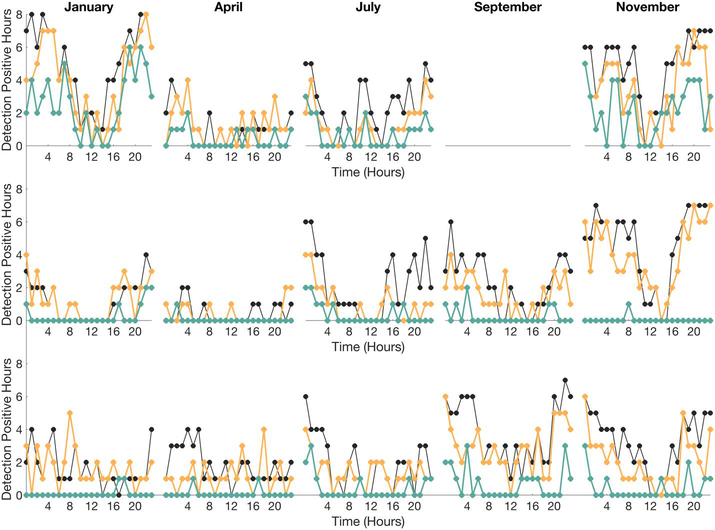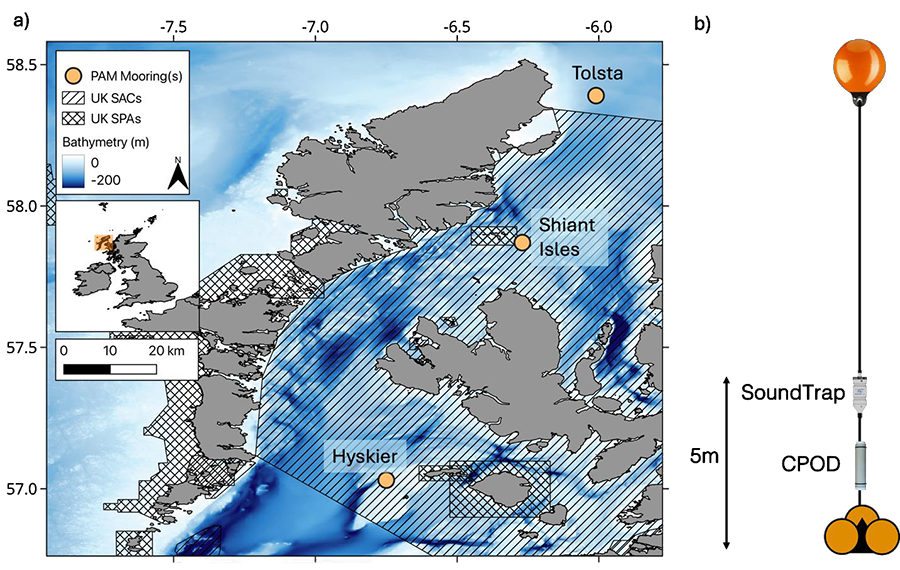 A A A Volume : 46 Part : 1 Proceedings of the Institute of Acoustics Who goes there? Evaluating the performance of a CNN for monitoring delphinid presence to that of the C-POD within diverse marine soundscapes Ellen White, School of Ocean and Earth Science, University of Southampton, UK Jonathan M. Bull, School of Ocean and Earth Science, University of Southampton, UK Paul R. White, Institute of Sound and Vibration, University of Southampton, UK Denise Risch, Marine Science Department, Scottish Association of Marine Science, Oban, UK 1 CONTEXTUAL BACKGROUND Passive acoustic monitoring (PAM) is a cost-effective method of gathering big data for monitoring the distribution of cetaceans1,2, yielding important insights into occurrence, movements, and behaviour over space and time, for use in species conservation and habitat management3,4,5,6,7. Dolphins are an indicator species, common to the British Isles, with the status and health of regional populations acting as important metrics for conservation and in assessing ecosystem health8,9. Acoustically they emit a diverse range of signals, employed in hunting, navigation, and communication, consisting of highly directional transient signals (echolocation clicks) and tonal omni-directional, frequency modulated whistles10,11. The presence of these acoustic cues within broadband acoustic recordings can be used as a proxy for true animal presence12, but manual extraction of signals is laborious and unrealistic on an appropriate timescale for conservation. Automation of the detection of these acoustic signals is therefore an essential component of the analysis pipeline for gathering data on delphinid occurrence. The application of Deep Learning (DL) algorithms is increasingly prevalent within the field of bioacoustics. Convolutional Neural Networks (CNNs), which use image processing techniques to read and classify acoustic data into predetermined classes, have been shown to excel at detecting signals which vary in respect to time, frequency, and amplitude13,14,15,16. Using broadband acoustic data as input, CNNs have achieved high accuracies at the task of detecting dolphin vocalisations within variable marine environments17,18,19,20. The use of CNNs for monitoring long-term dolphin occurrence in diverse acoustic habitats, beyond proof of concept, is still in its infancy; for such a tool to become part of the standard analysis toolkit we must demonstrate its reliability compared to established methods of detection. The C-POD logger (Cetacean – Porpoise Detector, Chelonia Ltd UK) has been used extensively for monitoring the distribution, regional density, and acoustic habits of small cetaceans21,22,23,24,25, and is used as an integral tool in global monitoring programs for comparing species occurrence over time and space26,27,28,29,30.The C-POD is a non-archival data logger, it does not store broadband acoustic data, instead autonomously detecting, via on-board processing, the presence of echolocation click trains (regularly spaced series of similar clicks) between 20 – 160 kHz. Proprietary software is provided which contains a custom classifier (KERNO) to classify click trains as originating from either dolphins, porpoises or other cetaceans based on their intensity, duration, frequency content and inter-click intervals (ICI)31,32. In this work we evaluate the performance of the C-POD compared to a newly available multi-sound source CNN16 for the task of monitoring hourly dolphin presence in the waters off the west coast of Scotland (Figure 1), using PAM data collected within the COMPASS array (EU INTERREG COMPASS project). We present the first empirical comparison between a CNN and the C-POD for dolphin detection, highlighting the efficiency of each method as a monitoring tool in diverse soundscape conditions. 2 METHODS 2.1 Data Acquisition Passive acoustic data was analysed from three locations from within the COMPASS array; Tolsta, Hyskier and Shiant Isles (Figure 1, Table 1). Each mooring consists of a single omnidirectional broadband acoustic recorder, the SoundTrap 300HF (Ocean Instruments Ltd, sensitivity -121 dB re 1V/µPa), located 5m above the seabed. Audio data is sampled at 96 kHz and recorded on a 20/40 minutes on/off duty cycle which commences on the hour. A C-POD logger (Chelonia Ltd) is positioned beneath the SoundTrap on the array (Figure 1b), recording data continuously. The physical conditions and mooring depths at each location contribute to seasonal variation within the regional ambient soundscape (Figure 2). To evaluate detector performance in diverse acoustic fields eight data periods were identified: five one-week periods were selected as being likely to be representative of seasonality across the year; January 24th – 31st, April 1st – 7th, July 1st – 7th, September 1st – 7th and November 17th – 23rd 2019. Three periods associated with named storms were selected, corresponding to times when low-pressure resulted in elevated ambient noise conditions (Table 1), identified using the UKs MetOffice MIDAS archive weather records for 2019 (Met Office, 2022). The selected storms were Storm Gareth (March 11th – 14th 2019), Storm Hannah (April 25th – 28th 2019), and Storm Atiyah (December 7th – 10th 2019). Data gaps are present at individual sites due to mooring loss or recording failures (Table 1). Figure 1: a) Map of the three acoustic mooring locations used within this work, located off of western Scotland as part of the COMPASS array. The regional bathymetry is depicted by the colour scale (m), sourced from GEBCO. b) Schematic depiction of each acoustic mooring consisting of a broadband recorder (SoundTrap 300HF, Ocean Instruments) and a C-POD logger positioned 5m above the seabed. 2.2 Analysis of Acoustic Data This section describes how the number of detection positive hours (dph) were determined manually, from the CNN, and from the C-POD. Manual detection Each of the 20-minute broadband acoustic files were rev
