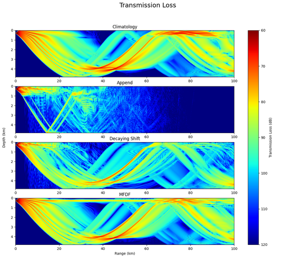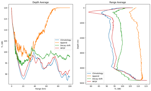 A A A Volume : 46 Part : 1 Proceedings of the Institute of Acoustics Gaussian processes for merging water column parameters F. Boulton, University of Liverpool, Liverpool, L69 7ZL, UK D.J. Colquitt, University of Liverpool, Liverpool, L69 7ZL, UK S. Timme, University of Liverpool, Liverpool, L69 7ZL, UK D.P. Williams, Dstl, Porton Down, Salisbury, SP4 0JQ, UK 1 INTRODUCTION Accurate sound speed profiles are essential for effectively modelling the propagation of acoustic waves. However, in-situ, point-in-time measurements are often limited to XBT and XCTD probes, at a discrete location and time, providing environmental parameters for the top of the water column. Often historical climatological, or very occasionally forecast, data for a given time-period is used as a “best estimate”. In cases where measured in-situ data exists, invariably these measurements either does not match the climatological/forecast data and/or does not cover the entire water-column. To address this problem we use a Gaussian Process (GP) data fusion method called Multi-Fidelity Data Fusion (MFDF) to extend in-situ measurements, in depth, using historical/forecast climatological data, yielding potentially more accurate, up to date, estimates of the chosen water column parameter. We apply this method to in-situ temperature data from XBT probes and historical climatological data. The merged data is then used to calculate the sound speed profile. We examine the effect of using MFDF to water column parameters with acoustic propagation modelling. In-situ measurements of temperature and depth can be obtained with instruments such as XBT probes, while simultaneous in-situ estimates of temperature, salinity and depth can be performed by Expendable Conductivity Temperature-Depth (XCTD). These instruments are typically rated up to depths of approximately 460m to 1000m, depending on the type of instrument. As such, these instruments measure parameters in the upper section of the water column which is the most variable in temporal changes. The deep water section of the profile remains relatively constant over time in many deep water areas, hence we can use pre-existing climatology to estimate the parameter profile in this section of the water without resorting to extrapolation. These merged parameter profiles can then be used to calculate the sound speed using equations such as the United Nations Educational, Scientific and Cultural Organization (UNESCO)5, or the Leroy et al14 sound speed equations. Various factors can affect the speed of sound and how sound waves propagate through water, including temperature, pressure, and salinity. Small changes in these parameters can have a significant impact on sound speed profiles, introducing features such as ducts and sound channels (a region within the water column where sound is trapped), which dramatically affect acoustic propagation. These profiles are essential for sonar systems, aiding in target localization, range estimation, and detection performance. In underwater communication, reliable data transmission relies on understanding sound speed variations. Additionally, sound speed profiles are vital for environmental monitoring, helping to track oceanic phenomena and interpret oceanographic data. Sound speed profiles also naturally play an important role in underwater imaging techniques like sonar imaging. Indeed, accurate sound speed profiles underpin many aspects of underwater acoustics, enabling better decision-making and more effective use of acous tic technologies. There are several existing methods to merge in-situ measurements with historical/forecast data. The simplest approach is to append historical/forecast data to the in-situ data, such that the merged profile covers the whole water column. This method is simple and easy to implement but often results in discontinuities in the merged profile, which can have a significant impact on acoustic propagation modelling. Another method developed by McHugh18 uses a decaying shift equation based on the idea that the temperature profile from the historic climatology is shifted by a small amount at the maximum depth of the in-situ profile such that the in-situ and historic profiles coincide, then a decaying shift is applied at subsequent depths to smoothly merge the two profiles. Anand et al.2 also used this approach, developing software to merge water column parameters collected from in-situ measurements and historical climatology from the 2009 World Ocean Atlas15. A piece of open source software called Sound Speed Manager was developed by Masetti et al.16, the main functionality of which, is to read data collected in various formats, which can then be enhanced by in-situ profiles using oceanographic atlases before exporting this output for use in other applications. A more recent effort by Huang et al.10 combines in-situ data with the 2018 world ocean atlas4to reconstruct sound speed profiles using the UNSECO sound speed equation5. In this paper, we develop an approach to merging water column parameters using GPs, specifically MFDF. A GP is a collection of random variables, any finite number of which have a joint Gaussian distribution21. In essence, GPs provide a principled, non-parametric approach to regression and classification tasks, offering a natural way to incorporate prior knowledge and uncertainty into predictions21. GP have found applications in underwater acoustics for a range of tasks including, for example, Direction-of-Arrival Estimation11 and underwater communication12. MFDF is a developing methodology that focuses on integrating information from multiple data sources, each with varying levels of fidelity or accuracy, to improve predictive modelling and decision-making processes9. This approach is particularly relevant in scenarios where data from different sources have different costs, resolutions, or reliability levels. For this application, less expensive data sources (such as climatological data) might prov