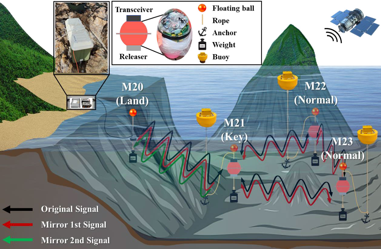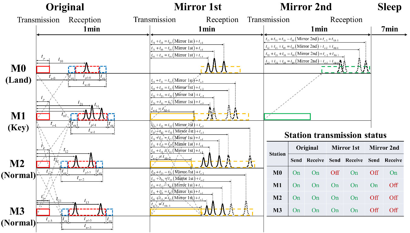 A A A Volume : 46 Part : 1 Proceedings of the Institute of Acoustics Ocean current observation with mirror-type underwater acoustic tomography sensing network Guangming Li, National Innovation Institute of Defense Technology, Beijing, China Dexin Zhao, National Innovation Institute of Defense Technology, Beijing, China Shijie Xu, Zhejiang University, Zhoushan, China Pan Xu, National University of Defense Technology, Changsha, China Luwen Meng, National Innovation Institute of Defense Technology, Beijing, China Ge Niu, National Innovation Institute of Defense Technology, Beijing, China 1 INTRODUCTION Sound wave is a basic tool for information transmission and communication in marine environment, which can also be used in ocean dynamic process observation. Ocean acoustic tomography (OAT) is an advanced technique for observing marine environment via signal travel time delay variations, it was first proposed by Munk [1]. Woods Hole Oceanographic Institution successfully observed three-dimensional (3D) structure of mesoscale eddies at the first OAT experiments in Bermuda Sea [2]. Coastal acoustic tomography (CAT) was developed by Kaneko, Hiroshima University based on OAT for shallow water observations at coastal region [3]. OAT reconstructs flow and temperature fields using long-distance acoustic signal transmission via ocean acoustic channel [4-8]. Compared with deep sea environment, the acoustic field in shallow sea area is more complex and variable. Different from fix-point measurement using Acoustic Doppler Current Profiler (ADCP), Conductivity Temperature Depth system (CTD), PIES, etc., acoustic tomography is a more efficient way to reconstruct 2D or 3D results with acoustic stations [9-10]. In recent years, new CAT observations and methods were developed. Park et .al proposed a new method for vertical temperature profile estimation using sea surface temperature, near-bottom temperature and water depth based on CAT. They successfully obtained monthly temperature variations in the southern coastal region of Korea with mean root-mean-squared difference for February, May, August, and November were 0.23, 0.30, 0.50, and 0.24℃ , respectively [11]. Minmo Chen et. al reconstructed two-dimensional flow fields using a coast-fitting inversion model of five- station reciprocal transmission and obtain the M2 and M4 tidal currents and the residual current [12]. Ze-Nan Zhu, et. al successfully observes two complete flood processes of the Yangtze River via two CAT systems with synchronized transmission [13]. Mirror-transponder costal acoustic tomography (MCAT) is a further development of traditional CAT, its key point is to obtain the sound wave reciprocal transmission information by signal mirror transferring [3]. It is an innovative method for underwater signal receiving by solving the travel time between station pairs through the mirror signal after networking transmission. Thus, the underwater signal transmissions can be obtained with one land station, which simplifies experimental setting and forms the networking array observation model. MCAT was initially applied for two-station transmission experiments. Chen et. al first introduced the MCAT system, and performed a feasibility experiment by the minimum unit (one land and one key station) in the Nekoseto Strait of the Seto Inland Sea, Japan. The experiment prove performance of MCAT via the root-mean-square error (RSME) of the hourly mean range-average currents calculated by mirror travel time is significantly smaller than the variation ranges of the semidiurnal tidal current [14]. Syamsudin et. al successfully observed the subsurface structures of internal solitary waves via two MCAT over a path length of 18.286 km in the Lombok Strait, Indonesia, and reconstructed temperature profiles by four layer-averaged which temperature peaks is synchronized with the diurnal tides [15]. The station types in MCAT experiment are divided into land station, key station and normal station. In general CAT experiments, acoustic stations are deployed at same depth and fixed by a anchored boat. However, in MACT experiments, key and normal stations are designed as shallow markers, which are deployed at deep sea. The land station is placed in the shallow water near shore, key station is placed between land station and normal station for signal transferring. The non-fully depth region derived from land to ocean is the most suitable observation area for MCAT with the most significant environmental variations. But the area is not applicable for CAT due to the fluctuated terrain and complex shallow acoustic channel. Thus, mirror signal transmissions have advantages in shallow sea. 2 MIRROR RECIPROCAL TRANSMISSION MODE The mirror reciprocal transmission mode of MCAT is combined with a land station, a key station and several normal stations. The core of this model is the travel time obtained through mirror-type signals transmission via key and normal stations. In a stranded multi-station remote sensing system, different station has its role: land station is deployed near shore and can obtain mirror data, key station is the offshore autonomous underwater station which is used for mirror reciprocal transmission with normal stations and transferring received data to land station, normal station is also the offshore autonomous underwater station which is used to reciprocal transmitting between normal and key stations. During the mirror transmission, three signal sending and receiving exist between station-pairs, which named original signal, mirror 1st signal and mirror 2nd signal. Figure 1: Time chart for reconstructing travel times between land (M0), key (M1) and normal (M2-M3) stations. Red solid and dashed rectangular boxes are transmit pulses and receiving windows in original transmission, respectively. Blue dashed rectangular boxes are extra record time. Yellow solid and dashed rectangular boxes are mirror transmit pulses and receiving windows in mirror 1st transmission. 