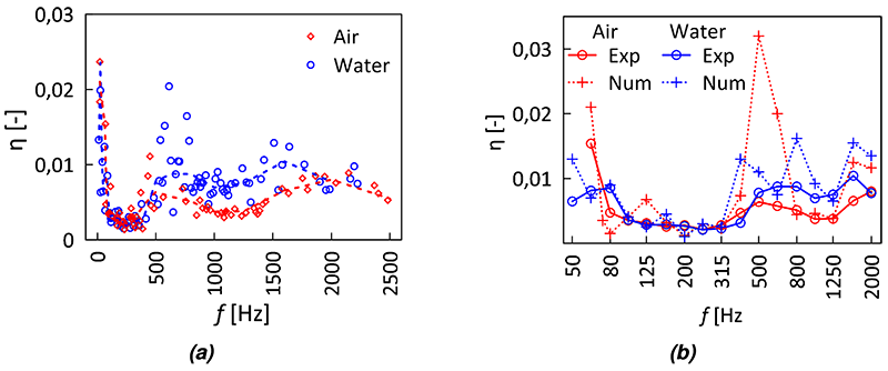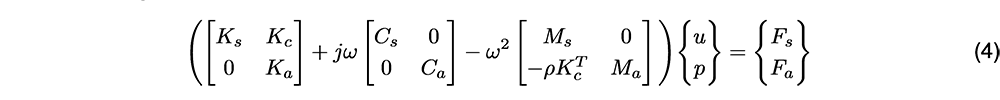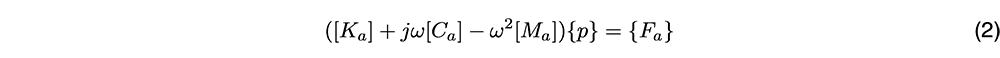 A A A Volume : 46 Part : 1 Proceedings of the Institute of Acoustics Model tuning of a vibrating plate in contact with water G. Rognoni, Dept. of Engineering and Architecture, University of Trieste, Trieste, Italy L. Moro, Dept. of Ocean and Naval Architectural Engineering, Memorial University of Newfoundland, St. John’s, NL, Canada M. Biot, Dept. of Engineering and Architecture, University of Trieste, Trieste, Italy 1 INTRODUCTION The underwater environment experiences an increasing anthropogenic influence, manifesting in amplified noise pollution. Together with noise pollution, the international community concern is also growing. Jalkanen et al.1 showed an increasing trend in underwater acoustic energy emitted by ships in most ocean areas, although by different scaling factors, between 2014 and 2020. Reversing this trend should be the primary goal of national and international jurisdictions through the creation of regulations on noise pollution control. Smith and Rigby2 illustrated an exhaustive list of countermeasures, examining underwater noise sources, discerning principally between hydrodynamic noise generated by the propeller and noise generated by the machinery on board. These countermeasures are technical interventions aimed at making the ship quieter. There are other possible solutions, such as reducing speed, re-routing, and constant maintenance3. Within this context, a Ph.D. project started at the University of Trieste to study and evaluate the possibility of using acoustic metamaterials (AMM) to mitigate structural vibrations and reduce underwater radiated noise from ships. AMM constitutes innovative solutions for acoustics and vibration control, and the scientific interest around them has increased in the last twenty years. One typology of AMM is called Acoustic Black Holes (ABH). Introduced by Mironov4 in 1988, they are now the focus of renewed interest for their potential. During the last two years, the Ph.D. activity mainly focused on exporting this technology from a laboratory to an operational environment5. To do this, we developed a strategy based on a series of experiments to test our prototypes on different structures, from small-scale sub-panels to large-scale ship mock-ups6. The first of these tests evaluated the reduction of vibration and radiated sound of a plate when four ABHs were installed. The plate was tested in two different configurations: hung in the air (dry condition) and hung with a face in contact with water (wet condition). This paper reports the preliminary results obtained on a bare plate without dampers. In particular, the paper focuses on developing a numerical model that can replicate the response of a vibrating plate when in contact with the water. The model will then be used to predict the ABH mitigation effect. The literature on tests on plates vibrating in water is almost entirely focused on the match between experimental, analytical, and numerical modes of vibrations7,8. The current numerical software are able to predict the fluid contribution to the system dynamic with good accuracy; what lacks reliable data is the quantification of the water-added damping. Water-added damping depends on many factors: change in mode-shape due to fluid pressure, vortex shedding, viscosity, flow velocity, surface roughness, the proximity of the nearby structure, and submergence level9. Within the listed factors, viscosity is indicated as having a major critical role in reducing vibration levels. It is assumed that dissipation due to viscosity happens at a fluid-structure interface in a thin boundary layer. We highlight the role of viscosity as the typical approach to modelling fluid-structure interaction disregards this particular quantity, which is then incorporated by means of loss factor, a dimensionless quantity often obtained from measurements10. The paper is organized as follows: section 2 briefly describes the theoretical and numerical modelling of fluid-structure interaction (2.1), the experimental activity carried out (2.2), and FE model (2.3), focusing on the updating logic selected for this specific case; the results obtained, the loss factor of the system, the surface velocity and the radiated pressure of the plate, are illustrated in section 3, followed by the discussion in section 4, and conclusions 5. 2 METHODS 2.1 Fluid structure interaction modelling in FEA Fluid-structure interaction concerns physics problems involving mechanically-excited elastic structures entirely or partially submerged by a fluid. The elastic structure is generally modelled by finite elements (solids, shells, membranes, beams, rods). In contrast, the fluid can be modelled using different methods: finite elements (adopted in this paper), boundary elements, infinite elements, matrix or analytical techniques11. The modelling presented here is implemented in the Hexagon Actran software used for the numerical calculations in this paper. The formulation chosen for the fluid is Eulerian, meaning that a scalar, the pressure, describes the fluid response, while the elastic structure response is described by the displacement vector. Pressure in the fluid must satisfy the wave equation (Eq. 1): where ∇2 is the Laplacian operator, p the pressure, and c the fluid sound speed. The fluid is treated as a compressible, inviscid, non-flowing medium; the fluid is described by volume finite elements defined using the Galerkin approach. The procedure at the base of the FE formulation used in Actran is reported in detail by Cesari12 or Desmet and Vandepitte13. The fluid medium is discretized by three terms which, in analogy to the elastic structure, are called: acoustic stiffness matrix Ka, acoustic damping matrix Ca, and acoustic mass matrix Ma (Eq. 2): Fa is the external force vector applied to the fluid. Although the names of these three matrixes recall those of the same components in the elastic structure FE formulation, they represent something different. The construction of these 