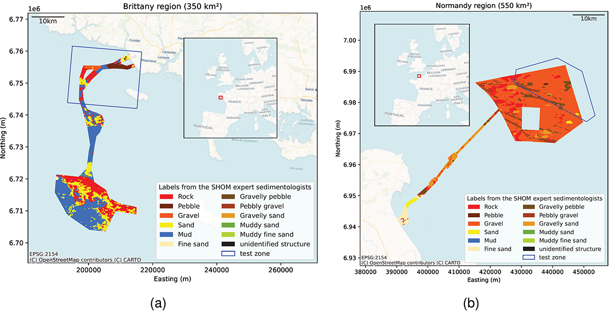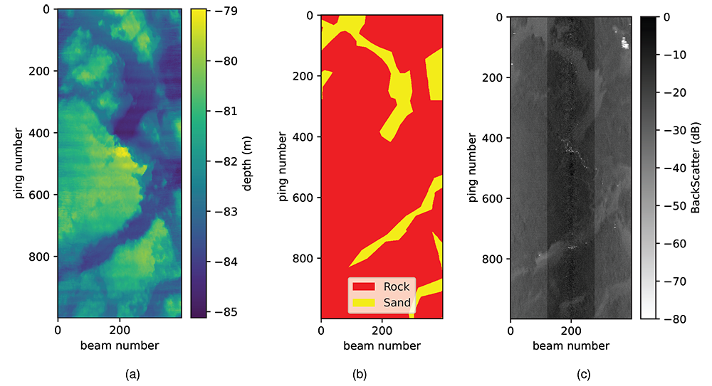 A A A Volume : 46 Part : 1 Proceedings of the Institute of Acoustics A deep segmentation approach for multibeam echo sounder backscatter data based on seafloor type H. Moreau, Lab-STICC UMR CNRS 6285, ENSTA Bretagne, Brest, France S. Homrani, Lab-STICC UMR CNRS 6285, ENSTA Bretagne, Brest, France I. Mopin, Lab-STICC UMR CNRS 6285, ENSTA Bretagne, Brest, France J. Le Deunf, Service Hydrographique et Océanographique de la Marine, Brest, France J. Bignon, Service Hydrographique et Océanographique de la Marine, Brest, France G. Le Chenadec, Lab-STICC UMR CNRS 6285, ENSTA Bretagne, Brest, France 1 INTRODUCTION Characterising the seafloor has many applications, including geology, deep-sea mining, and benthic habitat characterisation. To obtain large-scale information on the seabed, multi-beam echo-sounders (MBES) are often used. However, interpreting these sensor data is not trivial. Many publications tackle the problem of sediment type prediction using multibeam echosounders. Methods are diverse, including machine learning algorithms such as fully-connected neural networks8, Random Forest2,6 or explicit statistical modelization with Gaussian Mixture Models7 or Conditional Random Fields1. They rely on a certain amount of handcrafted features, values which are representative of the problem to solve. When dealing with MBES measurements, features can be derived from soundings (depth, slope, roughness) or from the seabed acoustic responses, often called backscattering strength (BS), both measured simultaneously during a survey. However, the relationship between BS and sediment properties is complex5 and despite recent advances10, designing the right features to provide a machine learning model is not a solved problem. One way to circumvent this hurdle is to use deep neural networks, a family of algorithms known for their ability to simultaneously produce features and classify the samples. However, deep neural networks, used as-is, require vast amounts of labelled data. A common way to obtain labels for the seafloor is to use either grab samplings, photo, or video evidence. These methods allow for a highly detailed characterisation of the seafloor, but they are limited to punctual measurements. In contrast, the areas covered by bathymetric or mosaic maps are much wider. This means that even by assigning a label to a set of nearby soundings6, the amount of labelled data is bound to be much smaller than the number of soundings. One alternative to the problem chosen by Garone et al 4 is to use sedimentary maps drawn by experts (covering the whole study area) instead of using directly objective measurements like grab samplings. The authors trained a convolutional neural network to perform a two-class problem (bedrock/non-bedrock) using these labels. It resulted that the depth (along with its derivatives like the slope) was more efficient than the backscatter for a neural network to predict the seafloor sediment type from. The present article aims at exploring the use of supervised deep neural networks to predict a seafloor type using backscatter and/or depth data provided by a MBES. We work on data organised as a [ping, beam] matrix. This publication is organised as follows: Section 2 describes the data, the area of study and the process employed to create the labels. Then, section 3 describes the practical implementation of the neural network, before section 4 presents the results. We conclude with some ways our work can be improved in Section 5. 2 DATA DESCRIPTION The study area consists of two zones located off France, on the continental shelf in the east of the Atlantic Ocean and in the west of the English Channel (see Fig. 1). The survey was carried out by the French hydrographic and oceanographic service SHOM (Service Hydrographique et Oc´eanographique de la Marine). Raw MBES data is a series of pings, measured at each position of the vessel. Each ping contains a fan of several beams containing one sounding and one backscatter value per beam. Even though the entire area was surveyed using multiple echosounders, we focus on the lines where the Kongsberg EM710 is used which represents 89.6% of the total number of soundings. With this MBES, data was recorded using a dual-swath mode, i.e. different frequencies are transmitted between central and lateral sectors and between swaths. They alternate between 70 − 90 − 70 kHz (for the left, central, and right sectors, respectively) and 80 − 100 − 80 kHz . Even though the seafloor acoustic response is known to depend on transmitted frequency and incident angle of the acoustic transmitted pulse on the seafloor, we concatenate all data into a single image, and let the neural network learn to deal with this data. MBES data used are not calibrated in amplitude 3 which explains the sharp differences between transmit sectors on backscatter in figure 2. Figure 1: Maps of labels provided by expert sedimentologists of SHOM. We delimit two test zones to make sure the results are evaluated using data from a different location than the training data. Because MBES raw data are directly used, outliers are present in soundings and backscatter measurements. Thus, before integrating data to the network, a filter on the depth of the soundings is applied: depths larger than 300 m (three times the maximal depth observed in both regions) are removed. As neural networks do not accept missing values, the sounding depth data is interpolated using a median filter applied in the [ping, beam] geometry. No filter is applied to backscatter measurements. Figure 2: Example of raw data in [ping, beam] geometry: (a) sounding depth, (b) label, (c) and backscatter from a single survey line with Kongsberg EM710. 2.1 Projection of label georeference map in echosounder geometry In order to label the data with sediment types, we use labels of expert sedimentologists shown in figure 1 as ground truth. These labels maps are derived following the SHOM usual procedure: 1) using complement