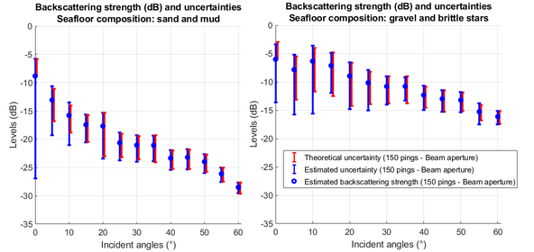 A A A Volume : 46 Part : 1 Proceedings of the Institute of Acoustics Metrology of the acoustic seafloor response: How to accurately estimate backscatter and its intrinsic uncertainty using single-beam echosounder I. Mopin, ENSTA Bretagne, UMR 6285, Lab-STICC, France G. Le Chenadec, ENSTA Bretagne, UMR 6285, Lab-STICC, France M. Legris, ENSTA Bretagne, UMR 6285, Lab-STICC, France Ph. Blondel, University of Bath, Department of Physics, United Kingdom B. Zerr, ENSTA Bretagne, UMR 6285, Lab-STICC, France J. Marchal, Sorbonne Université, UMR 7190, Inst. J. le Rond D’Alembert, France 1 INTRODUCTION Acoustic seafloor response has become the key parameter for many if not most marine surveying communities. Its measurements have been widely extended in hydrography using predominantly bathymetric echosounders, and are used in diverse applications such as habitat mapping, seabed characterisation and classification. In parallel, numerous theoretical models have been developed in recent decades to study its link with physical or heuristic bottom parameters. Measurements of seabed backscatter, its related applications and its theory are three separated but inter-connected domains dealing with the seafloor acoustic response. The metrologic work presented in this paper proposes to link these three approaches of the seabed backscatter. While analysing how these three domains deal with the backscatter, it appears that the nature of the acoustic seafloor response itself is equivocal. Based on statistical and physical hypotheses, a metrological definition of the backscatter is established in section 2, connecting seafloor response measurements, applications and theory. In particular, the deterministic backscatter parameter derived theoretically is usefully linked to the stochastic nature observed in practice during backscatter measurements. This yields in section 3 a method for accurately estimating backscatter from echosounder data: the best choice of backscatter estimator is justified based on analytical calculations, and ways to represent its uncertainties are proposed. Finally, section 4 shows an example of application of the identified best backscatter estimator and of its uncertainty formulation and estimation using single-beam echosounder data8. 2 METROLOGIC DEFINITION OF SEABED BACKSCATTER In most literature on the seafloor acoustic response, it is mainly named, described, modelled, and processed as a single scalar value. This value was observed2 and proved9 to be dependent of the incidence angle θ i of an acoustic signal on the seafloor and of its frequency f. We call it in this paper "seabed backscattering strength" or "backscatter" which involves monostatic measurements. Shorten as BS or BS (θ i , f ), its angular variation is known as ARC10 (angular response curves). Considering an incident intensity Ii scattered by a unit area of seafloor A1 = 1m2 at a reference range r1 = 1 m, the backscattering strength is usually defined as a surface index as the ratio in decibels14: where Is is the intensity scattered by the unit area of the seafloor. 2.1 Three domains dealing with seabed backscatter Theoretical backscattering strength models are numerous6 and mainly assume the seafloor as an interface between the sea water and the sediment. This interface can have different properties (flat, rough, penetrable...) depending on the application and which details the user is interested in. In the main literature BS (θ i, f ) is considered deterministic i.e. at a given angle, frequency and seafloor nature corresponds only one value of BS. Similarly, in practice, the backscatter is derived from echosounder measurements using a sonar equation yielding the deterministic parameter: where EL is the received echo level, SL is the source level of the echosounder, DITx is the transmission directivity index, TL is the transmission loss between the echosounder and the seabed, Gcalib is the calibration gain of the echosounder, A is the instantaneous insonified area on the seafloor. However, when observing BS measurements, a large variability appears4. It is due to two main sources: external phenomena with no relation to the seafloor (changes in echosounder characteristics, environment modifications, etc.) and specific characteristics of the seafloor (temporal changes of the seabed, geographical variations, spatial variabilities in the echosounder beam footprint, intrinsic variability of the scattering mechanism). The first source impacts are restricted by frequent measurements of the environment parameters (sound speed, absorption) during surveys and by performing echosounder calibrations as often as possible. In order to limit the impacts of the second source, time and spatial spread of the analysed data can be reduced. However, the intrinsic randomness of the scattering process will remain. This random process, detailed in section 2.2, leads inevitably to a random backscattering strength. Consequently, from this point of view the seafloor acoustic response is a random variable which mean and variance are specific to a seafloor type (at a given incidence angle and frequency). 2.2 Link between deterministic and stochastic backscatter natures In order to link the two equivocal natures of the backscattering strength described previously, the scattering process is modeled using a point-scattering model1. It is based on the assumption that the seafloor area A insonified instantaneously by the echosounder is composed of individual scatterers that contribute to the final backscattered signal. The complex amplitude As of the signal received by the echosounder is then a random variable that depends on the seafloor scatterers characteristics. Linearly, the deterministic sonar equation can be written as: where Ceq.so is a constant including all sonar equation parameters (systems and environment), Aiis the amplitude of the transmitted signal (at the echosounder front), and A is the complex backscattering strength amplitude whic
