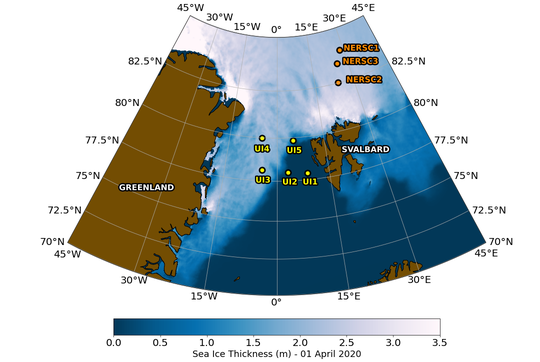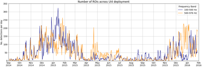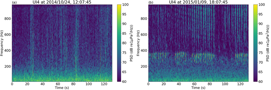 A A A Volume : 46 Part : 1 Proceedings of the Institute of Acoustics Automatic identification of biophonics and sea ice processes in large datasets from the High Arctic Ocean J Cleverly, Department of Physics, University of Bath, Bath, Somerset, UK Ph Blondel, Department of Physics, University of Bath, Bath, Somerset, UK H Sagen, Acoustic and Oceanography Group, Nansen Environmental and Remote Sensing Center, Bergen, Vestland, Norway M Dzieciuch, Scripps Institution of Oceanography, University of California San Diego, San Diego, California, USA E Storheim, Acoustic and Oceanography Group, Nansen Environmental and Remote Sensing Center, Bergen, Vestland, Norway 1 INTRODUCTION Accelerated climate change in the Arctic region is leading to major modifications to its underwater soundscapes 1. With the reduction of sea ice coverage across seasons, marine mammals are having to adapt their migratory behaviours2,3 and waters are opening up for maritime industries4,5, phenomena which can be monitored acoustically. Advancements in offshore technology for the challenging Arctic conditions have allowed for multi-sensor moorings to run continuously across seasons, in particular with hydrophones for acoustic thermometry and to better understand local soundscape variations. However, the accumulation of data requires automation in processing to identify times featuring processes of interest. The terrestrial ecoacoustics community is facing the same issue of ”big data” 6, but they have developed acoustic indices to concisely summarise temporal and spectral variations within audio recordings, which can then be used to determine levels of biodiversity. Acoustic indices have been successfully implemented in ecological studies across a range of terrestrial environments, although their application to marine environments has not yet been widely accepted, with most studies considering coastal and coral reef ecosystems7,8, while only a few deep-water ecosystems have been considered9. The use of acoustic indices to study Arctic soundscapes has yet to be explored10, with few observations into how they respond to the highly variable sounds from sea ice processes. Recent ecoacoustic studies in the Southern Ocean were successful in obtaining insightful biodiversity findings despite the presence of sea ice sounds, but this is still a topic that needs further assessment11. This study investigates how acoustic indices can be used as a preliminary marker for seasonal trends of biophony and sounds from sea ice processes (hereinafter ”cryophony” and ”cryophonics”) within large acoustic datasets. Data was taken from the long-term research projects “Acoustic Ocean Under Melting Ice” (UNDER-ICE, collecting data across the Fram Strait from 02/09/2014 to 06/03/2016)12 and the “Coordinated Arctic Acoustic Thermometry Experiment” (CAATEX, collecting data along the Eurasian Basin from 31/08/2019 to 02/08/2020)13. Mooring positions for both experiments are presented in Figure 1, along with satellite data of sea ice thickness across the region in April 2020. As whale presence and migratory patterns in the Arctic are influenced by climate change, there was interest in detecting their vocalisations, especially those of bowhead whales (Balaena mysticetus). To count individual vocalisations in the UNDER-ICE dataset, we use energy analyses and image processing of the individual spectrograms. Figure 1: Mooring positions for UNDER-ICE (UI1-5)12 and CAATEX (NERSC1-3)13 experiments across the Fram Strait and Eurasian Basin. Sea ice thickness across the region in April 2020 is measured by the Copernicus programme14,15,16. Map created using Cartopy17). 2 METHODOLOGY 2.1 Data Processing UNDER-ICE acoustic measurements were made at a sampling rate of 1,953 Hz, with two recordings of 130 s separated by a few minutes, every 3 hours. The moorings were 230 to 570 m deep along the Fram Strait, the Arctic Ocean’s only deep water connection to the rest of the world ocean, therefore experienced pulldowns from strong ocean currents, causing a significant amount of self-noise from cable strumming across the duration of the experiment18. The UI4 mooring was least affected by self-noise and selected for analysis here. Recordings from CAATEX were captured every 12 hours at 976 Hz sampling frequency, each with a duration of 45 minutes and 12 seconds, each mooring featuring two time synchronised hydrophones. Every 3 days, an acoustic thermometry signal was transmitted from NERSC1, dominating the first 17 minutes of recording. These segments were removed to evaluate the seasonal trends of acoustic indices. Spectrograms were computed on segments 2 s long for the acoustic indices study and 0.1 s long for the whale vocalisation detection study. In both studies, the spectrograms used 50% overlap and Hann windows, in line with PAMGuide practice 10,19. Hydrophone calibration was provided by NERSC: receiving sensitivity of -168 dB re 1 µPa, 12 dB gain and analogue-to-digital conversion voltage of 2.5 V. Spectro-grams of typical cryophony and biophony are given in Figure 2. Figure 2: Example spectrograms of cryophony (a) and bowhead whale calls (b), made with be- spoke code inspired by PAMGuide19 and PAM2Py20. 2.2 Acoustic Indices Acoustic indices were computed using scikit-maad, an open source soundscape analysis package written in Python21,22. A variety of popular acoustic indices were considered for the study, including the Acoustic Complexity Index (ACI)23, the Acoustic Diversity Index (ADI)24, the Acoustic Evenness Index (AEI)24, the Acoustic Richness Index (ARI)25, the Biodiversity Index (BI)26 and Acoustic Entropy (H)27. While not an established acoustic index, the zero-crossing rate of the signal (ZCR), i.e. the rate in which the signal amplitude changes sign, was also computed as it can be used to emphasise impulsive or ”percussive” sounds in the signal28, which may have potential for highlighting transient-like cryophonics. Constitue