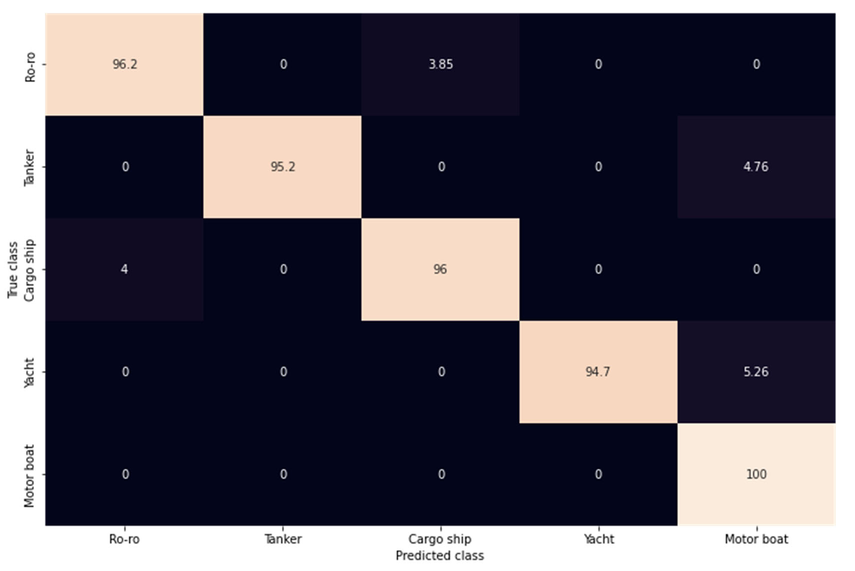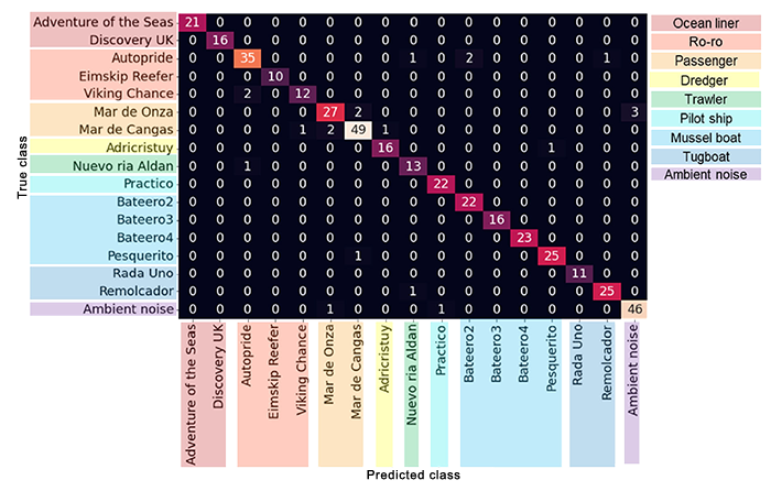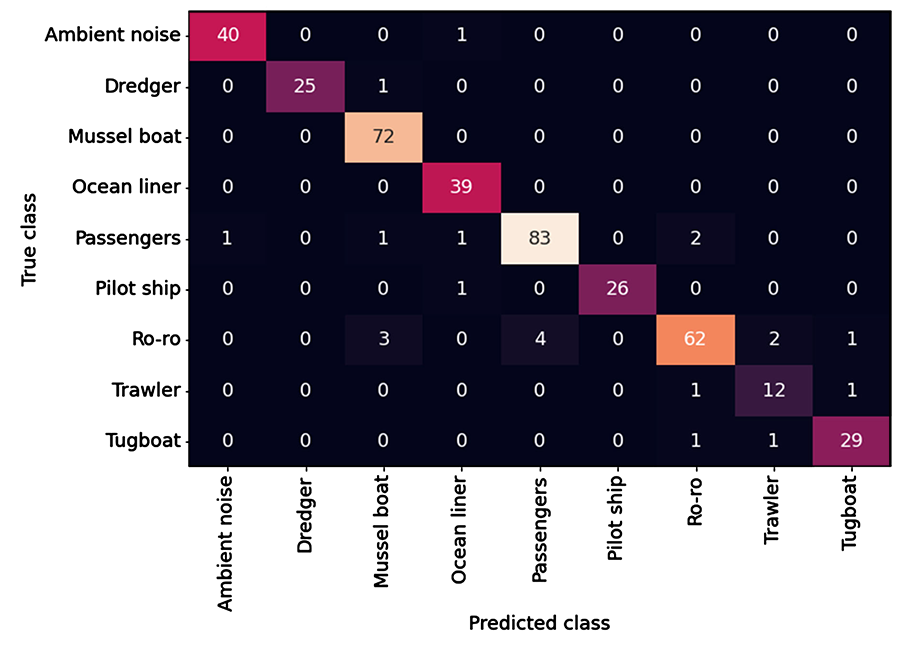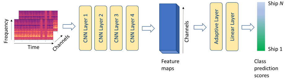 A A A Volume : 46 Part : 1 Proceedings of the Institute of Acoustics Classification of ships from underwater sound using a deep learning network Jari Kataja, Patria, Tampere, Finland Petri Pirttikangas, Patria, Tampere, Finland 1 INTRODUCTION Ships and other watercraft produce sound that can be detected by underwater sensor systems such as sonar. Traditionally, the classification of ship noise has been a task of well-trained sonar operators, and it has been done based on human hearing. Therefore, the development of reliable identification and classification systems plays an important role. The focus of technical development has been on feature extraction methods and training the classifier1. Feature extraction works as an essential part of a deep-learning network to identify the origin of detected underwater noise. Features obtained from MFCC coefficients (Mel Frequency Cepstral Coefficients) or the logarithmic Mel spectrogram have been widely used in the classification of environmental sound2. They, together with features extracted from LOFAR (Low Frequency Analysis and Recording) spectrograms, are also well suited for underwater acoustic identification3,4,5. In the Mel spectrogram, the frequencies of the audio signal have been converted to the Mel scale, which better represents the frequencies perceived by humans. In this paper, Mel spectrograms were chosen as the input for classification. The sound transmission path from the ship to the observation point is complex, which poses its own challenge for ship classification. Getting as comprehensive set of samples as possible for training the classifier is therefore crucial. Another important issue is the robustness of the system, including the ability to correctly classify targets and minimize false alarms. 2 UNDERWATER ACOUSTIC EMISSION OF SHIPS Ship noise can be generally divided into machinery and hydrodynamic sound, as shown in Figure 16. Machinery noise is generated by various rotating machines, such as main and auxiliary engines. It is essentially narrowband and has low-frequency content, typically below a few kilohertz. Hydrodynamic noise is caused by interaction of the ship hull and propellers with the surrounding water, and it is broadband by nature. Figure 1: Ship noise components. Figure 2: Variation of some noise components with respect to ship speed. Ship noise sources generate sound at different intensities as a function of the speed (Figure 2)7. Source levels and nature depend on the type of both the vessel and its propulsion system. At slow speed, machinery noise dominates the underwater noise emission, while at high speed, flow noise due to boundary layer and propeller cavitation become dominant. In addition to this, the ship is not omnidirectional as a sound source, but the observed sound depends on the orientation of the ship relative to the observation point. Observing ship noise generally requires multiple measurement points and a moving vessel8. Figure 3: Background noise types. The observed sound always contains background noise (Figure 3). At the infrasound range, noise is caused by seismic activity, temperature changes, ocean currents and tides. Low-frequency noise from distant shipping is dominant at a frequency range below a few hundred hertz. Noise caused by wind consists of wind turbulence, water surface movement, wave interaction, spurts, and bubbling. It is often presented as curves, at which different wind speeds indicate different sea states, as developed by Knudsen. In addition to the noise components presented above, the observed sound is affected by acoustics of the underwater environment, involving distance attenuation as well as surface and bottom reflections.9 3 CLASSIFICATION OF SHIP NOISE 3.1 Ship noise data and pre-processing For classification, data was first achieved using a ship noise simulator, which can generate realistic sound for various vessel types from a motorboat to a cargo ship. The simulated noise consists of the components shown in Figure 1, weighted characteristically for the vessel type. Simulation data was also filtered due to distance attenuation and background noise was added (Figure 3). By varying distance and background noise components, data variation was increased, although the effect of the ship's orientation was not considered. Data was generated for five vessel types, representing a ro-ro, a tanker, a cargo ship, a yacht, and a motorboat. The second data set acquired for the classifier contained measurement data from various ships near the Spanish city of Vigo. The recordings were made with a set of hydrophones of many types of vessels, sixteen in total. The ships belonged to eight vessel types from a pilot boat to ocean cruisers. In addition, there were measurements of background noise, which was used as one class.10 Data preprocessing began with the creation and naming of consistent audio samples. Consistency means that every sample has the same data length, number of channels and sampling frequency. The data was also split into training and validation sets, in 80–20 ratio, the former of which is used to train the classifier and the latter to verify its performance. After that, the samples were augmented by shifting them randomly in time either forwards or backwards. Mel spectrograms were then computed from the samples, and they were augmented by masking random time or frequency ranges. With augmentation, data variability was increased. Data augmentation can also combat overfitting and improve the generalization ability of deep neural network11. 3.2 Deep learning classifier The classification of spectrogram images was carried out with the CNN (Convolutional Neural Network) structure shown in Figure 4. Such structure has been used e.g. for urban noise classification12,13. Each CNN layer applies its filters to increase the image depth, i.e., the number of channels. The image width and height are reduced as the kernels and strides are applied. Finally, after passing thro