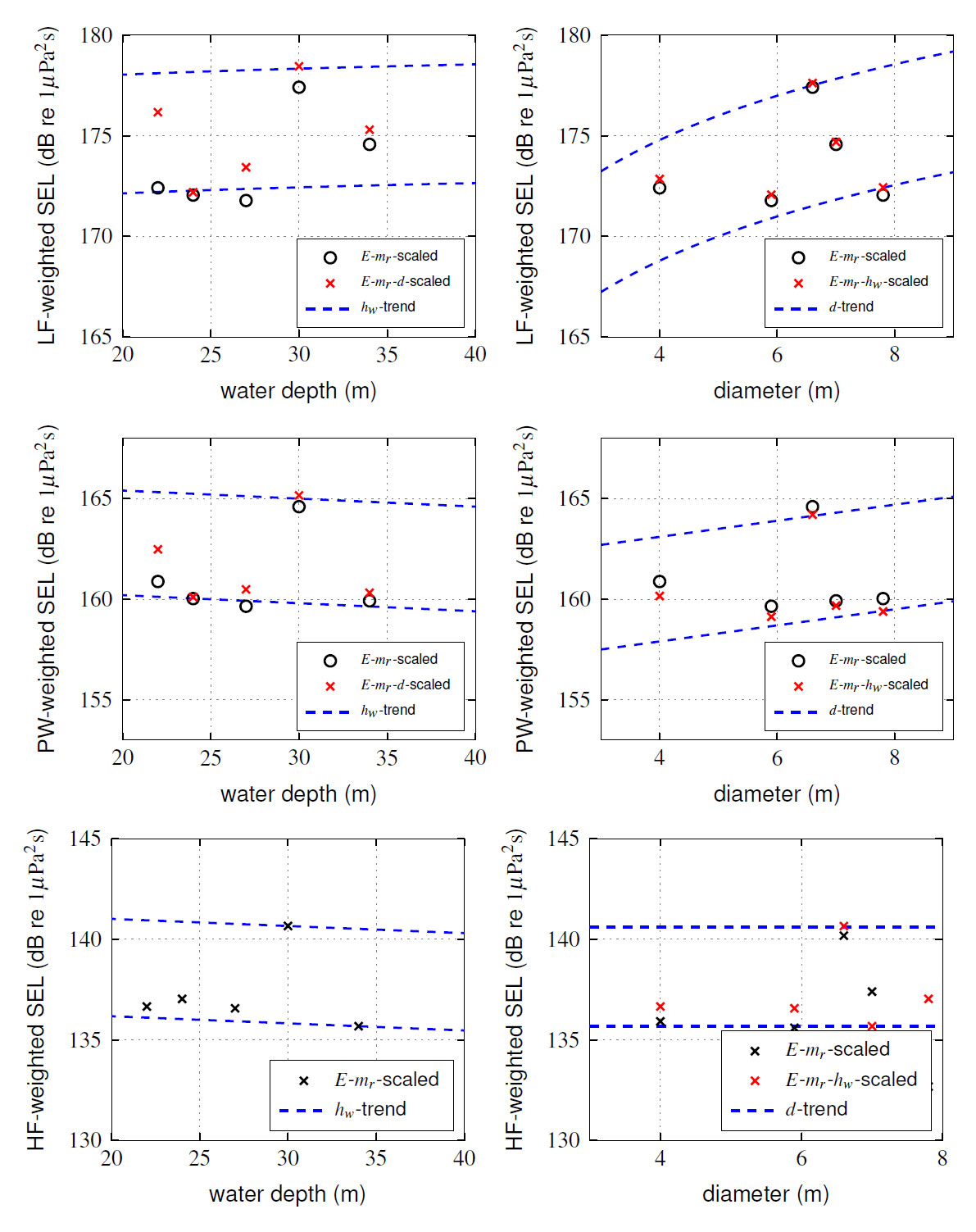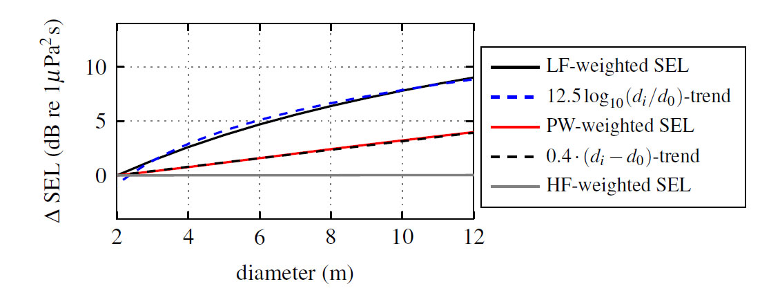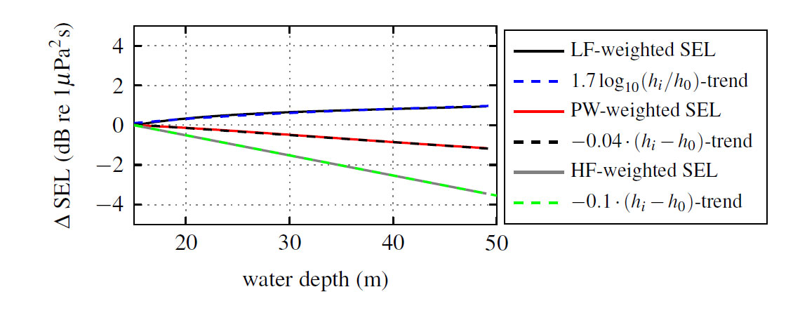 A A A Volume : 46 Part : 1 Proceedings of the Institute of Acoustics Scaling offshore pile driving noise: Application to frequency weighted sound levels J. von Pein, DHI Wasy GmbH, Hamburg, Germany M. Ram, DHI Wasy GmbH, Hamburg, Germany F. Thomsen, DHI A/S, Hørsholm, Denmark 1 INTRODUCTION The biological impact of pile driving noise during the installation of offshore wind turbines is one of the key issues for the environmental management of marine renewable energies in Europe and beyond. Pile driving leads to relatively high impulsive noise emissions into the water, which can be a potential threat to marine life. Therefore, the accurate prediction of the emitted acoustical energy is a prerequisite for any biological risk assessment of offshore pile driving noise. Usually, numerical or empirical models based on measurements are used to assess the sound exposure level (SEL) that is emitted into the water column during piling1,2. Both approaches have the disadvantage that only few institutions and experts have access to them. As an alternative that is available for all regulators as well as the industry, scaling laws have been developed that are applied to existing data to estimate the emitted sound during offshore pile driving. The scaling laws define the dependence of the broadband SEL on the strike energy E, pile diameter d, water depth hw , and ram weight mr for scenarios without noise mitigation, see von Pein et al.3. To asses the species specific impact of the emitted sound levels, weighting functions are applied to account for different hearing characteristics4. The ongoing development of scaling laws for the one-third octave band spectrum of the SEL allows for the evaluation of scaling laws for frequency weighted SELs5. The study aims to investigate whether scaling laws derived for weighted SELs have a similar accuracy to those derived for the unweighted SEL3 and thus potentially provide another tool freely available to regulators and industrial professionals. The scaling laws for weighted SELs are derived by applying the identified frequency dependent scaling laws to the average of measured spectra and thus deriving the weighted SEL as a function of pile diameter and water depth. In the following, the frequency dependent scaling laws are applied to weighted spectra to derive a first estimate of the influence of the water depth and pile diameter on the NOAA-LF-, NOAA-PW-, and NOAA HF-weighted SEL4, which are referred to as LF-, PW-, and HF-weighted SEL. The respective weighing functions are shown in Fig. 1. Figure 1: The considered NOAA weighting functions. 2 FREQUENCY DEPENDENT SCALING LAWS The results of the model runs presented in von Pein et al.3 combined with additional model runs are evaluated to derive the dependence of the one-third octave band spectrum of the SEL on the pile diameter and the water depth. It is important to note that the scaling laws derived in the following are based on generalizations, assumptions and numerical model runs that come along with uncertainties. Furthermore, not all effects that may play a role at the considered frequency range are covered within the numerical model and are therefore also not covered within the scaling laws. The influence of the strike energy is assumed to be frequency independent and is scaled with The influence of the hammer type is usually taken into account in detailed numerical models by computing the interaction between hammer and pile. The hammer and pile geometries have a considerable influence on the specific frequency bands, which is hard to generalize. Therefore, the ram weight is also scaled without a frequency dependence by the broadband scaling law 2.1 Pile Diameter The influence of the pile diameter on the one-third octave band spectrum of the SEL is displayed in Fig. 2. Therein the differences between the computed SEL with a diameter of 2 m and results derived with diameters up to 15 m are displayed. It can clearly be seen that the increase at low frequencies is much higher compared to the increase at higher frequencies. This is linked to the higher increase in the radiation efficiency at low frequencies. In order to derive a frequency dependent scaling law the equation is fitted to every individual considered one-third octave band. The resulting frequency dependent coefficient kd ( f ) is displayed within the right plot of Fig. 2. Figure 2: The differences between the computed SEL at a range of 20 m over the center frequencies and the considered diameters (left) and the frequency dependent scaling factors kd ( f ) fitted for every individual frequency band (right). 2.2 Water Depth The influence of the water depth on the one-third octave band spectrum can be separated into four different main effects. The cutoff effect describes the influence of the water depth on the lowest frequency that is able to propagate. Since the affected frequency range is well above the cutoff frequency, this effect is not considered in the following. The water depth in combination with the pile geometry (diameter, length, wall thickness), soil type, and the penetration depth define the modal shapes of the pile. The influence of distinct modes is mainly at frequencies up to 100 Hz. The actual interaction behavior of pile and water depends on several factors such as the pile geometry and soil. An attempt is made to generalize these. However, its influence on the weighted levels is rather small due to the affected frequencies. Frequencies of up to 200 Hz showed in the results that the influence of the water depth can be scaled with the damping term of the Damped Cylindrical Spreading model6 as presented in3. Figure 3: The dependence of the SEL on the water depth evaluated at 20 m derived with 50 different geometry combinations. As shown in Fig. 3, frequencies above 200 Hz show a linear decaying trend in the SEL with increasing water depth. This linear decay becomes more distinct with increasing frequency. 2.3 Application to Measuremen