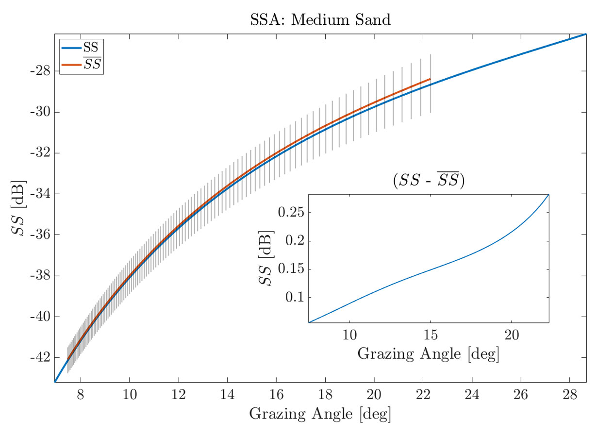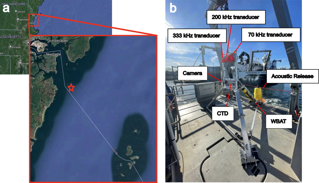A A A Volume : 46 Part : 1 Proceedings of the Institute of Acoustics Temporal variability of high frequency seafloor acoustic backscatter from a sandy site in the Gulf of Maine Kaan Cav, Center for Coastal & Ocean Mapping, University of New Hampshire, USA Jenna Hare, Center for Coastal & Ocean Mapping, University of New Hampshire, USA Anthony Lyons, Center for Coastal & Ocean Mapping, University of New Hampshire, USA John Hughes-Clarke, Center for Coastal & Ocean Mapping, University of New Hampshire, USA 1 INTRODUCTION Active sonar systems are used for many remote sensing applications such as hydrography, seafloor characterization, and target detection. The effective use of these sonar systems is dependent on a robust understanding of the seafloor acoustic response. Previous work has focused on the dependence of backscattering strength (SS) on sediment type, grazing angle, and frequency, however the temporal variability of SS has not been studied as extensively6,15. Two studies that have investigated temporal variability only spanned weeks and did not report SS time series, instead decorrelation methods were used to track temporal variability10,5. Another experimental study investigated how biological activity affected SS over a period of 60 days by introducing animals (e.g. tethered crabs, mollusks, fish, cockle) within the acoustic footprint of the transducer14. Jumars et al.11 investigated a silty area off the coast of Northern California and observed a circadian pattern in temporal SS variability over a period of 49 days that was most likely driven by benthic change. High energy events that occur on various timescales (seconds to years) are known to alter the parameters that affect SS4,9. Seafloor roughness is an important driver of temporal SS change12. For example, near bed hydrodynamics caused by storms can alter seafloor roughness. Biological activity (bioturbation) can both create and destroy roughness elements (e.g smoothing sharp features, reducing bedform heights, deposit feeding)3,9. Seasonal changes occurring on time spans of days to months can be caused by environmental factors such as the presence of sea grass13. This work builds upon previous studies conducted by Catoire4 and Hare et al.7. Research presented here focuses on the analysis of temporal variations in SS observed from a stationary tripod located in a shallow water, sandy region at the mouth of the Piscataqua River, New Hampshire, USA. The data spans the winter of 2022-2023, covering temporal variability of SS on timescales of hours to months. Increasing our understanding of the environmental parameters that drive changes in SS can inform future remote sensing applications, improve model implementation, and support the development of new multibeam calibration techniques. Figure 1: (a) Map showing tripod location (red star) (b) Instruments mounted to custom-made tripod 2 METHODS 2.1 Equipment Data were collected using a stationary platform on the seafloor in the Gulf of Maine near the mouth of the Piscataqua River (Fig. 1a). The deployment was from December 2022 to May 2023. The average depth of the study site was 16 m. Previous research15 found the area to be sandy with median grain sizes ranging between 0.088 mm and 0.125 mm. The platform was a custom-built tripod4(Fig. 1b), with a height (h) of 2.12 m. The tripod was equipped with three transducers that operated at 70 kHz, 200 kHz, and 333 kHz having beam widths of 18◦, 7◦, and 7◦, respectively. Only the 70 kHz transducer was used as a split beam. The transducers were controlled by a SIMRAD Wide Band Autonomous Transceiver (WBAT). Fifty pings with a pulse length of 256 µs were transmitted on the hour, every hour. The tripod was also equipped with a CTD to collect environmental measurements (e.g. temperature, salinity, significant wave height). An Olympus TG-6 underwater camera provided photographs of the seafloor for the first 30 days of the deployment. The photographs of the seafloor show the presence of shell pieces and small bedforms. The transducers are mounted to the tripod so that the grazing angle of their main beams’ with respect to a flat seafloor would be 20◦. The geometry of the tripod allowed us to study a patch of the seafloor that spanned 4 m to 11 m in front of the tripod with the 70 kHz transducer and 4.9 m to 7.2 m with the narrower beam width of the 333 kHz transducer. 2.2 Data Processing The power of the scattered field received by the transducer was internally calculated by the WBAT2. Transducer beam widths were accounted for based on values provided by the manufacturer. The sound intensity levels of the 50 pings were averaged. Scattering strength (Sb) was then calculated using the averaged sound intensity level for each hour and applying area corrections (A), beam corrections (BP) and transmission losses (T L) as seen in Eq. 1. Slant range (R ) was computed using two way travel time and the measured sound speed. Horizontal range (x) was computed using During stormy periods, the acoustic response of the seafloor was sometimes masked, likely due to bubbles or suspended sediment. The data were assessed for loss of seafloor acoustic response using the measured phases from the split beam transducer. For every ping, the phase differences of the split beam were computed. The standard deviation of the phase differences (σ) among the 50 pings was calculated and from that an average of σ from 4-10 m slant range was taken (). Periods of high coincided with storm events. Data above a specified threshold of 0.28 for were rejected. After periods that lacked seafloor acoustic response were removed, 56% of the data remained. When analyzing the phase data from the split beam, a sudden shift in the physical echo arrival angles was observed likely due to settling of the tripod. The physical echo arrival angles relative to the main beam axis were computed from the phase data2. The physical echo arrival angles in the fore/aft direction (θ) were 