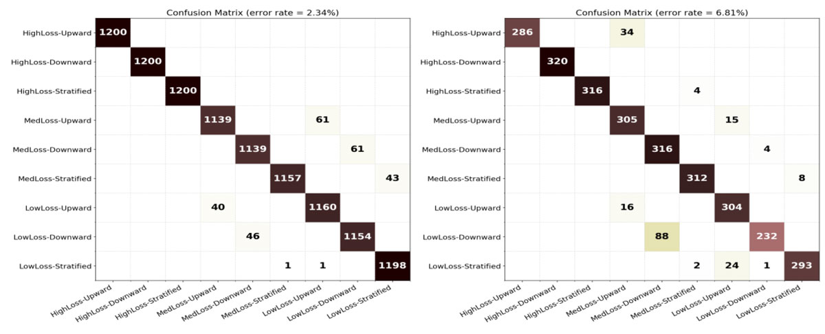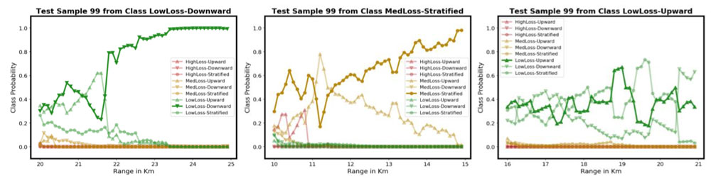 A A A Volume : 46 Part : 1 Proceedings of the Institute of Acoustics Machine learning for classifying the underwater environment from transmission loss data M. Donnelly, Systems Engineering & Assessment Ltd, Beckington, UK M. Tipping, University of Bath, Bath, UK F. Cowie, Airbus Defence and Space, Chippenham, UK Ph. Blondel, University of Bath, Bath, UK 1 BACKGROUND AND MEASURES OF PERFORMANCE Future sonar operations will be increasingly autonomous, including uncrewed vehicles operating over long periods of time in remote areas with little or no mission planning/replanning input from expert operators. Machine Learning (ML) has the potential to support the autonomous repositioning of vehicles for optimising sonar operations. To investigate this potential, work was conducted to develop and test probabilistic ML algorithms for classifying the underwater environment using only acoustic Transmission Loss (TL) data. Environmental classification would then enable appropriate positioning strategies, for example adjusting spacing between distributed sonar systems in order to maintain detection coverage for environments with differing acoustic propagation characteristics. An incorrectly classified environment could lead to inefficient use of sensors (i.e. too closely spaced when the TL in the environment is actually low but is classified as high) or poor coverage (i.e. the reverse). Measures of Performance (MoPs) are required in order to assess the ML classification algorithms. The standard metrics of classification accuracy and confusion matrix were used. In addition, a ‘detection coverage’ MoP was constructed in order to assess the practical impact of misclassification. Given a TL versus range curve, this was defined as the fraction of the ranges for which the TL is less than a fixed Figure of Merit (i.e. the maximum TL which can be tolerated for a given set of sonar, contact and background noise characteristics). It was used to construct a cost matrix which, when combined with the confusion matrix, enabled an overall performance metric to be calculated. The cost matrix was the same size as the confusion matrix, with zeros along the diagonal and the off-diagonal terms calculated from the absolute difference between the detection coverage MoP for the environment classes at the row and column indices (i.e. true versus that selected by the classifier). 2 ENVIRONMENTS AND ACOUSTIC MODELLING The underwater environments were defined by a temperature and salinity profile, a seabed type (with associated density, compressional wave sound speed and attenuation values), and water depths (both flat and sloping seabed topographies were modelled). The oceanographic profiles and water depths were chosen to be representative of the UK North-West approaches’ continental shelf. Temperature and salinity data were obtained from the Copernicus Marine Environmental Monitoring Service (CMEMS). The Atlantic-European North West Shelf Ocean Physics Analysis and Forecast dataset [1] was used, which provided hourly interval forecasts from the Nucleus for European Modelling of the Ocean model, produced by the UK Meteorological Office. Temperature and salinity profiles were downloaded for the location 57.5°N, 8.5°W. Sound speed was calculated from temperature and salinity using the UNESCO standard Chen and Millero equation [2]. Seabed type was taken from the US Naval Oceanographic Office Bottom Sediment Type (BST) version 2 database [3]. The High Frequency Environmental Acoustics dataset was used, which contains 23 descriptive seabed types; the corresponding geo-acoustic parameters were taken from Section IV Table 2 of [4]. Nine classes of underwater environment were defined, corresponding to all permutations of three types of sound speed profile (Upward Refracting, Downward Refracting and Stratified) and three types of seabed (Low Loss, Medium Loss and High Loss). Within each of these classes, multiple variants were created, in order to generate training and test datasets for the ML algorithms. The temperature and salinity profiles used in calculating the sound speed profiles corresponded to a 48- hour period from midnight on the 14th to midnight on the 16th of January 2018 (Upward Refracting), July 2018 (Downward Refracting) and October 2018 (Stratified) – see Figure 1. The bathymetry profiles consisted of flat and sloping seabed variants with constant gradients for the sloping variants. For the training data, 1200 variants were created, corresponding to all permutations of: 16 sound speed profiles, taken from ocean model forecasts every 3 hours over a 48-hour period starting at 0 hours, i.e. at times 0, 3, 6 … 45 hours; 5 seabed types (similar types within the available BST types); 15 bathymetry profiles, both flat and sloping, with water depths between 150 m and 200 m. For the test data 320 variants were created, corresponding to all permutations of: 8 sound speed profiles, taken from ocean model forecasts every 6 hours over a 48-hour period starting at 1 hour, i.e. at times 1, 7, 13 … 43 hours; 4 seabed types, linearly interpolated at the midpoints between the five training variants; 10 bathymetry profiles, similar to but not the same as the training profiles. Hence the test dataset is completely independent of the training dataset. Figure 1: Sound speed profiles: upward refracting (left), downward refracting (centre) and stratified (right). The blue curves are training data, the red curves test data. All profiles go to the maximum modelled water depth of 200m. The sound speed varies over depth by approximately 3m/s, 20m/s and 5m/s for the upward refracting, downward refracting and stratified cases respectively. The Low Loss seabed variants were taken from BST indices 2 to 7 (Rock, Cobble or Gravel or Pebble, Sandy Gravel, Very Coarse Sand, Muddy Sandy Gravel), the medium loss variants from indices 9 to 13 (Medium Sand or Sand, Muddy Gravel, Fine Sand or Silty Sand, Muddy Sand, Very Fine Sand), and the hi
