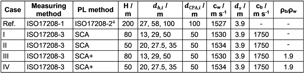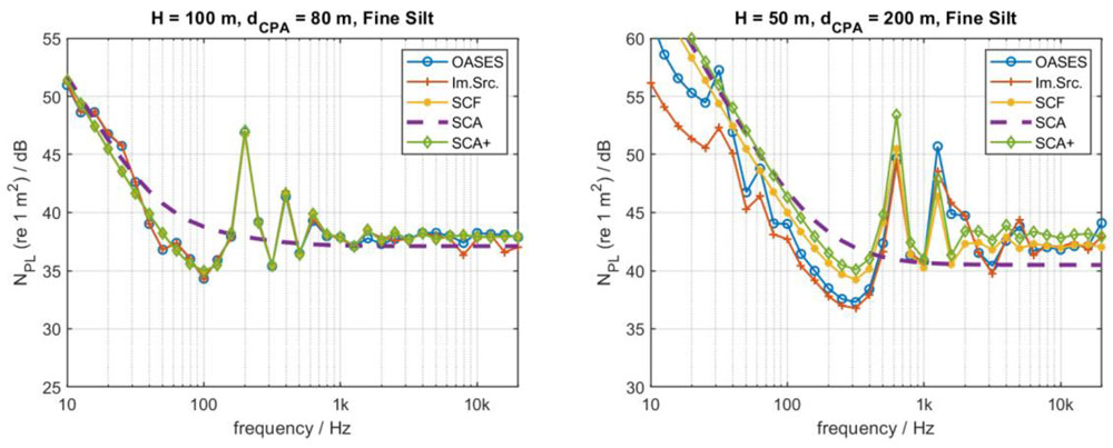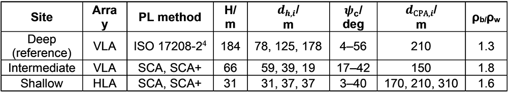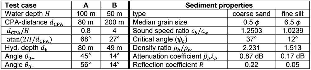 A A A Volume : 46 Part : 1 Proceedings of the Institute of Acoustics Ship source level measurement in shallow water using an enhanced seabed critical angle method MA Ainslie, JASCO Applied Sciences, Schwentinental, Germany AO MacGillivray, JASCO Applied Sciences, Victoria, BC, Canada R Yubero, TSI, Madrid, Spain CAF de Jong, TNO, The Hague, Netherlands LS Wang, NPL, Teddington, United Kingdom 1. INTRODUCTION Distant ships are a dominant source of ambient underwater sound at low frequency (50–100 Hz),1, 2 while nearby ships can cause disturbance at frequencies of multiple kilohertz.3 Measurement of a ship’s source level (SL) is needed for soundscape prediction, for quiet ship certification and for validation of prediction models. An international measurement standard exists for the determination of SL using deep water measurements (ISO 17208-24). A draft international standard (DIS) for measuring SL in shallow water, currently under development (ISO/DIS 17208-35), needs an SL formula that is both accurate and straightforward to implement. The seabed critical angle (SCA) method provides a simple formula for the propagation factor F, as introduced by MacGillivray et al.6 The SCA method is specified by ISO/DIS 17208-35 for converting measurements of sound pressure level in shallow water to ship (or vessel) SL by adding propagation loss (PL) given by The semi-coherent formula (SCF) refers to a semi-coherent image sum method for calculating F using a semi-coherent sum over images.7 The SCA and SCF methods are compared in DIS 17208-3.5 SCA underestimates PL by 1–2 dB at frequencies above about 1 kHz. Our present purpose is to describe a formula to improve SCA. In principle, one could use the full SCF, as specified by Ainslie and Wood,7 but SCF can be simplified, if desired, by approximating the discrete sum over multipaths by an integral. In the following, a formula is presented, referred to as “SCA+”. The SCA+ method is specified in Section 2, followed by its verification and validation in Sections 3 and 4. Conclusions are drawn in Section 5. Underwater acoustical terminology follows ISO 18405:2017.8 2. ENHANCED SEABED CRITICAL ANGLE FORMULA (SCA+) Inputs to the SCA+ method are sound speed in water ( 𝑐w ) and sediment ( 𝑐b ), density of water ( 𝜌w ) and sediment ( 𝜌b ), water depth ( 𝐻 ), source depth ( 𝑑s ) and hydrophone depth ( 𝑑h ), decidecade band centre frequency ( 𝑓c ), and horizontal closest point of approach (CPA) distance ( 𝑑CPA ). The proposed SCA+ formula is: where 𝐹0 is the contribution from direct and surface-reflected paths, and Δ𝐹 is the sum over all other paths, the form of which depends on frequency as indicated by the subscripts LF (low frequency) and HF (high frequency). The quantities 𝐹0 , Δ𝐹LF , and Δ𝐹HF are given by Equations 3 to 5. 𝐹0 is the contribution from the direct and surface-reflected paths with either zero or one bottom reflection (i.e., D, S, B, and SB, not BS; Figure 1): and where 𝜉= (1 + 𝑓hi /𝑓lo + 𝑓lo /𝑓hi ) / 3 ≈1.0177 , the upper and lower band edge frequencies are 𝑓hi = 100.05 𝑓c and 𝑓lo = 10−0.05 𝑓c , respectively, and In Equation 3, the slant range is 𝑠 ± = 𝑑CPA sec 𝜃 ± . Figure 1: Left: Ray geometry for the contributions from direct and surface reflected paths. (S) is the source-surface-hydrophone path, (D) is the direct path, (B) is the source-bottom-hydrophone path, and (SB) is the source-surface-bottom-hydrophone path. Right: Paths included in the F0 computation, 𝑠_ is a simplification that accounts for paths (D) and (S), while 𝑠 + accounts for paths (B) and (SB). The dipole source assumed in this simplification is placed on the surface. The seabed reflection coefficient 𝑅 is approximated using: and the ray angle relative to the surface from source to hydrophone is: The frequency band averaged dipole interference term is: where 𝜙hi ,± = 2π𝑓hi𝑇 ± and 𝜙lo ,± = 2π𝑓lo𝑇± , and the delay time is: In Equations 4 and 5, the minimum ray angle is: The SCA+ method adds the following enhancements to the SCA method 6 : It includes the minimum ray angle in the calculation of the contribution of multiply reflected ray paths ( Δ𝐹 ). Ignoring this minimum angle was a main source of bias in the SCA method. It includes an analytical averaging within each decidecade frequency band. It includes a contribution from the first seabed reflection for grazing angles greater than the seabed critical angle, with an approximation based on the power reflection coefficient for normal incidence. It uses the horizontal range 𝑑 CPA in the equations for Δ𝐹 , whereas the SCA method uses the slant range to the hydrophone. 3. VERIFICATION In this section, the SCA+ method is compared with SCA on synthetic scenarios. 3.1. Inputs for verification (synthetic scenarios) Two numerical test cases were selected for comparing the propagation loss calculations from the SCA and SCA+ methods with results from the OASES wavenumber-integration model9 and MatlabTM implementations of a coherent image source model. See Oppeneer et al.10 for a brief description of these models. The results are also compared with the semi-coherent image model proposed by Ainslie and Wood.7 The two test cases represent different measurement geometries that are considered in ISO/DIS 17208-3.5 One is for measurements at a CPA distance that is shorter than the water depth, and the other is for measurements at a larger CPA distance of four times the water depth. The results shown are for the deepest hydrophone and for an environment with a coarse sand and a fine silt sediment. The sediment properties are taken from Table 4.18 in Ainslie11. Table 1 gives an overview of the parameters for the two test cases. 3.2. Verification results Figures 2 and 3 show propagation loss versus frequency for the selected test cases as calculated by the different models. These propagation loss curves repr
