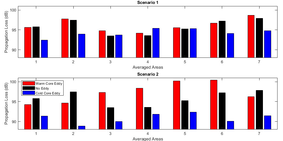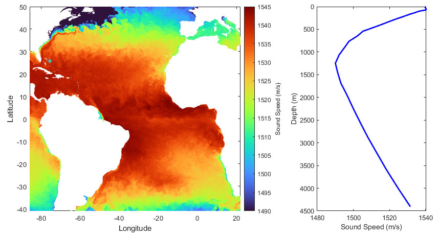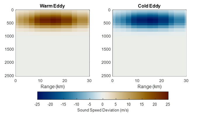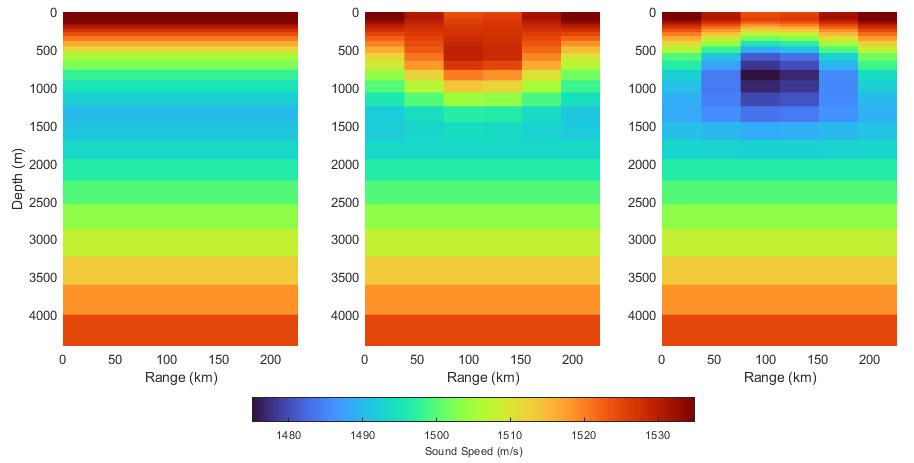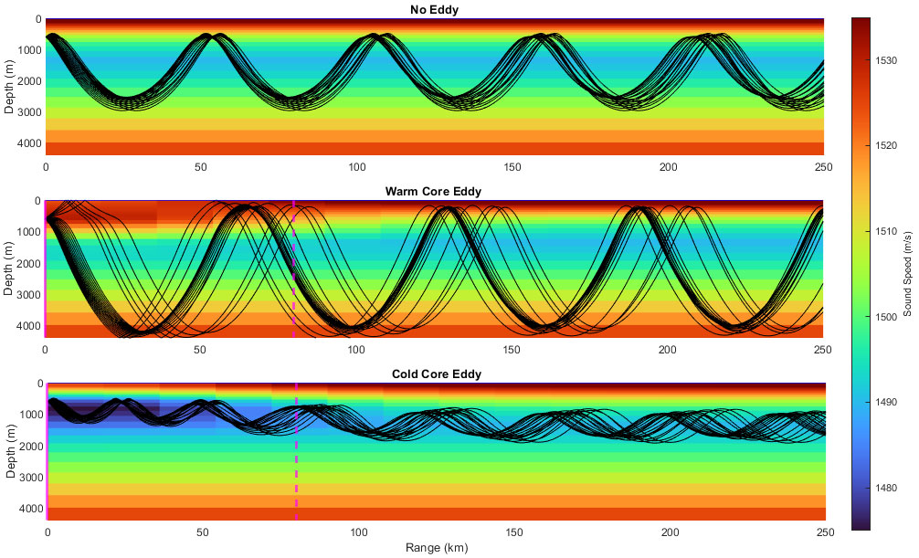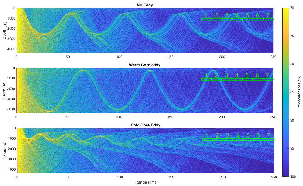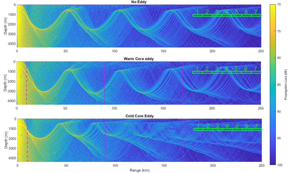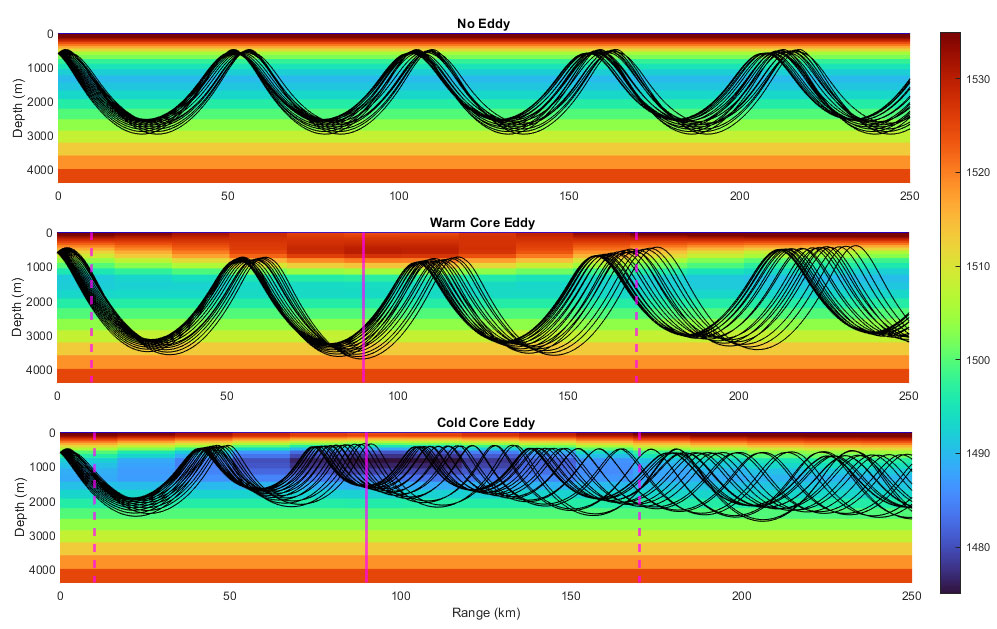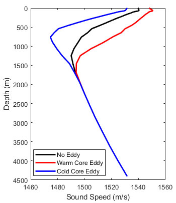 A A A Volume : 46 Part : 1 Proceedings of the Institute of Acoustics Effects of mesoscale eddies on sound channels R. Perks, Atlas Elektronik, UK L. Parkes, Atlas Elektronik, UK I. Siggers, Atlas Elektronik, UK 1 INTRODUCTION The world’s oceans have spatial and temporal variations in physical properties such as temperature and salinity. These properties are continually mixed through a variety of processes that act at a range of length and time scales, resulting in complex, turbulent mixing patterns. At mesoscales (typically 10-100s of kilometres) semi-stable patterns emerge which morph and evolve over periods of days, weeks and months. These patterns include the formation and evolution of ocean eddies. These phenomena are frequently generated at dynamic mixing locations, such as at western boundary currents or at frontal boundaries between water masses, where eddies are ‘spun off’ from the main jet. The resulting mesoscale eddies are dynamic, complex three-dimensional structures which exhibit different properties (such as temperature, salinity and vorticity) to their surrounding water. Since both temperature and salinity directly affect sound speed, the presence of an eddy has the potential to impact acoustic propagation. The SOFAR (Sound Fixing and Ranging) channel is a naturally occurring sound channel in the oceans which was initially discovered by Ewing and Worzel in 19481 and subsequently investigated by various researchers. The depth of the SOFAR channel (i.e. its depth axis) is geographically dependant: in mid-latitudes depths of 1000-1200 m are common2, 3; while in the Arctic summer depths as shallow as 100-200 m are reported4. Anthropogenic exploitation of this channel has included locating downed aviators (using a depth sensitive charge)2 and long distance communication5. It is widely believed that marine mammals also exploit the channel for long range communication6. These include, large baleen whales (e.g. humpback, sperm) and elephant seals, which emit low frequency sound and have deep dive profiles7. A short study has been conducted to investigates how the presence of an eddy may affect acoustic propagation within such a sound channel. 2 METHODOLOGY 2.1 Overview A simple, parameter-based, model was developed to represent ocean eddies. A variety of model representations were then embedded within a base ocean field. In each case, acoustic modelling was conducted to assess the impact that the eddy had on the acoustic propagation conditions. 2.2 Base Field The base field was derived from a location close to the Bahamas8 as shown by the star in Figure 1 left panel. In winter, this region contains a SOFAR channel at a depth of 1250 m as shown in Figure 1 right panel. This location has a sea floor depth of 4.4 km. Figure 1: Sound speed at the ocean surface in the Atlantic in January (left). Sound speed profile (right) at the location of the star close to the Bahamas9. A horizontally invariant three dimensional field was generated by simply replicating this sound speed profile at all locations. 2.3 Modelling Eddies A simple Gaussian distribution model (widely employed in the open literature10 , 11 , 12 was used to represent eddies. A two dimensional deviation profile (in depth) was created, using Equation 1, where c± is equal to −1 or +1 depending on whether the eddy is a cold core or a warm core respectively, δc is the maximum sound speed deviation, z0 is the depth of the centre of the eddy and σ is the standard deviation associated with Gaussian distributions, but here represents the vertical spread of the eddy. This two dimensional vertical profile represents the water column at the centre of the eddy. A three dimensional representation of the eddy was created using a Gaussian model for the lateral spread by applying Equation 2, where r is the radial distance from the centre of the eddy and R is the standard deviation of the lateral Gaussian model. Examples of a warm core and a cold core eddy are shown in Figure 2. Figure 2: Sound speed deviation fields of a warm core (left) and a cold core (right) eddy. 2.4 Acoustic Analysis Different physical environments were generated by combining the base field with the eddy deviation fields. In this paper three cases are considered: a No Eddy Case; a Warm Eddy Case; and a Cold Eddy Case. These three cases are depicted in Figure 3. Figure 3: Sound speed plots for the No Eddy Case (left), the Warm Eddy Case (middle) and the Cold Eddy Case (right). Acoustic modelling employed a two dimensional coherent parabolic equation model called SPUR which was derived from RAM (Range-dependent Acoustic Model) 13. The model was run on 2 dimensional slices through the centre of the eddy, extending out to ranges of 250 km. The acoustic model was run at a frequency of 300 Hz. This frequency was chosen because it is low enough to avoid significant attenuation (at extended ranges) but is high enough to be affected by the presence of the eddy. 3 RESULTS 3.1 Scenario Parameters The eddy parameters selected were: Eddy centre depth 600 m; Lateral extent 160 km; and Maximum sound speed deviation ± 25 m/s. The edges of the eddy are located half the lateral extent (80 km) away from the centre of the eddy. The acoustic source was located at the depth of the eddy centre (600 m) and in two different lateral positions relative to the eddy. Scenario 1: 10 km from the edges of the eddy Scenario 2: At the centre of the eddy 3.2 Acoustic Analysis Results Figure 4 shows the sound speed profile for the three cases. From this Figure the warm eddy causes the depth of the sound channel axis to increase (from 1.2 km to 1.5 km) whereas the cold eddy causes it to decrease (from 1.2 km to 0.75 km). In addition, the cold core eddy strengthens the sound channel by decreasing the minimum sound speed. Figure 4: Sound speed profiles at the centre of the modelled eddy for warm core (red), cold core (blue) relative to the no eddy base field (black). 3.2.1 Ray Tracing Figure 5 sh