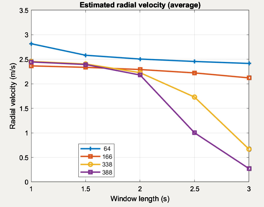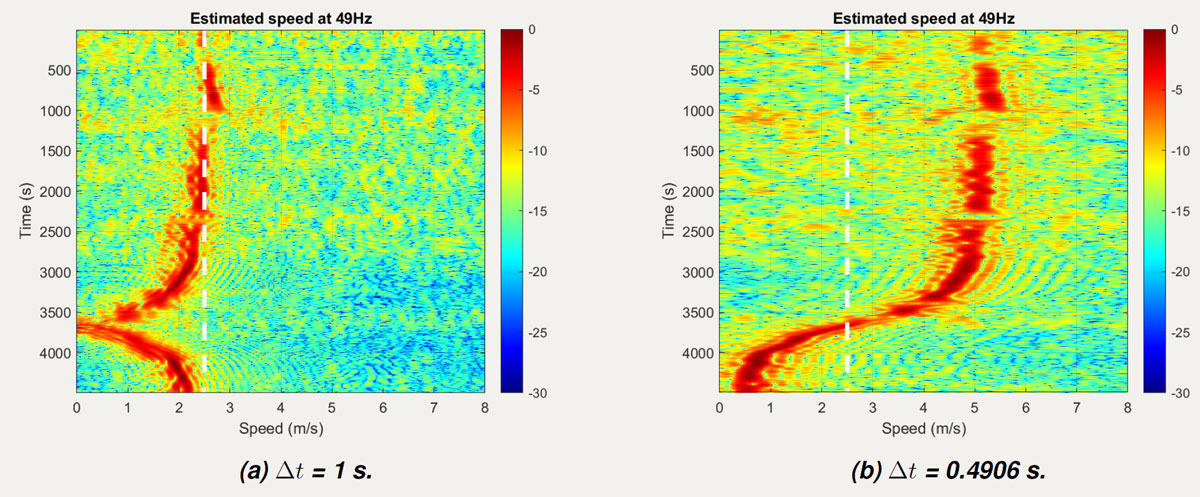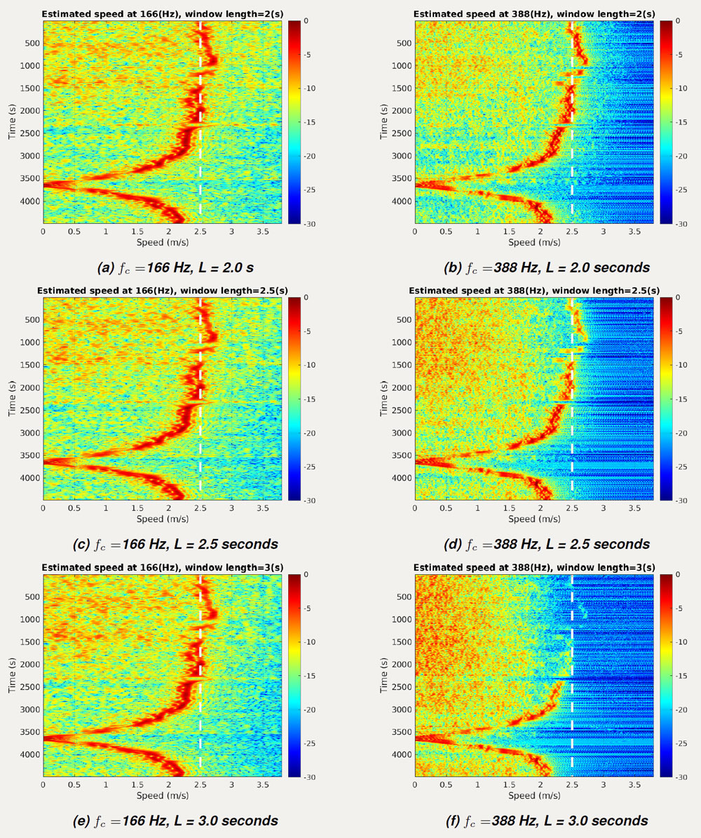 A A A Volume : 46 Part : 1 Proceedings of the Institute of Acoustics Signal processing criteria for single hydrophone sound source ranging in shallow waters Sung-Hoon Byun, Korea Research Institute of Ships and Ocean Engineering (KRISO), University of Science and Technology (UST), Korea Jeong-Bin Jang, Korea Research Institute of Ships and Ocean Engineering (KRISO), University of Science and Technology (UST), Korea 1 INTRODUCTION It is common to use a hydrophone sensor array to localize underwater sound sources. However, its performance being dependent on the number of sensor elements, sufficient array dimension is required to guarantee the localization performance, which makes handling the array difficult and place the burden of processing large amounts of data. As an alternative to the array processing, a single-hydrophone source localization based on various waveguide effects have been studied1,2,3,4,5. In particular, the field differencing1 of a single hydrophone signal has the advantage of being simple to calculate and being able to use various types of sound sources. Basically, the field differencing method correlates the received pressure fields at different ranges from a radiating source, and the resulting cross correlation field has an oscillation pattern providing clues about the radial velocity of moving sound source. Accordingly, the estimated radial velocity can be used to calculate the range from the receiver via fitting with the closest point approach (CPA) velocity model if the CPA is observed or from the waveguide invariant if it is not observed. Its effectiveness was proven using shallow water environmental experiment data1,4 and was also proven even for the reliable acoustic path (RAP) experiment data3 where the receiver depth was 4500m. Recently, its application has been extended to tracking underwater unmanned vehicle2. Although the field differencing method is quite simple, it has been observed that errors can occur in the velocity estimation, and performance can deteriorate depending on the parameter values used in the signal processing. With respect to it, this study reviews the signal processing parameters used in the field differencing method and their underlying constraints which needs to be considered during its application. We focus on the velocity estimation problem since the range calculation can be regarded as a subsidiary procedure of velocity estimation if the environmental information such as sound speed profile and waveguide invariant are known accurately enough. 2 SOURCE VELOCITY ESTIMATION BY THE FIELD DIFFERENCING METHOD The field differencing method1 uses the cross-correlation field Ic (R, ∆r ) which is defined as where R is the average range of the source, and ∆r is the range interval between the cross correlated signals when the source is at R. ℜ [·] denotes the real part of a complex value. When the source moves with the radial velocity vr, the cross-correlation field can be shown to have the following relation according to the normal mode theory1,6, where is the average wave number of modes, f is the signal frequency, and vp is the average modal phase speed, i.e. . It is observed that Eq.(2) will have the maxima when ∆r is an integral multiple of 2π. Both the broadband and the narrowband signal can be used to estimate vr from Eq.(2). For narrowband case, we can vary the time interval ∆t with f fixed, whereas for broadband case, we can vary the frequency f with ∆t fixed to find the remaining factors including vr. The radial source velocity vr can be estimated by the Fourier transform of Ic (R, ∆r). That is, Ic (R, 0), Ic (R, ∆t, . . . , Ic (R,(N − 1)∆t) are Fourier transformed to estimate vr at each range R. The peak position in the normalized abscissa of the transform domain contains the velocity information. In particular, if the peak position of the Fourier transform for the narrowband case is denoted as p, then vr is obtained by Here, can be approximated by the average sound speed in the waveguide, and f is the signal frequency in Hz. 3 SIGNAL PROCESSING PARAMETERS OF THE FIELD DIFFERENC ING METHOD In this section, we review the signal processing parameters for calculating the cross correlation field and discuss their impact on the velocity estimation. The SWellEX-96 experiment data7 was used for analyzing the effects of parameters. In particular, we used the VLA data of the event S5 which was from a source towed at a 54 m depth and at a constant speed of 2.5 m/s along a linear track as described in Figure 1. The data from the element no.13 at the depth of 189.8 m was used among twenty one elements available for the VLA. As shown in the figure, the track has the CPA point to the VLA after about three quarters of total track length. We discuss only the narrowband case in the below. However, because the frequency f and the time interval ∆t are reciprocal in Eq.(2), the constraints can inferred similarly for the broadband case. Correlation time interval (∆t) Correlation time interval ∆t controls the time lag between two signals correlated in Eq.(1) where ∆r = vr∆t. When Ic is Fourier transformed to estimate the velocity, ∆t plays the role of sample period. Thus, it determines the maximum radial source velocity according to the sam pling theorem. Figure 2 shows the results for different time intervals, where the case (b) ∆t = 1.0s exceeds the allowed sample period for the given source velocity. Using such a long time interval results in velocity aliasing, as shown in Figure 1(b). The relationship between the maximum radial velocity and the time interval is as follows: Figure 1: Map of the ship trajectory of the event S5 in the SWellEX-96 experiment. Another constraint on ∆t for the narrowband case is that it must be an integral multiple of signal period. This is because if the time interval is not a multiple of the cycle, the pressure field used for cross-correlation are phase shifted relative to each other,