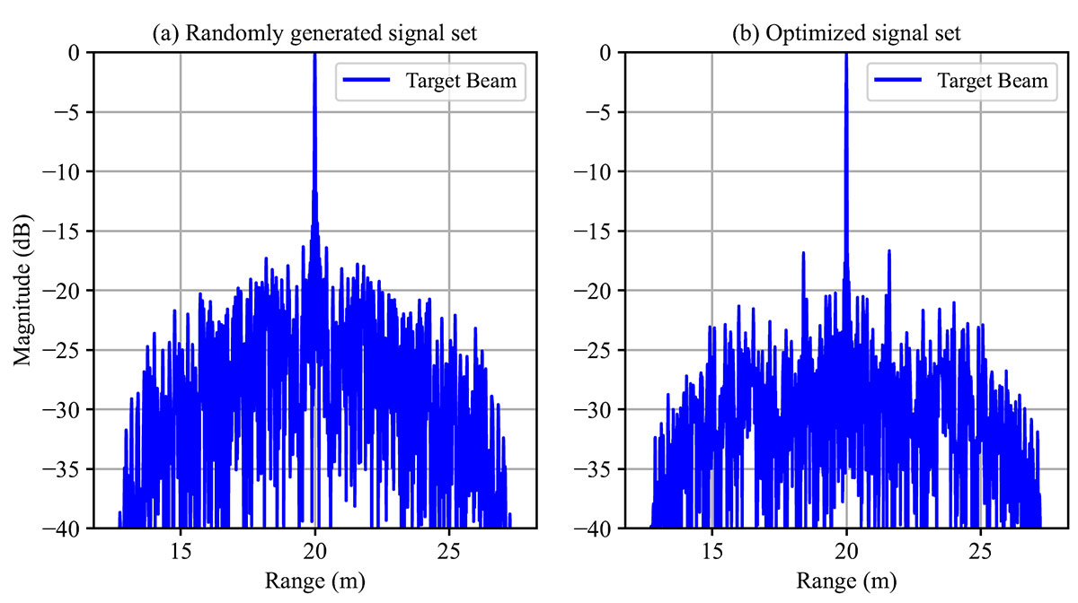 A A A Volume : 46 Part : 1 Proceedings of the Institute of Acoustics Pulse form optimization for MIMO sonar systems Sven Schröder, German Aerospace Center, Institute for the Protection of Maritime Infrastructures, Germany Sarah Barnes, German Aerospace Center, Institute for the Protection of Maritime Infrastructures, Germany Dieter Kraus, City University of Applied Sciences Bremen, Germany Anton Kummert, University of Wuppertal, Germany 1 INTRODUCTION Essential for the MIMO principle is the ability to separate the transmitter signals from each other at the receiver-side signal processing. Signal separation methods are typically divided into the categories Time-Division-Multiplexing (TDM), Frequency-Division-Multiplexing (FDM) as well as Code-Division-Multiplexing (CDM) [12]. When applying the TDM method to MIMO sonars, the transmitter signals are emitted in different time slots to be able to separate them in time after receiving. However, this implies a longer overall ping period within the observed scene may change. These changes may impede the coherent processing of the consecutively emitted transmitter signals and can result in a reduced angular resolution enhancement. The FDM method is based on a division of the available frequency band in sub-bands. This reduces the bandwidth of each transmitter signal, which consequently leads to a decreased range resolution. In addition, coherent processing of frequency divided signals causes artefacts in the Point- Spread-Function (PSF) of the system [13, 3]. This paper is focussed on the CDM method which uses coding techniques to enable a simultaneous transmission of all transmitter signals in the same frequency band. The receiver-side pulse separation and compression are realized with a bank of matched-filters. This paper deals with the optimisation of MIMO pulse sets with respect to the sidelobes in the distance domain of the PSF of the system. In the literature, pulse optimisation is usually applied to single transmitter signals, trying to minimise the sidelobe level in the autocorrelation [6]. This ignores the coherent signal processing of MIMO systems, where constructive interference can lead to high sidelobes in the PSF. However, integrating the computationally complex simulation environment into the optimisation slows it down significantly, which is why a simplified form with sufficient predictive power of sidelobes in the PSF is to be found. In this work, three cost functions are compared with each other and used to optimise an Orthogonal-Frequency-Division-Multiplexing (OFDM) signal set. In Section 2 the used OFDM signal is described in more detail. Section 3 describes the cost function and optimisation of the transmitter signal set. The results of the optimisation are presented in Section 4. Finally, Section 4 summarises the work. 2 TRANSMITTER SIGNAL One in the MIMO radar literature often considered transmitter signal candidate is the OFDM signal, cf. [9, 10, 8]. OFDM signals have their origin in communications technology and represent a comparatively new field of research for application in MIMO sonar systems. The principle is based on a multiplexing technique using orthogonal carrier frequencies. For this purpose, the transmitter frequency band is divided into sub frequency bands Bsub whose width depends on the length of the OFDM signal by the orthogonality condition If this condition is satisfied, the carrier frequencies lie in the first null of the sinc function of the adjacent carrier frequencies in the frequency domain. In the time domain, each carrier sine wave has an integer number of periods, which leads to a zero crossing at the start and end of each carrier. A single OFDM signal is defined by with and the sequence whereby each carrier frequency contains two bits of information. 3 SIGNAL SET OPTIMISATION For the optimisation of a mathematical problem, its quality must be translated into a scalar value using a cost function, which can be minimised by varying the input parameters. In this case, it must be determined which properties of a MIMO transmitter signal set are decisive for the performance of the entire system and how these can be quantified. In the literature, the approach of using properties from auto- and cross- correlations for pulse optimisation is often chosen (cf. [2, 12, 11, 1, 17]). One method is to minimise the Generalised-Integrated-Sidelobe-Level ( GISL ), which is defined as where p is an arbitrarily selectable integer hyperparameter, ΩML is the range of the mainlobe and ΩSL is that of the sidelobes (cf. [14, 4, 5, 7]). Ifp = 2 is selected, Equation (5) corresponds to the Integrated Sidelobe-Level (ISL). For p → ∞, Equation (5) converges to the infinity norm |·|2∞ and corresponds to the Peak-to-Sidelobe Level Ratio (PSRL), which is a metric frequently used in radar pulseform design in addition to the ISL [6]. In the literature the described metric is commonly used for the optimisation of autocorrelation functions of individual transmitter signals. However, for the use of multiple transmitter signals in a MIMO-CDM system, the characteristics of all transmitter signals and their interaction are crucial. The properties of the PSF, which describes the resolution behaviour and the characteristics of sidelobes in the angle-distance domain, would therefore be decisive for the consideration of the overall system. This is because the PSF includes all effects that can be caused by the coherent superposition of several transmitter signals. Figure 1 shows an example of the PSF of a MIMO system using OFDM pulses. Figure 1: (a) PSF of a MIMO system with N = 32 receivers and M = 4 transmitters using OFDM transmitter signals; (b) Target beam signal sTB ( r ) at ϕ = 0 ° which contains major parts of the cross-correlation noise The effects of the sidelobes in the auto- and cross-correlation are most evident in a small area around the target beam signal sTB(r) = PSF(0, r), where r is the range. To simplify the op