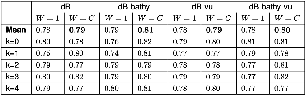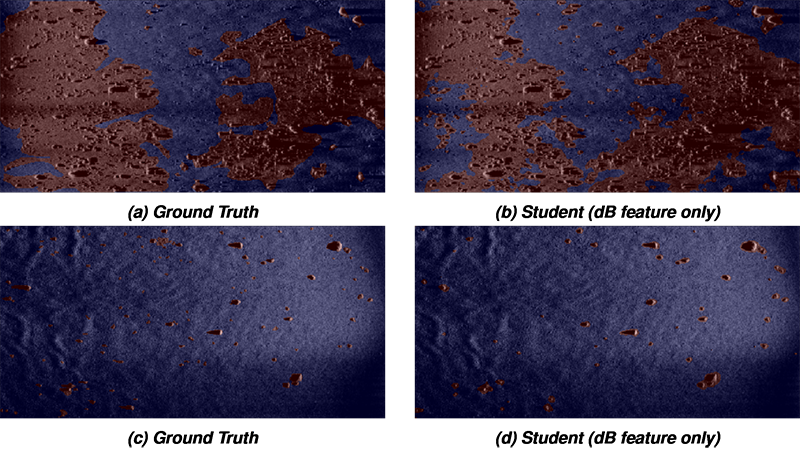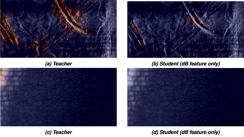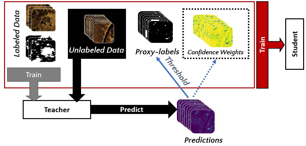 A A A Volume : 46 Part : 1 Proceedings of the Institute of Acoustics Proxy-label semi-supervised deep learning for object detection and mapping in synthetic aperture sonar S. Steele, Kraken Robotics 1 INTRODUCTION Seabed geohazard detection is a requirement for many different types of surveys including hydrographic, habitat, and infrastructure installation (such as cable, pipeline, and offshore wind). In many applications geohazards as small as 20 cm must be detected over large areas. The resolution of side looking sonar imagery strongly impacts the quantity of boulders that can be detected in imagery1, thus the range independent resolution of synthetic aperture sonar (SAS) makes it an ideal sensor for geohazard detection. Manually identifying and classifying geohazards in SAS imagery is time consuming, creating a bottleneck in project delivery. The application of deep learning for seabed segmentation has the potential to substantially reduce the cost associated with geohazard detection. Supervised deep learning demands an extensive collection of training images, which requires considerable time and resources to generate. In contrast, semi-supervised learning attempts to train a model through the use of a dataset consisting of a small set of labelled training samples and a large number of unlabelled samples. Here, we explore applying the proxy-label semi-supervised learning method to SAS imagery. Previous work in the application of semi-supervised learning to object detection in SAS imagery has focused on autoencoders or architectures analogous to autoencoders, which are self-supervised models that first encode an image into a lower dimensional latent representation, then decode the representation to reconstruct the image. These learned representations can be used to perform semi-supervised learning for segmentation or classification tasks. In the SAS domain these tasks have been trained jointly using architectures such as the ladder network (performs classification, reconstruction, and segmentation)2 or as two separate steps where the model is first trained to reconstruct SAS imagery and then later fine-tuned to perform classification3. Our approach, proxy-label semi-supervised learning, is more akin to bootstrapping. With this technique no image reconstruction step is required, instead we rely on a teacher convolutional neural network (CNN) to generate proxy-labels (i.e. noisy or imperfect labels) for a large set of unlabeled SAS images, which can then be used to train another CNN model referred to as the student. There are numerous categories of proxy-label techniques including self-training, co-training, and multi-view learning4. Even though the architecture presented in our work trains a new model with the proxy-labels, we still consider it to be a form of self-training. Our approach can be considered a variation of the pseudo-label technique5, which trains on labeled and unlabeled data simultaneously with two forward passes. In this text we will refer to any model architecture that assigns proxy labels to unlabelled data, which are used as targets for learning, as proxy-label techniques, and reserve the term pseudo-label for the original paper that introduced the pseudo-label architecture. The pseudo-label and other proxy-label semi-supervised learning techniques have been shown to increase model robustness and generalisation, even when training data is abundant5,6. The primary differences between our proxy-label technique and the pseudo-label technique are the number of forward passes (ours only requires one, making it faster to train) and the treatment of noisy labels. To minimize the impact of noisy labels, most proxy-label methods either: 1) weight the unlabeled data training loss such that their contribution increases over time (i.e.,model epochs)5, or 2) utilize only high confidence predictions for training by choosing a confidence threshold, which can either be absolute or relative (i.e., the top N unlabeled training samples are used in training the next iteration)7. Our proxy-label approach does not require a proxy-label weighting parameter or cutoff. Here, we utilize a CNN pre-trained to identify objects in optical imagery (VGG168) as the teacher model and a U-Net9 model architecture for the student model. In previous work, the teacher model was fine tuned to detect geohazards in SAS imagery using transfer learning on a small set of labeled SAS images10. Thus, no confidence threshold or weighting is required because, with the transfer learning, we can consider all predictions to be high confidence. We also utilize data augmentation and dropout to add noise to the student model, which increases generalization by reducing overfitting (i.e., the model is "forced to learn harder"6 from the proxy-labels). The teacher model was used to generate a large set of labeled SAS images to train a student network with the specific task of detecting geohazards in SAS imagery. In this paper we will explore how different combinations of SAS derived features (such as bathymetry and vertical uncertainty) impact the student model performance. To the author’s knowledge, the only SAS feature utilized in the literature to train deep learning models for object detection has been imagery (both intensity and complex). This paper will also explore the impact of using the teacher model confidence to assign a weighting to each pixel during student network training. Results from our proxy-label learning framework will be demonstrated on imagery collected during numerous surveys using a Kraken Robotics miniature interferometric SAS (MINSAS). 2 METHODS The proxy-label semi-supervised learning technique consists of a teacher network trained on a small manually labeled (i.e., ground truth) dataset and a student network trained on a large set of proxy-labels produced by the teacher network. A generalized workflow of our implementation of the proxy-label technique can be found in Figure 1. We leverage a pre