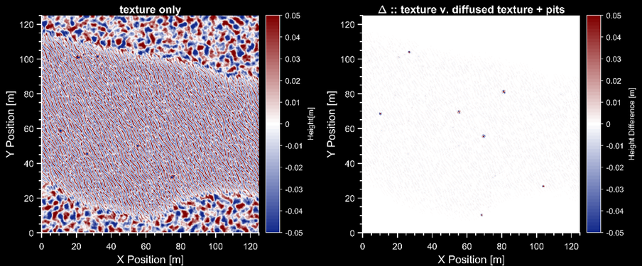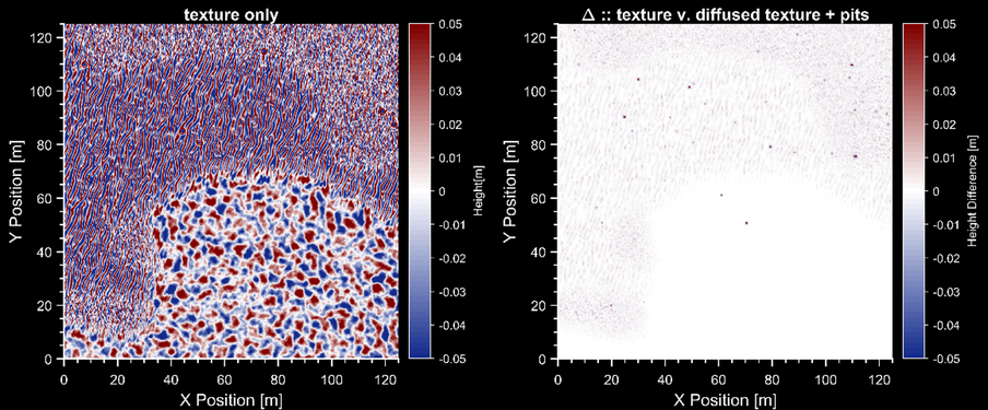 A A A Volume : 46 Part : 1 Proceedings of the Institute of Acoustics Content generation for SAS change detection simulations S. F. Johnson, The Pennsylvania State University, USA 1 INTRODUCTION Synthetic Aperture Sonar (SAS) based Change Detection requires estimating and accounting for differences in the navigation track between base and repeat pass collections. In dynamic environments, there are also changes of the seabed because of hydrodynamic and/or biologic activity, which can mask detection of the intended anthropogenic activity. Combined, these uncertainties make the use of collected data challenging for purposes such as validation of signal processing techniques and study of the spatiotemporal coherence of the scattered acoustic field. In this paper we describe the development of a dataset specifically generated for such assessments leveraging the prescriptive nature of simulation. Content generation is a topic which has received substantive investigation, with significant advances made in the fields of computer-generated imagery (CGI), and both recreational and “serious” gaming. Techniques used to generate and combine seabed textures, such as hydrodynamically-generated sand ripples, biotubatively-generated fish pits, and power-law roughness, will be described. To represent the evolving nature of the seabed in dynamic environments, a model for horizontal diffusion was employed. Two evolving seabed scenes were generated, with several collection aspects. For each of these combinations four sets of acoustic time-series data and reconstructed imagery were generated: an initial pass for a base image, an easy case with just a handful of localized disturbances, a medium case also including diffusive sand ripples, and a hard case also including a collection geometry mismatch. These sets of data are intended to test SAS reconstruction techniques, change detection techniques, and data/registration techniques. The process of developing these SAS datasets can be thought of in several discrete steps: Relief Generation (i.e. generating the ”world” that the sonar is operated in), Acoustic Rendering (i.e. calculating the sonar time series response of the ”world”), Image Reconstruction (i.e. application of synthetic aperture techniques), and Image Processing (i.e. image registration, and change detection). The focus here is the relief generation with Procedural and Declarative techniques and description of the dataset applicable to SAS based Change Detection. The intermediary steps of acoustic rendering and image reconstruction will be discussed only briefly as there are myriad other papers on these topics. The image registration and change detection steps are left to the consumer to develop and demonstrate. Figure 1: Semantic map (left), individual texture layers (middle), and composite seafloor relief (right). 2 CONTENT GENERATION 2.1 Overview For several decades, computer-generated imagery (CGI) has been utilized for generating or augmenting images and movies, relying on a combination of algorithmically or procedurally generated, along with manually or declaratively generated techniques. Perhaps the most notable improvement in the realism of procedurally generated content is often attributed to Perlin 1 following his involvement in the 1982 movie Tron. Interestingly, Bell2 mentions “procedurally defined objects” in the 1997 paper on side-scan sonar simulation. Here we describe combining both procedural and declarative content generation techniques to develop realistic and representative environments as the basis for a simulated dataset intended to test several aspects of Synthetic Aperture Sonar based Change Detection. 2.2 Procedural Generation Procedural approaches are those which are generated algorithmically, and are often driven by a stochastic component to promote variety and disrupt unnatural repetition. While certain algorithms are entirely heuristic, the more enticing and often realistic algorithms are based on models of physical processes. When procedural models are applied to textures, they can often be layered to create more heterogenous and interesting scenes. The upper limit of realism for procedural approaches is our ability to develop models for, and supporting parameterizations of, physical processes. Figure 2: Composite seafloor relief (left) and heightmap difference (right) for Scene 1. Seafloor relief has long been described as fractal, ranging from large scale bathymetry3 to small scale roughness where it is often described as power-law4. This physical basis, supported by known parameterizations and application to acoustics5,6, combined with algorithmic implementations in both spatial and wavenumber domains, make random fractal or power-law roughness texture a common starting point for use in sonar simulations2,7. To expand upon random roughness, several other models have been applied in a procedural approach. Tang8 proposed a rippled-sand texture model, which was applied to the generation of computationally efficient SAS-like imagery9. The effect of bioturbation was modeled with horizontal diffusion10, and utilized to simulate the decay of sand ripples11,12 and subsequent decorrelation of simulated SAS imagery11. A spatial domain model for a fish-feeding pit13 was combined with the horizontal diffusion model10 to simulate production of a random roughness seafloor texture with a spectrum that is power-law-like attributable to bioturbation14. These basis textures of random roughness, rippled-sand, bioturbation, and the process of horizontal diffusion serve as the procedural textures for this work. 2.3 Declarative Generation Declarative approaches are those which are generated manually, and often rely on the expertise of the user to ensure realism. In the entertainment industry this is often an artist composing content, while in the education industry it may be by the participation of an instructor to manipulate content of a serious game in a pedagogical manne