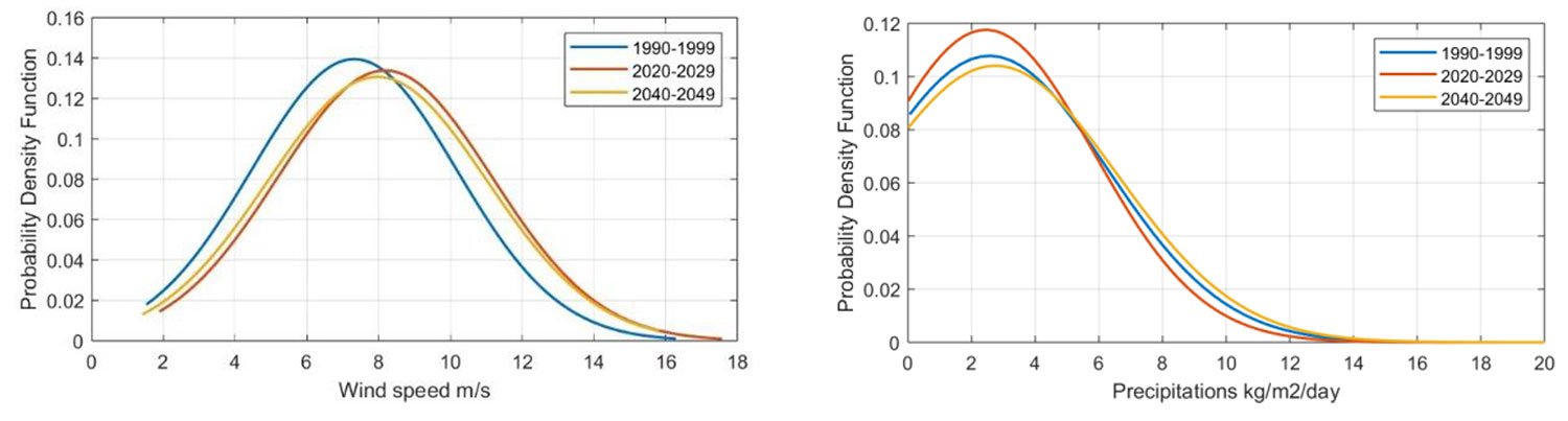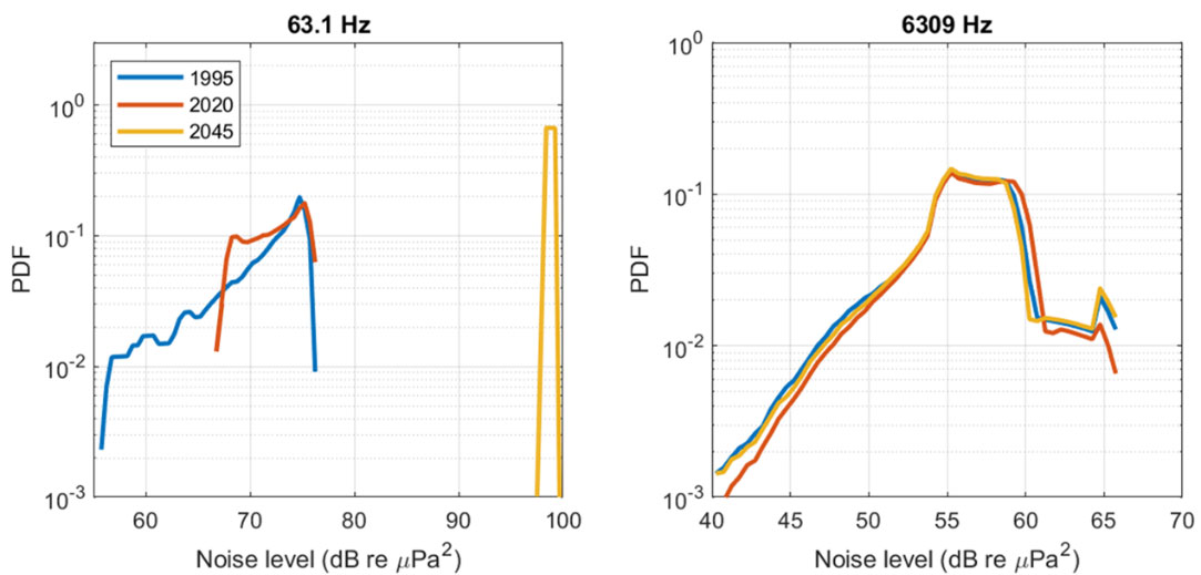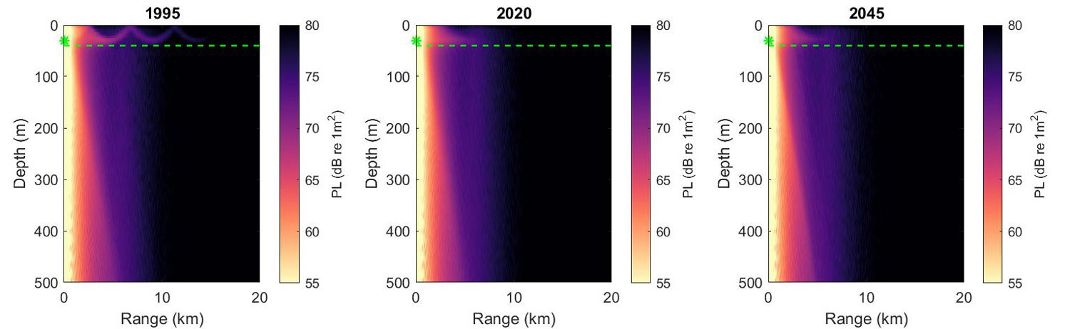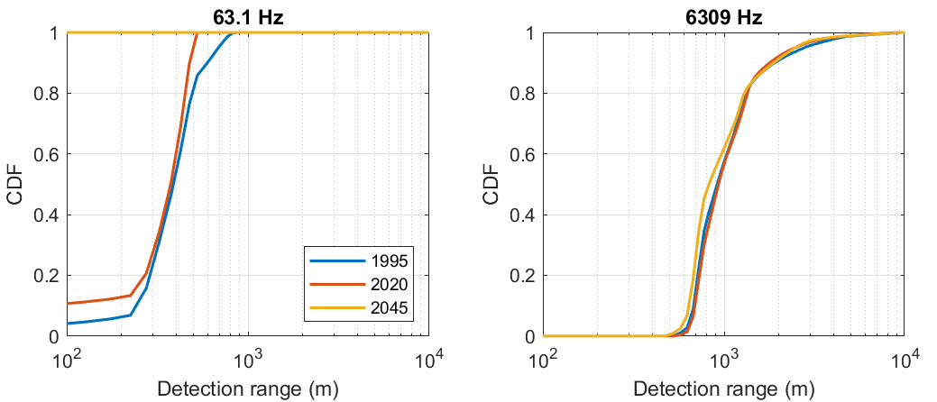 A A A Volume : 46 Part : 1 Proceedings of the Institute of Acoustics The impact of climate change on sonar performance: A case study in the High North V. O. Oppeneer, TNO, The Hague, The Netherlands N. Risser, TNO, The Hague, The Netherlands R. van Vossen, TNO, The Hague, The Netherlands K. Pelekanakis, TNO, The Hague, The Netherlands G. Giorli, CMRE, La Spezia, Italy A. Russo, CMRE, La Spezia, Italy 1 INTRODUCTION It is currently well known that climate change is affecting the Earth [1]. About 90% of the added heat energy resulting from anthropogenic perturbations (e.g. greenhouse gases) is absorbed by the oceans [2] [3]. Consequently, the oceans’ temperatures are increasing globally. In polar regions this is accompanied with the melting of ice, which impacts the salinity gradients. These trends have local differences and depend on the area of interest (cf. chapter 2). This phenomenon affects the propagation of sound, and consequently sonar performance [4]. Oceanographic conditions are not the only factor affecting sonar performance. Wind, rain, biology, and anthropogenic sources such as shipping also contribute and must be taken into. In this work, climate change is related to sonar performance. A top-down approach is developed in a block diagram which relates climate change to sonar. Finally, this approach is illustrated using a passive sonar scenario case study in the high north. 2 CLIMATE CHANGE AND ITS RELATION TO SONAR PERFORMANCE Ocean temperature affects the acoustic sound propagation as well as other factors also contributing to the performance of a sonar system. Figure 1 presents a comprehensive approach relating climate change to sonar performance. This happens in several stages, climate change and human activities affect the Acoustic Environment, which describes all the important factors necessary to determine the Ocean Acoustics. The Ocean Acoustics describes the propagation, scattering and noise. Finally, the Ocean Acoustics affects the Sonar Performance, both on the signal and the noise side. The block diagram from Figure 1 can be used to analyse the impact of climate change in the area of interest, and gives insight in what literature or knowledge is necessary. Many institutes do climate modelling to compute the oceanography (temperature, salinity, pH) for a future date, [1], [5], [6]. Similar work is done for the wind and rain [7], [8], [9], although results do not always agree [10], [11]. However, future biology and shipping activities are hard to predict. The presence of a species depends on the oceanography, the overall ecosystem, and the presence of human activity as fishing. Most of the biology studies are conducted on few species, and to the best of our knowledge, there is no overarching work done on the change of animal and plankton distributions for future scenarios. Concerning marine traffic activity, we can separate it within shipping, leisure, and fishing. On one hand, the presence of fishing boats (and therefore the noise produced by them) depends on the presence of preys to capture, for which no real prediction is available. On the other hand, new commercial shipping routes are expected to open in the Arctic [12]. There is currently a lot of work being done on predicting the sea ice coverage in the Arctic. Predictions support a decrease in the ice sea coverage, more important in summer than in winter, [13], [14]. Eventually, the Arctic is predicted to be ice-free in summer time, even if all prediction don’t always agree of when this will happens or for how many months [15], [16], [17]. When enough information is gathered on the Acoustic Environment, modelling for scattering, propagation, and ambient noise can be applied to compute the relevant inputs for a sonar performance calculation. Figure 1: A block diagram, relating climate change to sonar performance. Arrows indicate how different blocks interlink with each other but not the strength of the link. 3 A PASSIVE SONAR CASE STUDY IN THE NORTH ATLANTIC 3.1 Scenario description The scenario that will be considered here is a passive sonar scenario. This means solving the passive sonar equation, which can be written as [18], [19], [4]: where 𝑆𝑁𝑅 denotes the signal-to-noise ratio in a given frequency band. 𝑅𝑁𝐿 is the radiated noise level, the sound radiated by the object of interest. 𝑃𝐿 is the propagation loss. 𝑁𝐿 is the ambient noise level, which is a combination of sea state noise (wind noise), rain noise, and shipping noise and 𝐴𝐺 is the array gain. The 𝑆𝑁𝑅 can be converted to a probability of detection using equation 7.34 of [19] as: where 𝑝𝑑 is the probability of detection, 𝑝𝑓𝑎 is the probability of false alarm, and 𝑅 is the linear SNR computed as: which is assumed to be 10−5. Furthermore, the detection range in this work is assumed to be the largest distance for which 𝑝𝑑 = 0.5 . In the scenario, a latitude of 76 degrees and a longitude of 10 degrees are chosen, where the water depth is 2200 m, as reported in [20]. The sediment is assumed for this case study to be medium sand (with properties described in [19]). A single hydrophone receiver at 30 meters depth is placed at these coordinates. The hydrophone is assumed to have a 1 s integration time, resulting in a processing bandwidth of 1 Hz. Furthermore, a submerged target is located at 40 m depth. It has two tonals, based on [21]. The first tonal is at 63.096 Hz, bandwidth is 0.1 Hz, and the integrated radiated noise level over this bandwidth is 130 dB re μ Pa2 m2. The second tonal is at 6309.6 Hz, same bandwidth, and the same integrated radiated noise level. It is assumed that these tonals have top-hat spectra: constant value within the bandwidth, zero outside of it. The integration bandwidth of the receiver is wide enough to capture all the energy of the tonals. The oceanography is described in 3.2. Wind and rain distributions is described in 3.3. Biology is not considered in t