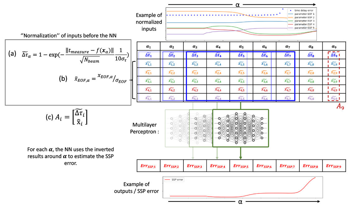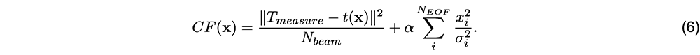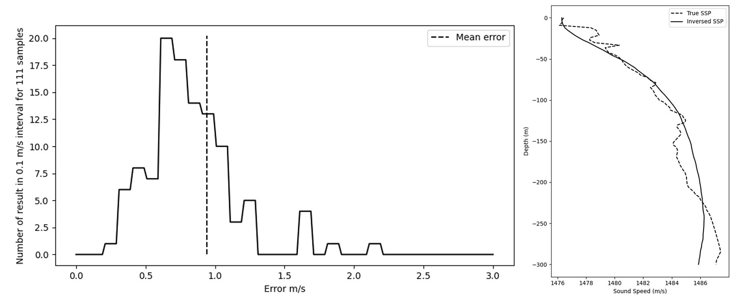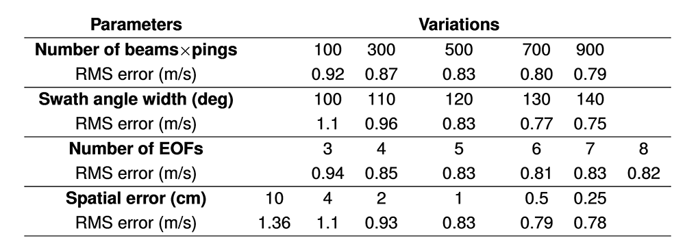 A A A Volume : 46 Part : 1 Proceedings of the Institute of Acoustics Inverting the sound speed profile from multi-beam echo sounder data and historical measurements – a simulation study Y. Gourret, University of South-Eastern Norway, Horten, Norway T. Brander, University of South-Eastern Norway, Horten, Norway K. T. Hjelmervik, University of South-Eastern Norway, Horten, Norway 1 INTRODUCTION The ocean’s lack of transparency offers plenty of opportunities for illegal trade enterprises1, terrorism, and covert military operations. Unmanned surface vehicles and autonomous underwater vehicles are possible disruptive technologies that might counter these threats2. The lack of human decision makers puts strong requirements on the autonomy of the vessels. Also, the inherent compactness of these vessels imposes strong restrictions on the amount and size of installed hardware. For manned sonar operations, sound speed probes are used to determine the local sound speed profile, which is then used to estimate the sonar performance. For unmanned vessels, the extra payload for sound speed probes should be avoided. Ocean models provide an alternative source of information on the underwater environment. However, their predictions are still unable to provide the level of detail and accuracy required for small-scale sonar operations in littoral environments. Climatological data3 and other statistically derived oceanographic data4,5 may also provide information on the present sound speed, but fail to account for local spatio-temporal effects. Through-the-sensor techniques is an alternative means of assessing the environment. Sound speed inversion from multi-beam echo sounder (MBES) data is addressed in several studies where the main goal is to improve topographic measurements6,7,8,9. Common for all these studies is that both the sound speed and the topography are assumed unknown in the inversion, and that they focus on the accuracy of the topographic measurements, rather than the quality of the sound speed profile (SSP). Hjelmervik10 proposed inverting the sound speed from single-beam echo sounder (SBES) data and direct measurements of the sound speed at limited depths in an area with known topography. A major limitation in this work is that an SBES yields information on the average SSP only, not its structure. Keyzer et al.9 inverts the SSP from MBES data in a similar manner using an empirical orthogonal function (EOF) representation for the SSPs. The advantage of using MBES data is that beams directed off the vertical will be refracted and thus contain information on the sound speed gradients throughout the depths. However, the cost function used by Keyzer et al. does not include any constraints that ensure that the resulting profile is physical. We invert the SSP from MBES data in an environment with known topography. The SSPs are represented using EOFs, such that the proposed SSPs can be modelled by a limited number of coefficients10. An acoustic raytracer models the travel time from the transmitter to the bottom and back to the receiver for proposed SSPs. The cost function compares the modelled and measured travel times for all beam angles, but also includes a priori knowledge on the SSPs through Tikhonov-type regularization11. We assess the validity and performance of our method through simulations, e.g. to explore its sensitivity to errors in the measured travel times. Our work thereby expands on former work10,9, as we include both MBES data to capture the vertical structure in the sound speed profile as well as constraining the EOF space explored by the method to physically feasible regions through the use of regularization. We also show that the problem is non-unique11 without regularization. 2 THEORY Recovering the sound speed is a travel time tomography inverse problem12, since the travel time depends on the SSP13. Each measurement yields a set of travel times corresponding to different beams processed from the received data on the MBES. We assume range-independent sound speed. As a simple example, consider a piecewise constant SSP, where the ith vertical layer has a constant sound speed of ci and a depth of ∆Zi . Consider a receiving beam directed with an initial angle θ1 to the vertical at the receiver. Assume a flat bottom with a seafloor depth zb. The arrival time of a signal arriving in this beam following a reflection off the sea floor, is then given by where σi is the length of the trajectory through the ith layer. The latter expression follows from the trajectory following a straight path due to the constant sound speed in each layer. By taking into account Snell-Descartes law we then have The expression does not depend on the order of the vertical layers. Thus two layers may be switched without impacting the travel times. Hence, the mapping from SSP to travel time is not injective, since there exist several different SSPs that give the same travel times. This ambiguity causes the non-uniqueness of the inverse problem. Since we have plenty of physical information about the SSP, we can use a priori information to deal with the lack of uniqueness. Not all vertical sound speed structures are physical even if they provide solutions to the inverse problem, and even if they are physically possible, they will have different associated probabilities of occurring. To structure the historical sound speed measurements, the SSPs are represented by a weighted sum of EOFs following the steps of Preisendorfer14. The EOFs are determined from a set of historical sound speed profiles from an area of limited geographical extent and a limited part of the year. We use the vector x = [x1, x2, ..., xK]T, where xk are the EOF coefficients, to write the SSP as The average SSP, ĉ, may be estimated from historical SSPs, which are first interpolated to a common depth grid with K depth steps. The matrix U then becomes a K×K matrix containing the EOFs estimated from the historical SSPs. The coefficient vect