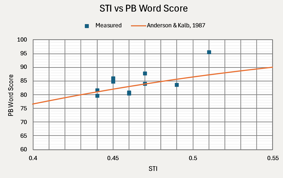 A A A Volume : 46 Part : 3 Proceedings of the Institute of Acoustics Word score vs. STI tests of a public address system in an underground train station platform O. Fong, Acoustic Directions, Australia C. Hanrahan-Tan, Acoustic Directions, Australia G. Leembruggen, Acoustic Directions, Australia 1 INTRODUCTION A mismatch was found by the authors between measured speech transmission index (STI) results using STIPA measurements and the STI derived from measured 1000-word phonetically-balanced scores on the platform areas of a new underground train station in Sydney. This paper presents the details and results of the testing that was undertaken on the platform and provides a discussion of the reasons that may have led to the difference in results between the measured STIPA values and those calculated from PB-word score relationships. The project specification required the intelligibility on the platforms to meet a minimum STI of 0.5 or Common Intelligibility Scale (CIS) rating of 0.7 as per Australian Standard AS 1670-4:20181. This level of intelligibility is required in areas that have a signal-to-noise ratio of 10 dB or more between the broadcast speech and the background ambient noise, and a reverberation time of less than 1.5 seconds. During the project’s commissioning phase, initial STIPA benchmarking on the platform area showed non-compliance with the project’s STI requirements and we were asked to assist with improvements. As the PA system was already installed, the system could only be optimised using equalisation and broadband level adjustments. Equalisation was undertaken to improve the perceived intelligibility and the STI in the presence of ambient noise. Although substantial equalisation, particularly at high frequencies can be used to maximise STI, the resulting tonal balance can actually degrade perceived intelligibility. As it was important to maintain natural voice tonality for listening comfort and perceived intelligibility, equalisation was undertaken to achieve these outcomes. Measurements made on the platforms after optimisation showed that the average STI was still unlikely to meet the project’s intelligibility requirements over the entire platform. This was due to a number of factors including i) the type of speaker used and their placement, ii) the restricted system architecture and rudimentary nature of the digital signal processing (DSP) and iii) architectural acoustics including limited sound absorption in the lateral direction and large parallel reflective surfaces. As conformance to the project’s specification was critical, the client suggested to attempt word score testing as an alternative method to demonstrate compliance. The phonetically-balanced-word (PB-word) score method using 1000 words was used to test for the percentage of words that was correctly heard. This percentage of correct words was then converted to its equivalent CIS and STI rating according to the conversion graph provided in AS 1670-4:2018, which is based on the original paper by Barnett & Knight2. The CIS and STI results obtained through PB-word scores complied with the project requirements. Letowski and Scharine3 provides a comprehensive discussion of various word and sentence tests and conclude that the phonetically balanced words are the most accurate of all the standardized tests and is recommended for use when high data accuracy and sensitivity are required. 2 TEST METHOD 2.1 Word Score Testing Word score testing was undertaken on two separate days in June and July 2024. As the station staff were busy preparing for handover and test trains were running, the listening test had to work around these intrusions. The test process broadly adopted the requirements provided in standard ANSI/ASA S3.2-20204 relating to the setup and administration of a word score test. In particular, this included the acoustic conditions at talker location, acoustic conditions at listener location, spoken test materials, and the selection and training of talkers to record the lists as per Section 6 and 7 of the ANSI/ASA standard. Using professional recording equipment, an experienced male voice-artist with an Australian accent recorded twenty lists of fifty phonetically-balanced words in a suitable recording studio. A carrier phrase (“Please write the word…”) preceded each test word and a seven second gap was provided between sentences. This gap allowed test subjects to write down the word and minimise cross-talk between sentences in the platform’s acoustic environment. The use of a single voice-artist as talker is a deviation from the recommendations in ANSI/ASA S3.2-2020, which recommends a minimum of five talkers. The use of only one talker would likely reduce the repeatability of the results. However, as the testing was undertaken as part of a commercial project, the engagement of an additional four voice artists would be costly and there was no requirement to repeat the test. Forty-seven test positions were marked out along the ground to cover the entire platform area, These test positions remained identical across both test days. At each location, the word score was calculated by counting the total correctly-identified words over the two days and dividing them by the total number of presented words. The measured spatially-averaged ambient noise level on the platform was 61 dB (LAeq) and the broadcast speech level was approximately 76 dB to 80 dB (LAeq) during testing. These levels were measured as a spatial average of approximately one quarter of the platform area. The pre-recorded word lists were preloaded to the station’s PA system and broadcast from the Station Masters Room to the loudspeakers serving the platform area. There was no contractual requirement to assess the STI with the tunnel ventilation system (TVS) operating, however word score tests conducted at ten positions with the TVS operating showed little change from the no TVS state. The selection of test subjects generally fo