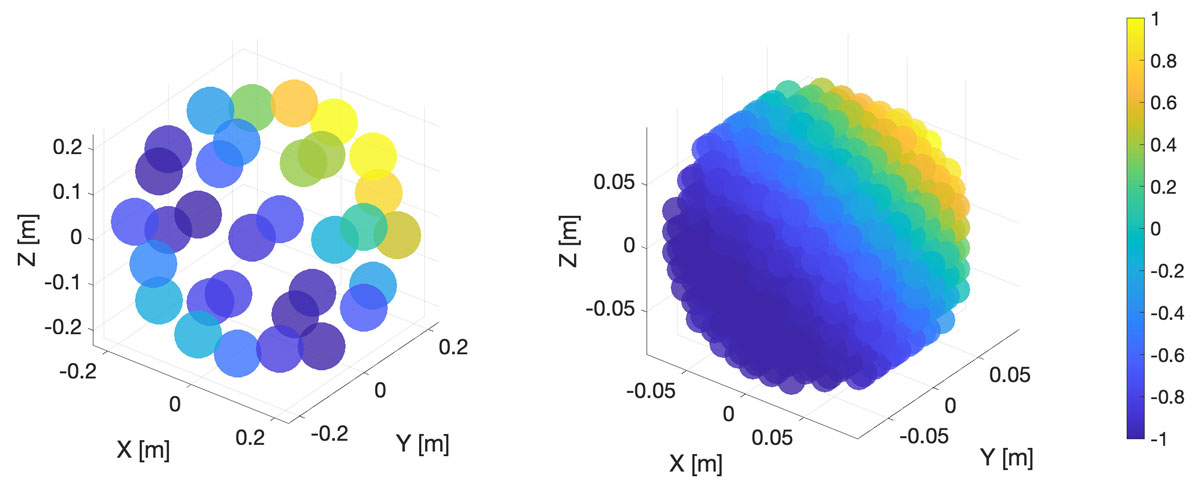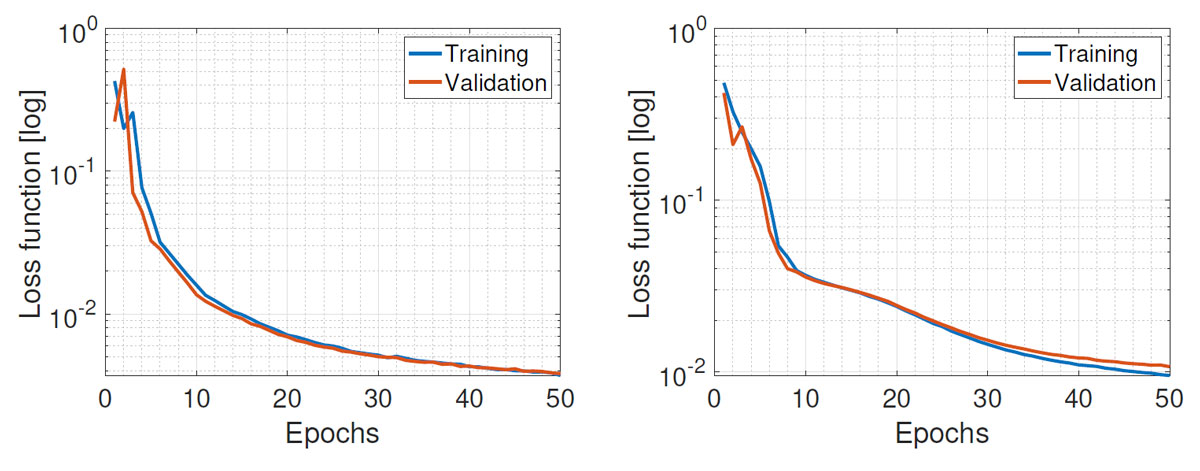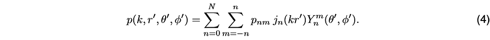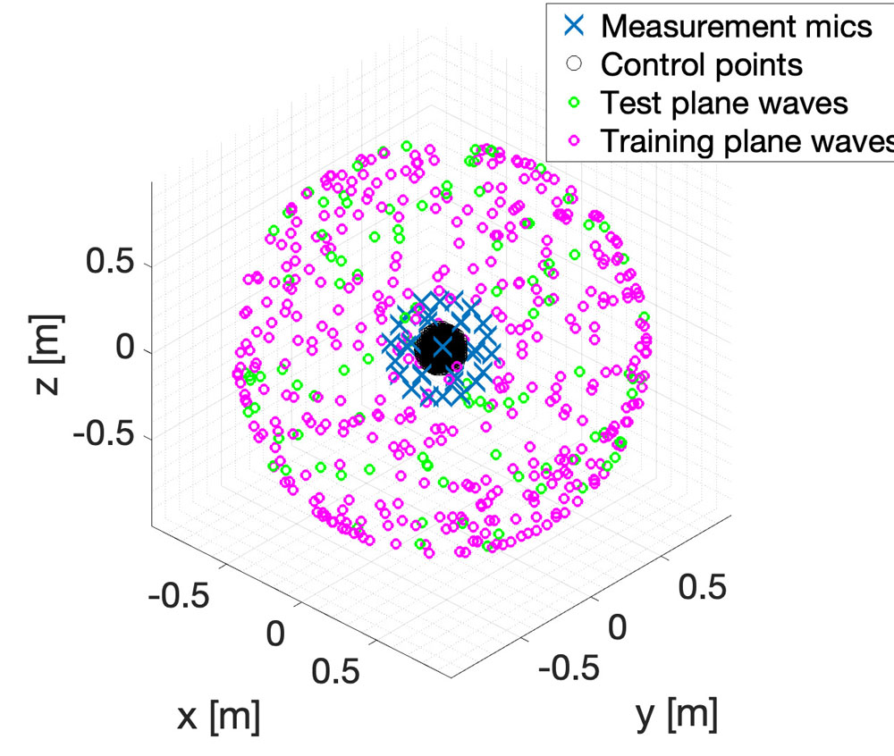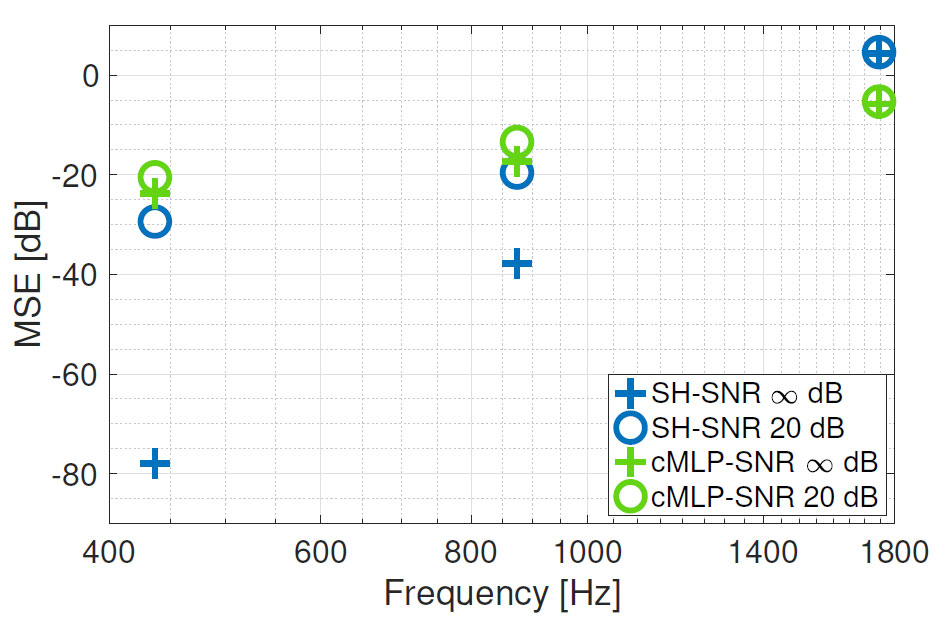 A A A Volume : 46 Part : 3 Proceedings of the Institute of Acoustics Sound field analysis using a complex-valued neural network Vlad S. Paul, Institute of Sound and Vibration Research, University of Southampton, UK Nara Hahn, Institute of Sound and Vibration Research, University of Southampton, UK Philip A. Nelson, Institute of Sound and Vibration Research, University of Southampton, UK 1 INTRODUCTION Virtual sensing refers to the estimation of a sound field at locations where physical sensors are not present. For example, the sound field can be predicted around the listeners head, where direct measurements might be impractical or cumbersome. This is usually achieved using data from existing microphones and mathematical models that describe the acoustic wave propagation. Related signal processing algorithms have been developed for various applications such as active noise control (ANC)1,2, sound field reconstruction3,4 or beamforming5,6. More recently, machine learning approaches have been developed to estimate the sound field at virtual sensors7,8. In this paper7, the authors use generative adversial networks (GANs) to reconstruct spatial room impulses in conventional rooms and show that they can use GANs to enhance the sound field reconstruction performance by recovering some of the energy at high frequencies. This information at high frequencies is usually lost or distorted, due to the Nyquist criterion that requires a fine spatial sampling of microphones to represent the rapid variations of the sound field that occur at high frequencies. Traditional methods based for example on spherical harmonic expansion struggle to accurately reconstruct sound fields at frequencies above this aliasing threshold due to spatial aliasing and truncation errors. Various approaches have been developed throughout the years to increase the aliasing-free bandwidth using optimal spatial sampling strategies9,10 or signal processing techniques such as compressive sensing11. More recently, neural network architectures have been shown to partly overcome spatial aliasing at high frequencies for different applications7,12. Compared to traditional methods, these authors show that machine learning models can achieve a higher sound field reconstruction performance by improving the recovery of high frequency information, that would otherwise be lost. In this work, a simple complex-valued multilayer perceptron (cMLP) is used to learn statistically the spatio-spectral properties of single frequency plane waves from various directions recorded by a microphone array on the surface of an open sphere. The network model is trained to predict these sound fields at control points in a sphere of a smaller radius across a range of frequencies, including those above the aliasing frequency. 2 SOUND FIELD RECONSTRUCTION USING SPHERICAL HAR MONICS 2.1 Problem description In this work, the task considered is the prediction of the sound pressure at a set of control points densely distributed throughout a sphere of radius rctl = 0.1 m, similar to the size of the human head. The available data from which the predictions are made consists of pressure computed using a larger open spherical microphone array with radius rm = 0.25 m. The open sphere microphone array was simulated using 32 sensors on the surface of the sphere positioned at the same locations as those of an Eigenmike em3213. Assuming a maximum spherical harmonic order of N = 4, that follows from the array’s spatial sampling limitations, the aliasing frequency above which the array will struggle to capture and represent accurately the sound field is given by where c = 343 m/s is the speed of sound. Above falias, spatial aliasing occurs, which means that the spatial sampling of microphones on the sphere is insufficient to capture the spatial variations of the sound field at higher frequencies. One of the main challenges of this task is the reconstruction of the sound field at frequencies above falias, where spatial aliasing degrades the reconstruction accuracy. In addition, as discussed in the next section, issues related to the zeros of the spherical Bessel functions at specific frequencies might introduce numerical instabilities. To address these challenges, a complex-valued network model is investigated as an alternative approach for sound field reconstruction. 2.2 Spherical harmonics-based sound field reconstruction Assuming a source-free and homogeneous medium, the pressure p(k, r) at a general point r = (r, θ, ϕ) can be computed using the spherical harmonic expansion of the solution to the Helmholtz equation10 as: where n, m are the degree and order of the spherical harmonics, respectively, k denotes the frequency dependent wavenumber and pnm are the modal coefficients that are independent of r and represent the amplitude of each spherical harmonic mode in the sound field. The term jn(kr) is the spherical Bessel function of the first kind of order n evaluated at kr and are the spherical harmonic functions. Using the pressure p(k, r, θ, ϕ), one can compute the modal coefficients pnm by first computing the spherical Fourier transform coefficients which are radially dependent and then remove the radial dependency to isolate the modal coefficients . Once the modal coefficients are known, the pressure at any other point r′ = (r′, θ′, ϕ′) can be reconstructed from 2.3 Limitations of the use of spherical harmonics Using this approach, one can estimate the pressure at different points in the sound field, however several limitations occur. First, when the radial dependency is removed, the division by jn(kr) can lead to numerical instabilities when jn(kr) = 0. The zeros in the spherical Bessel functions are frequency- and radius-dependent and can therefore impact the reconstruction of the pressure at certain frequencies for a fixed radius. A second limitation has been discussed above and is related to spatial aliasing. For example, if p(k, r, θ, ϕ) contains distor
