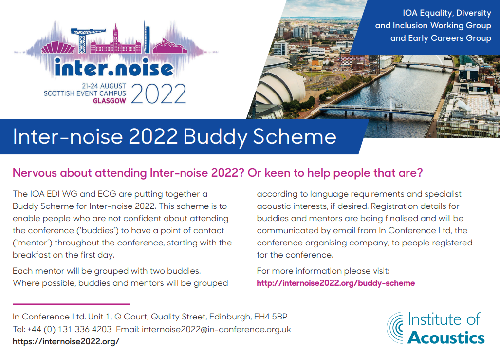 The IOA EDI WG and ECG are putting together a Buddy Scheme for Inter-noise 2022. This scheme is to enable people who are not confident about attending the conference (‘buddies’) to have a point of contact (‘mentor’) throughout the conference, starting with the breakfast on the first day.